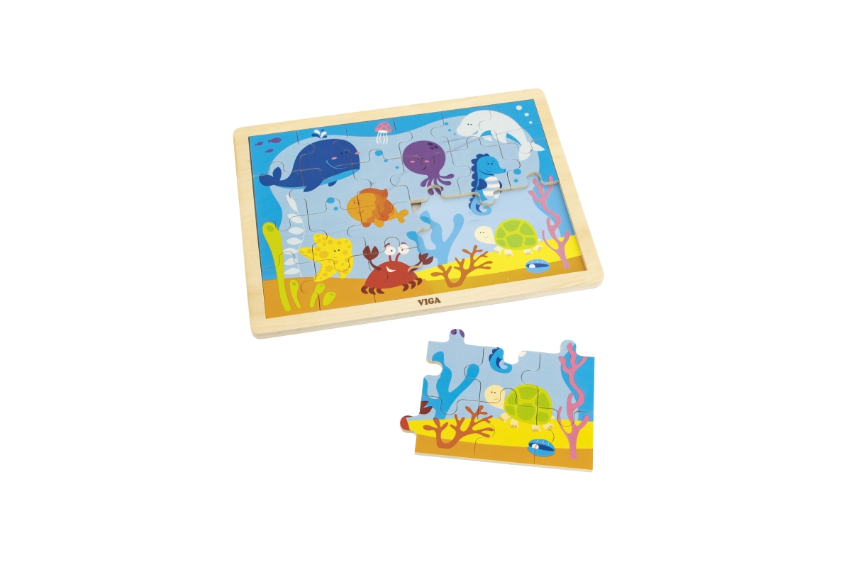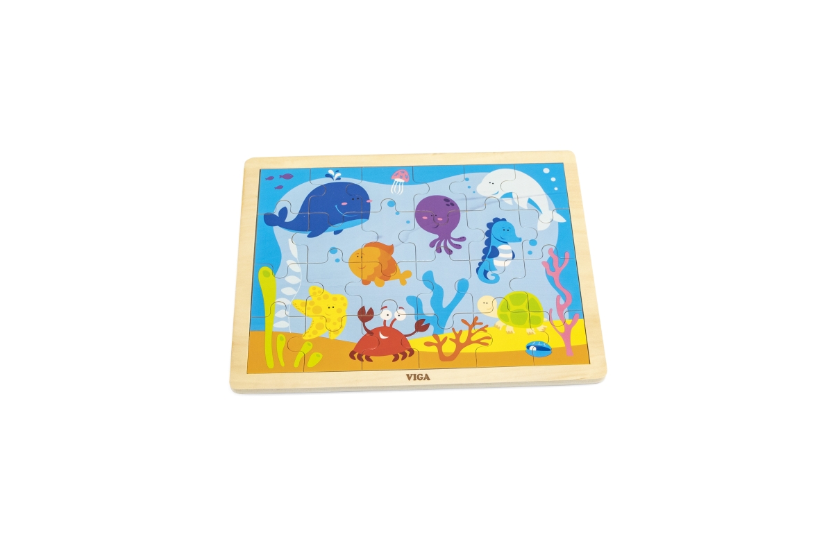 Veselé dřevěné puzzle s motivem podmořského světa. Obsahuje 24 dílků. Rozměry desky cca 30x22x1 cm. Velikost 1 dílku cca 5 cm. Věk 2+..