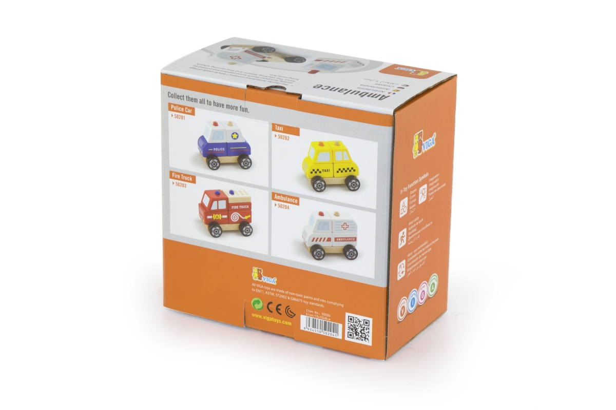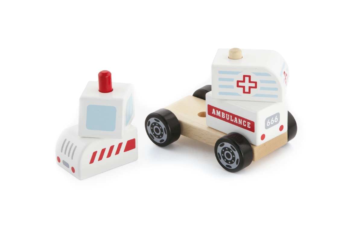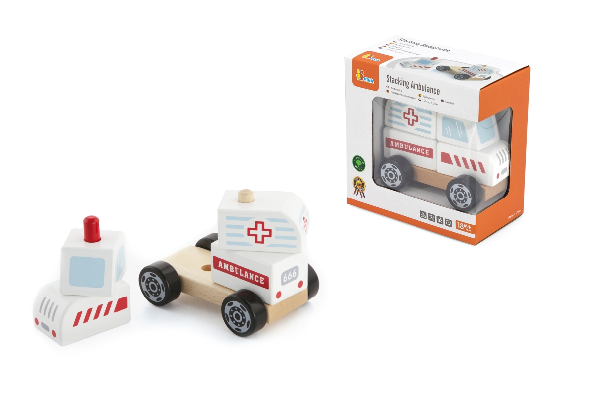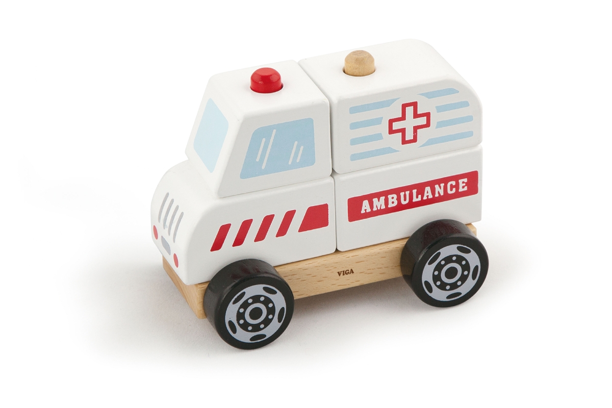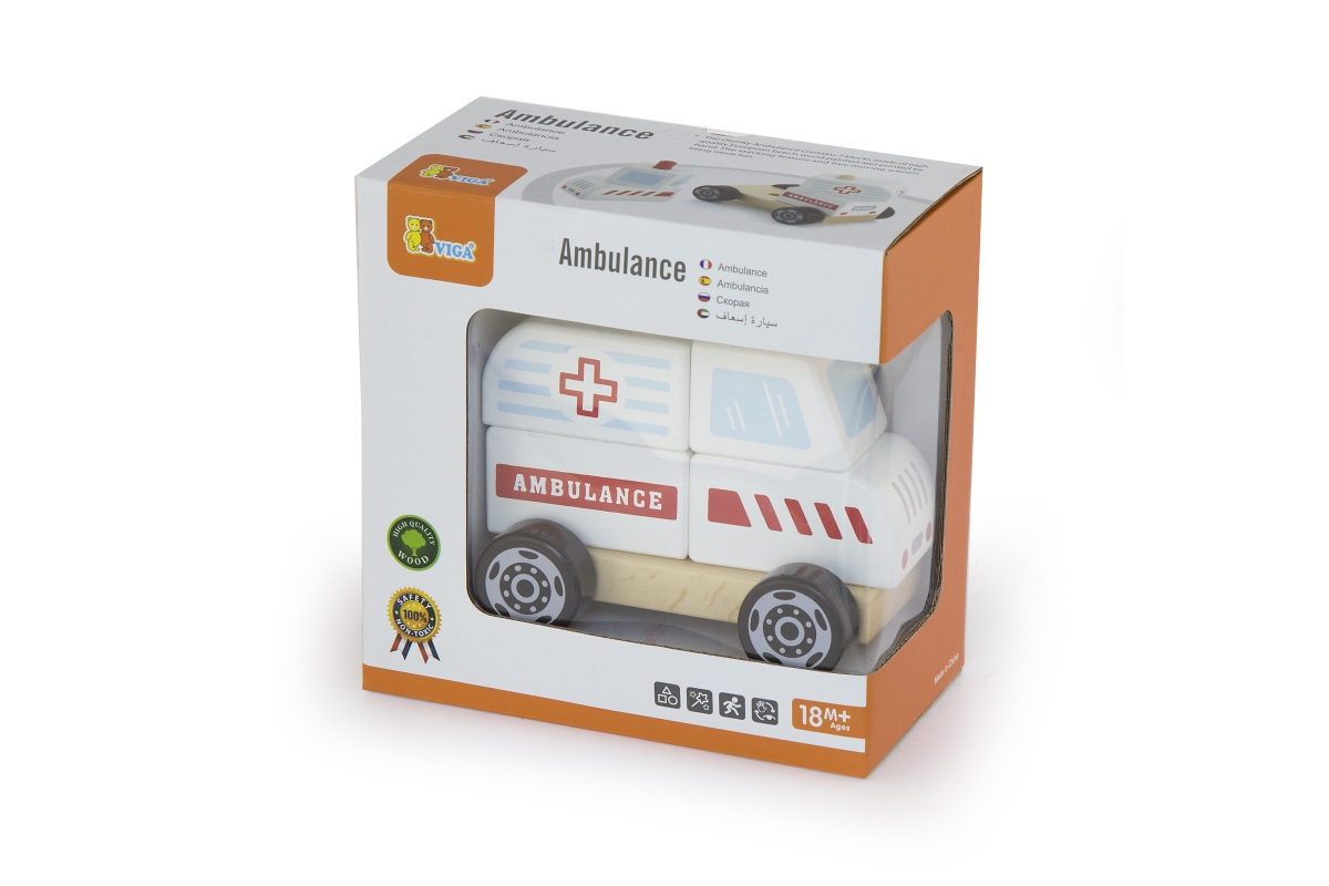 Dřevěná skládačka ambulance o rozměru cca 12,5 x 10 x 8 cm. Rozměry balení cca 16 x 16 x 9 cm. Věk 18m+..