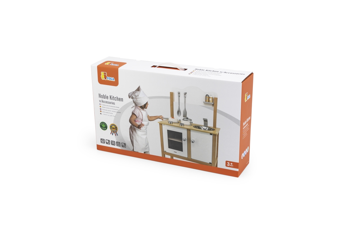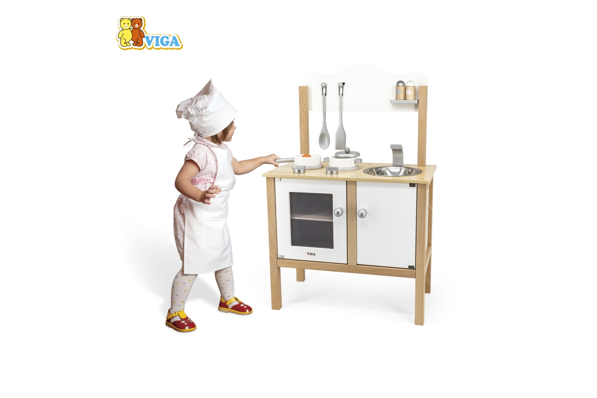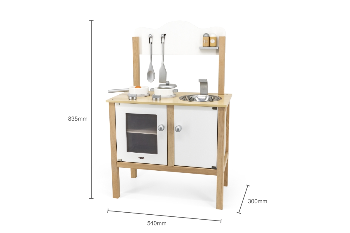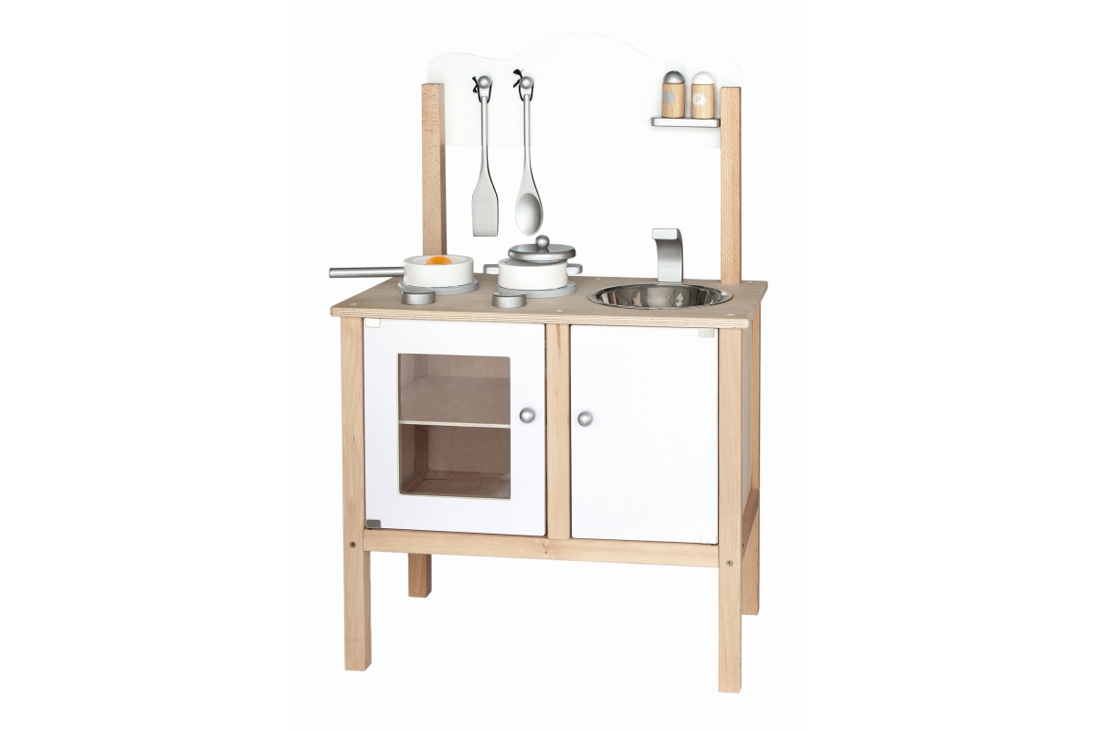 Dřevěná kuchyňka se sporákem, skříňkou a dřezem. Součástí je nádobí a doplňky. Rozměry kuchyňky cca 54 x 83,5 x 30 cm. Rozměry balení cca 56 x 33 x 1..