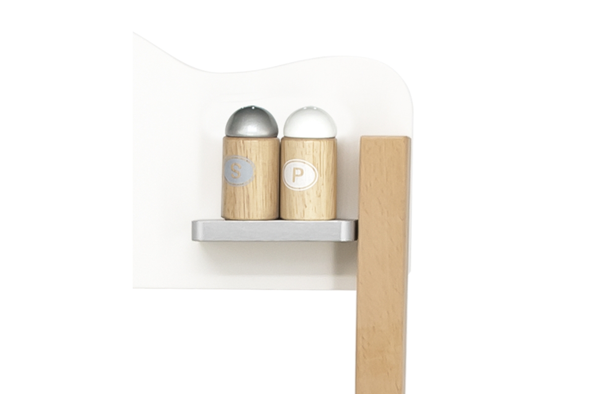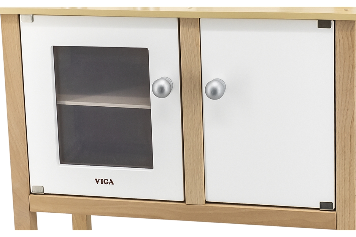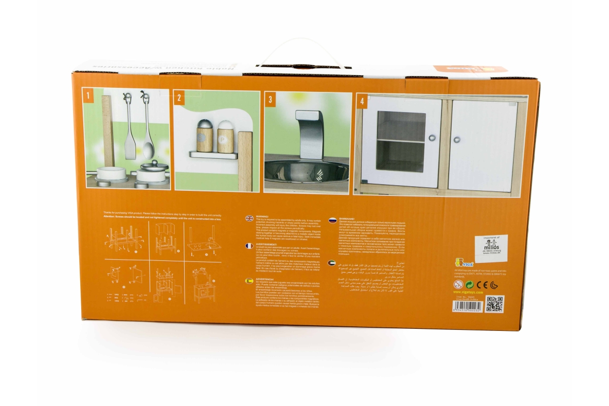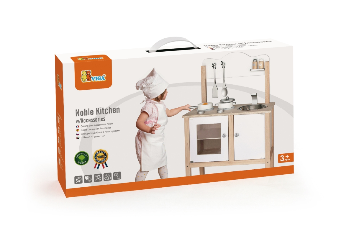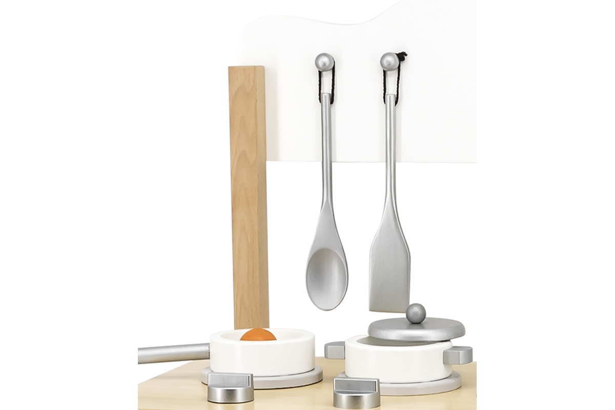 Dřevěná kuchyňka se sporákem, skříňkou a dřezem. Součástí je nádobí a doplňky. Rozměry kuchyňky cca 54 x 83,5 x 30 cm. Rozměry balení cca 56 x 33 x 1..