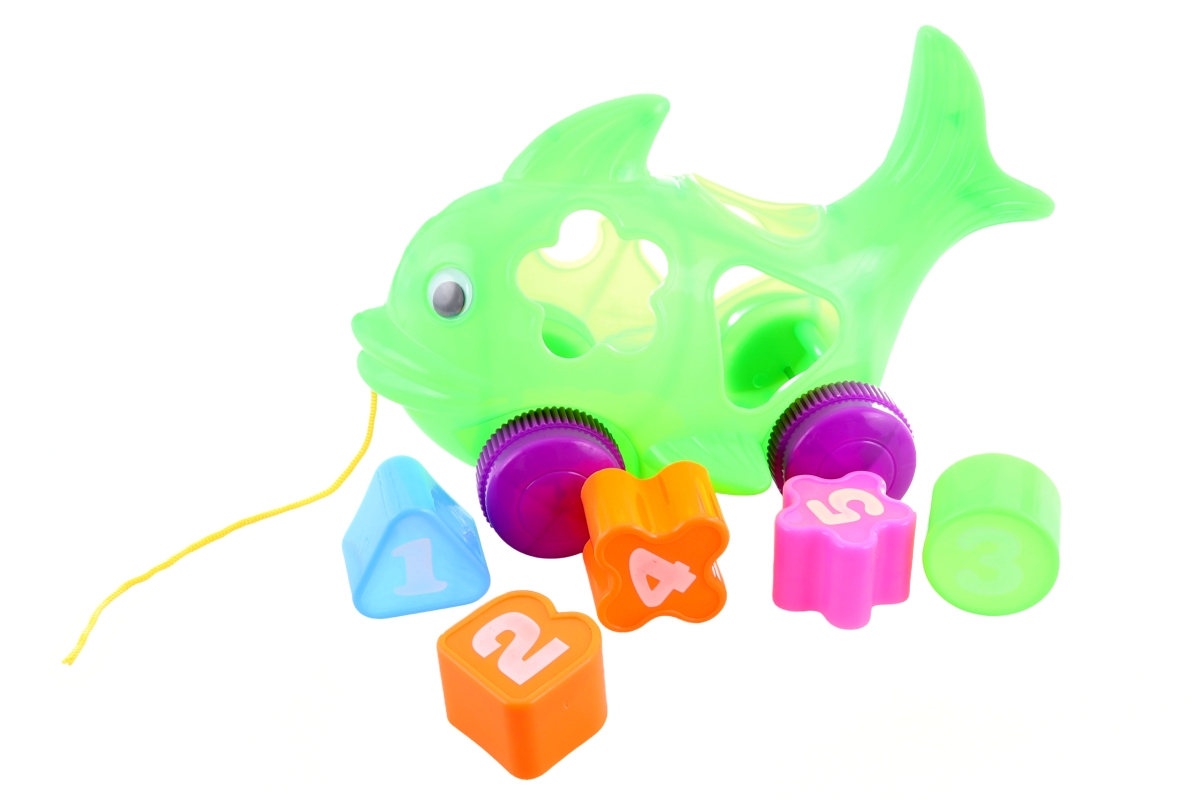 Vkládačka rybka na kolečkách (volný chod). Materiál plast. Sada obsahuje 5 kostiček různých tvarů ke vkládání. Baleno v síťce. Rozměry 25x17x11,5 cm. ..