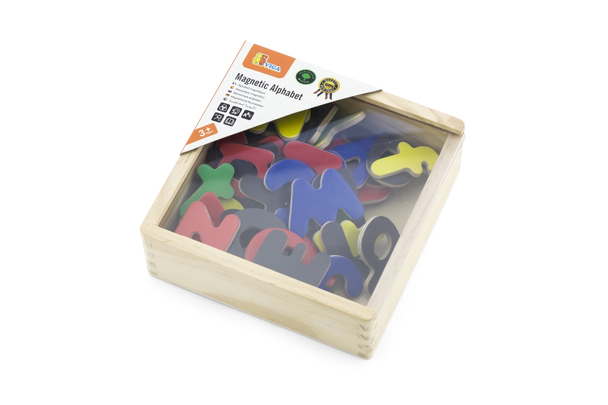 Dřevěná magnetická písmena v praktické dřevěné krabičce. Balení obsahuje 52 dílků. Rozměry balení cca 14,5 x 14,5 x 5 cm. Věk 3+..