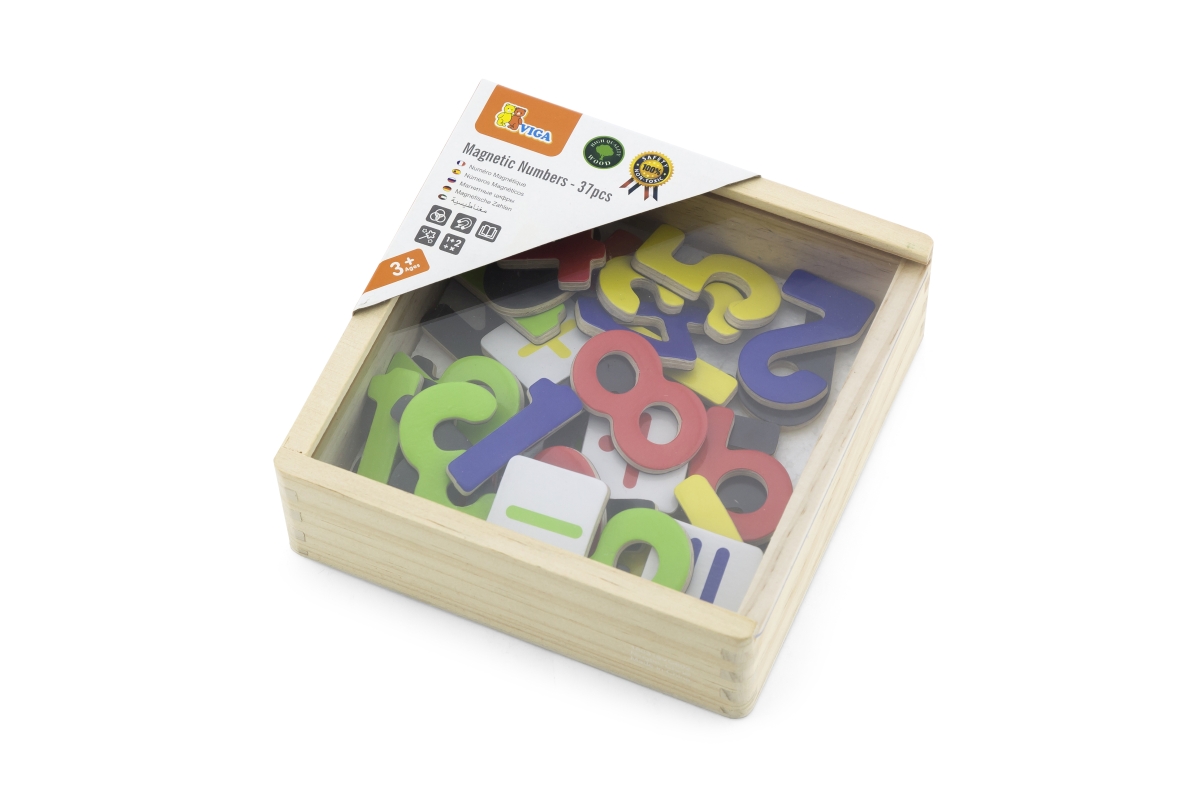 Dřevěná magnetická čísla v praktické dřevěné krabičce. Balení obsahuje 37 dílků. Rozměry balení cca 14,5 x 14,5 x 5 cm. Věk 3+..