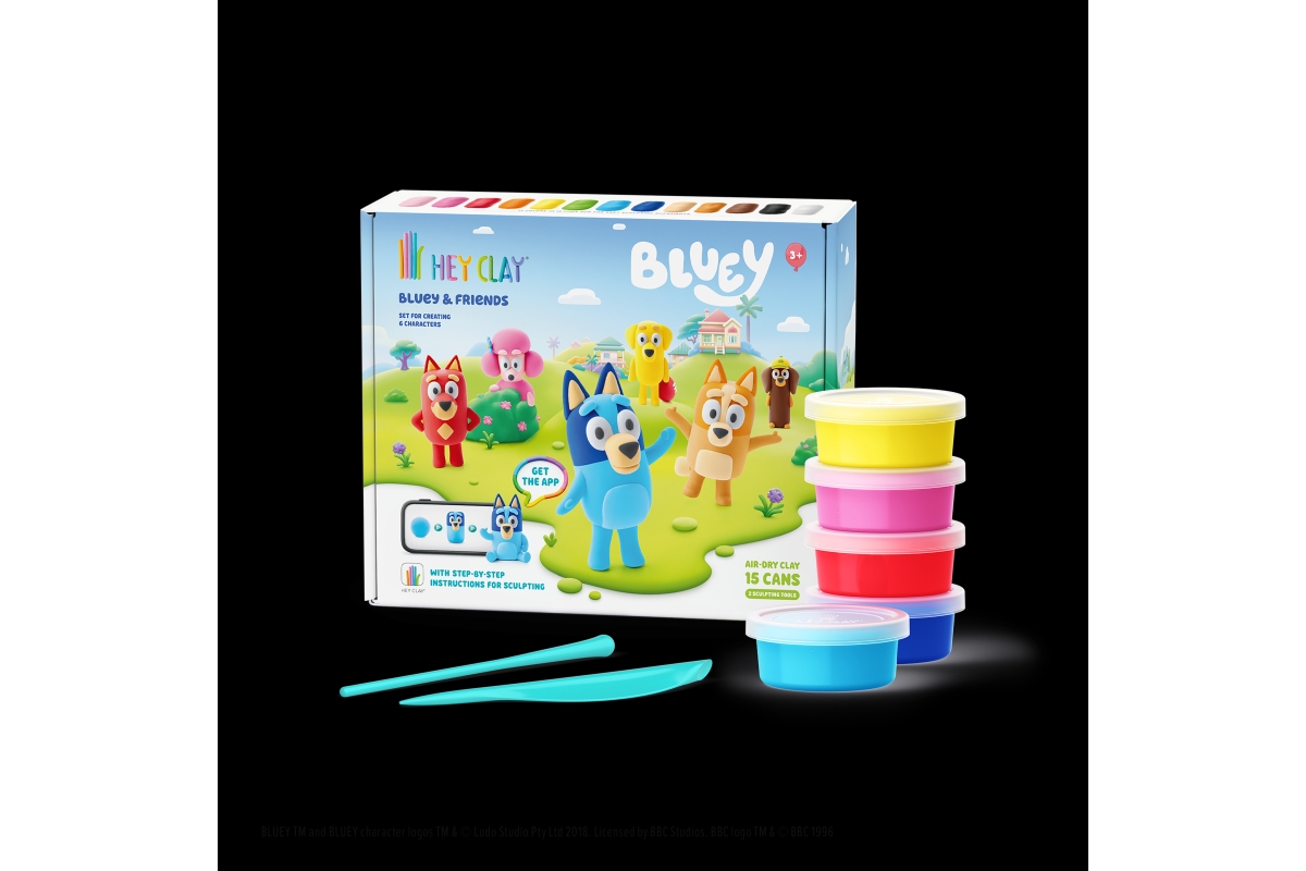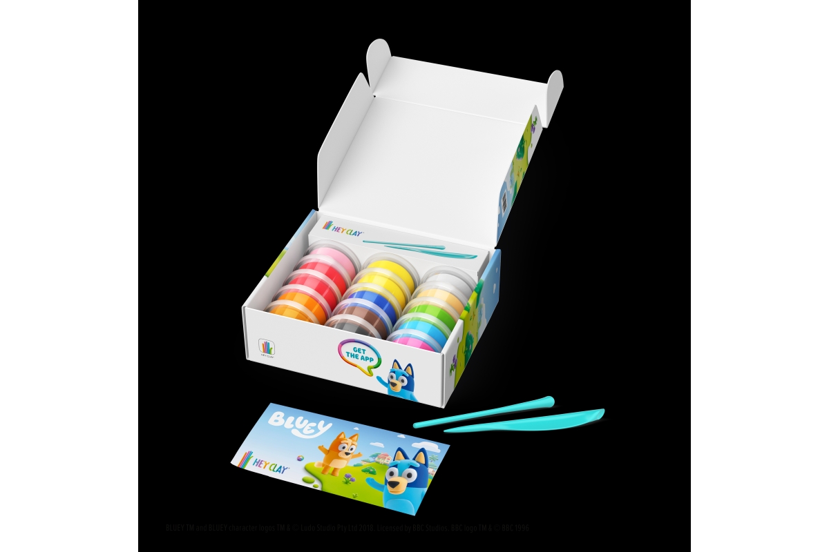 Sada HEY CLAY inspirovaná postavičkami z populární série Bluey! Velká sada 15 kelímků + 2 modelovací nástroje. Ze sady sestavit 6 postav. Věk 3+..