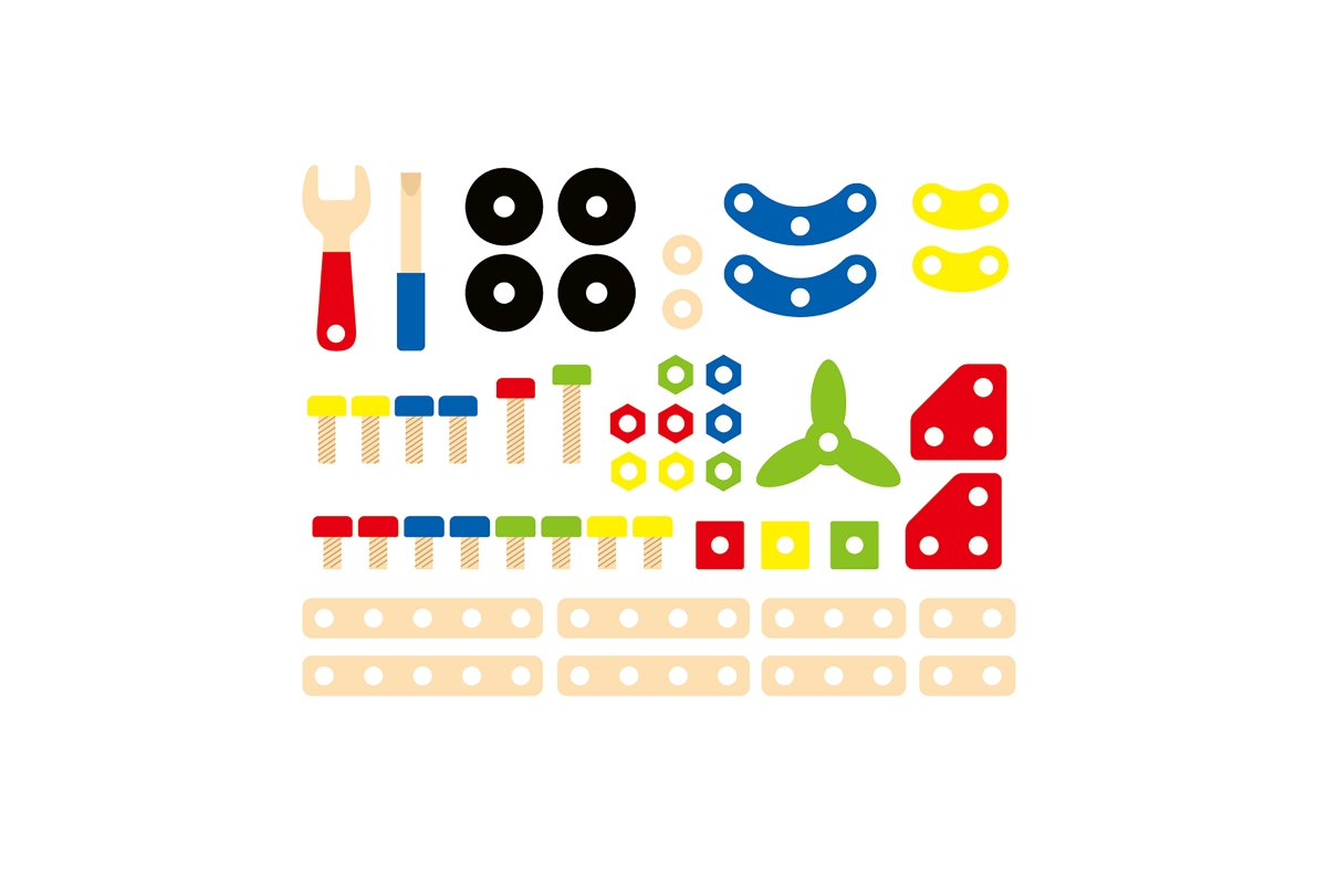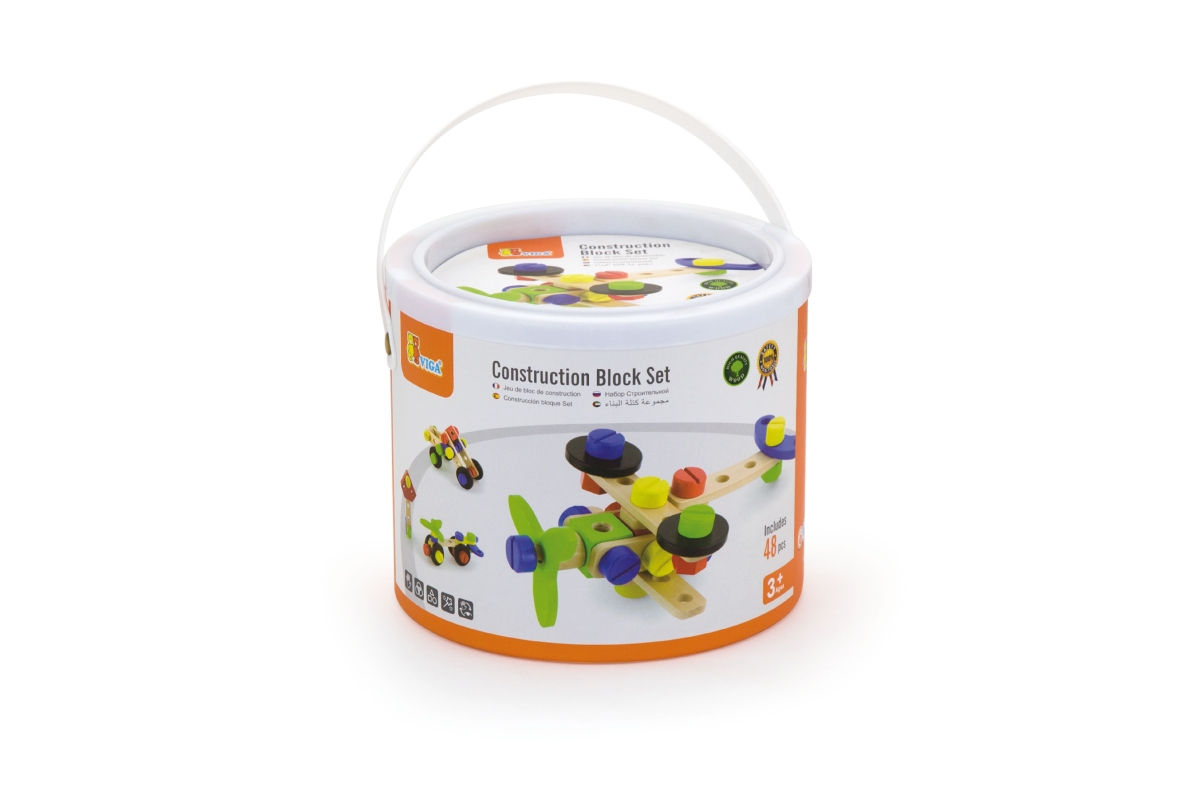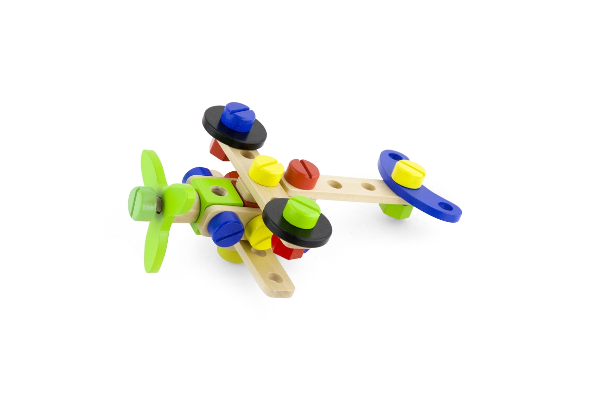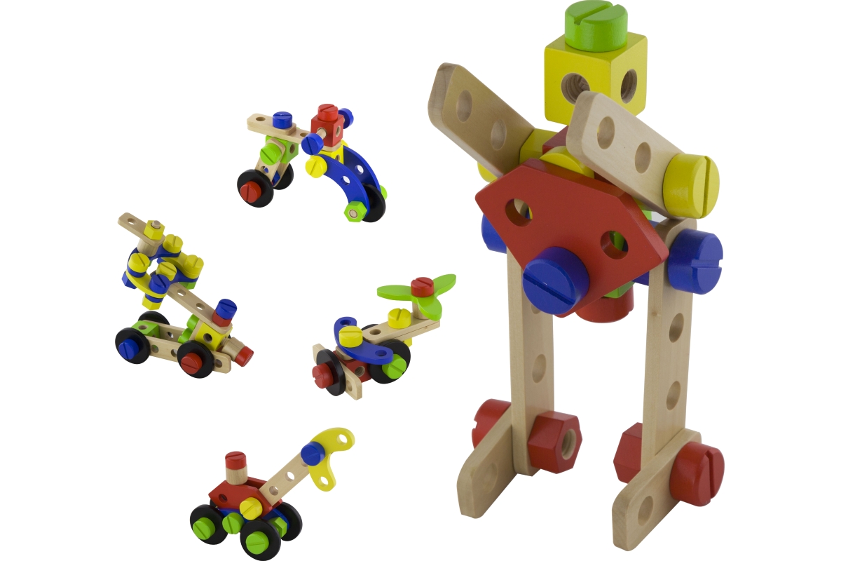 Dřevěná stavebnice konstruktér v kyblíku. Obsahuje 48 dílků a obrázkovou brožuru s návody na stavění. Rozměry balení cca 18 x 15 cm. Věk 3+..