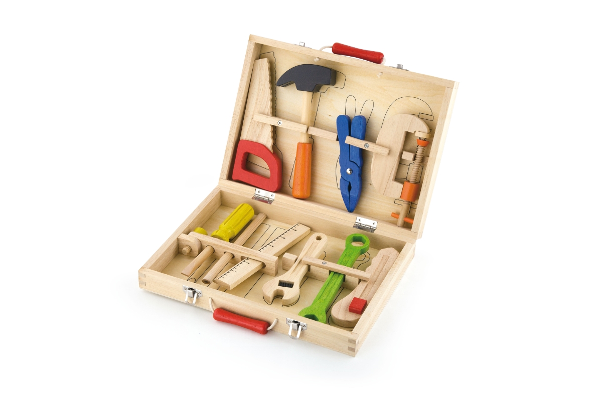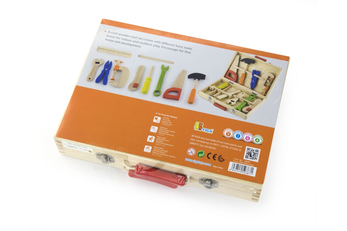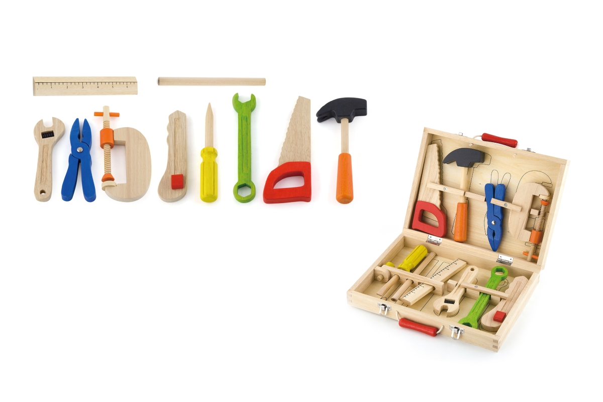 Dřevěné nářadí baleno v praktickém dřevěném kufříku. Balení obsahuje celkem 10 druhů nářadí (kladivo, pilka, klíč, šroubovák a další). Rozměry balení ..