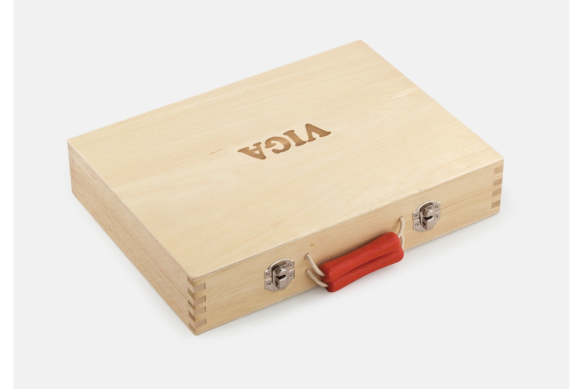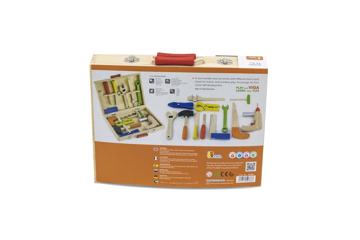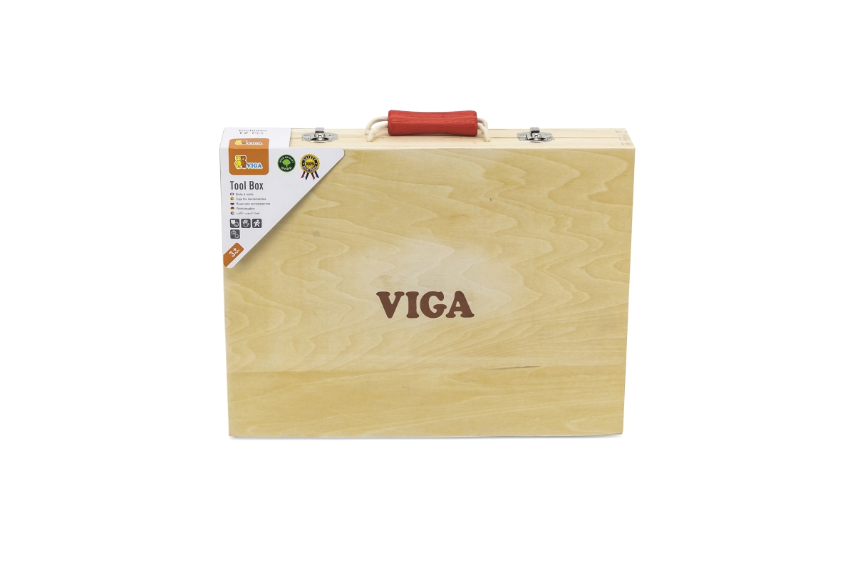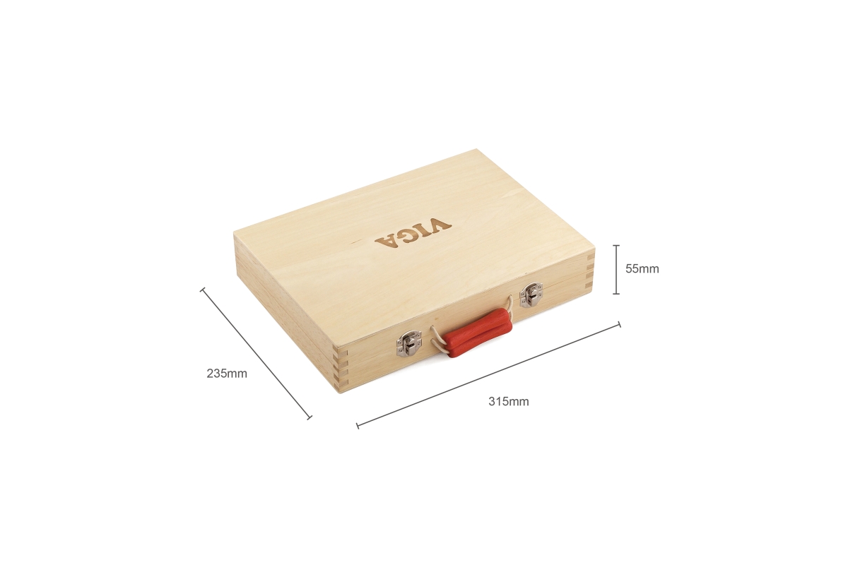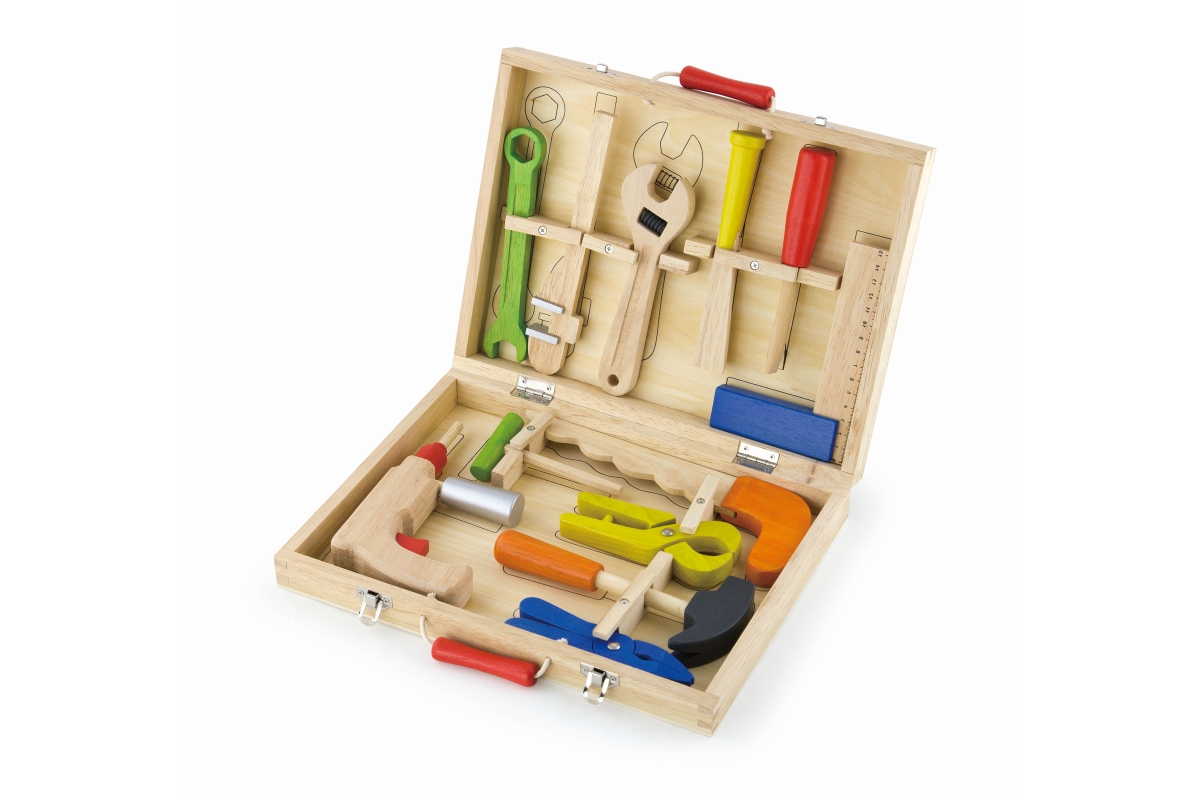 Dřevěné nářadí baleno v praktickém dřevěném kufříku. Balení obsahuje celkem 12 druhů nářadí (vrtačka, kladivo, pilka, klíč, šroubovák a další). Rozměr..