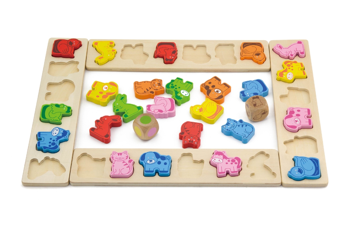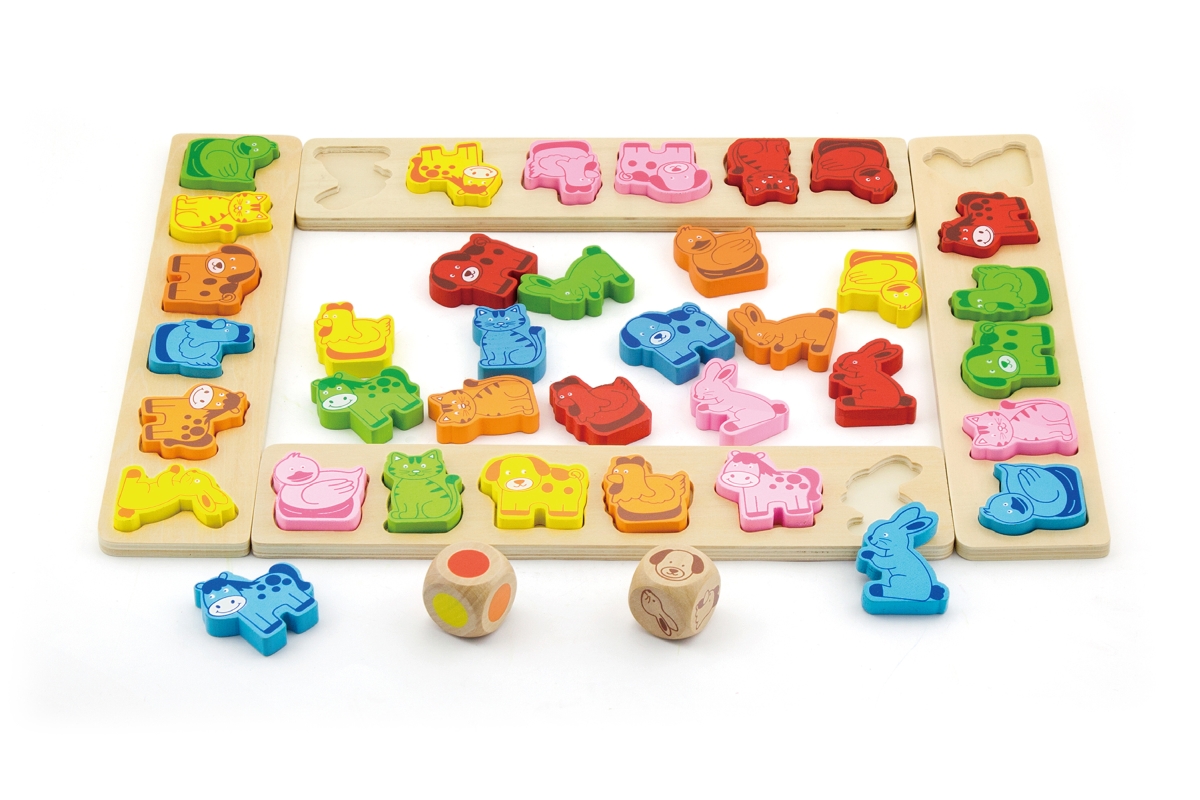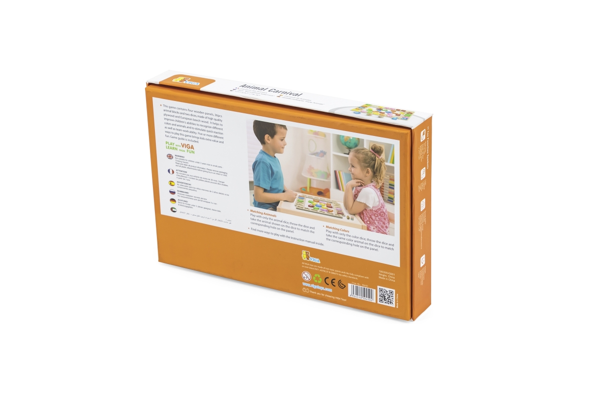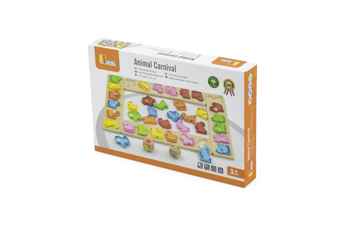 Dřevěná hra karneval zvířátek. Balení obsahuje 4 vzorové desky, 36 zvířecích tvarů, 1 zvířecí kostku a 1 barevnou kostku, vše je vyrobeno z vysoce kva..