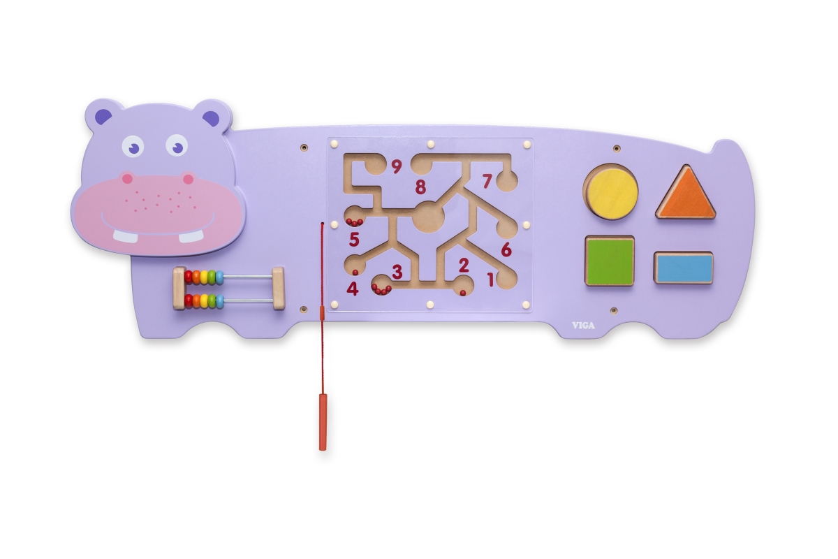 Dřevěná nástěnná hra s motivem hrocha. Velikost cca 91 x 32 x 4,5 cm. Rozměry balení cca 35,5 x 94 x 6 cm. Věk 18m+..