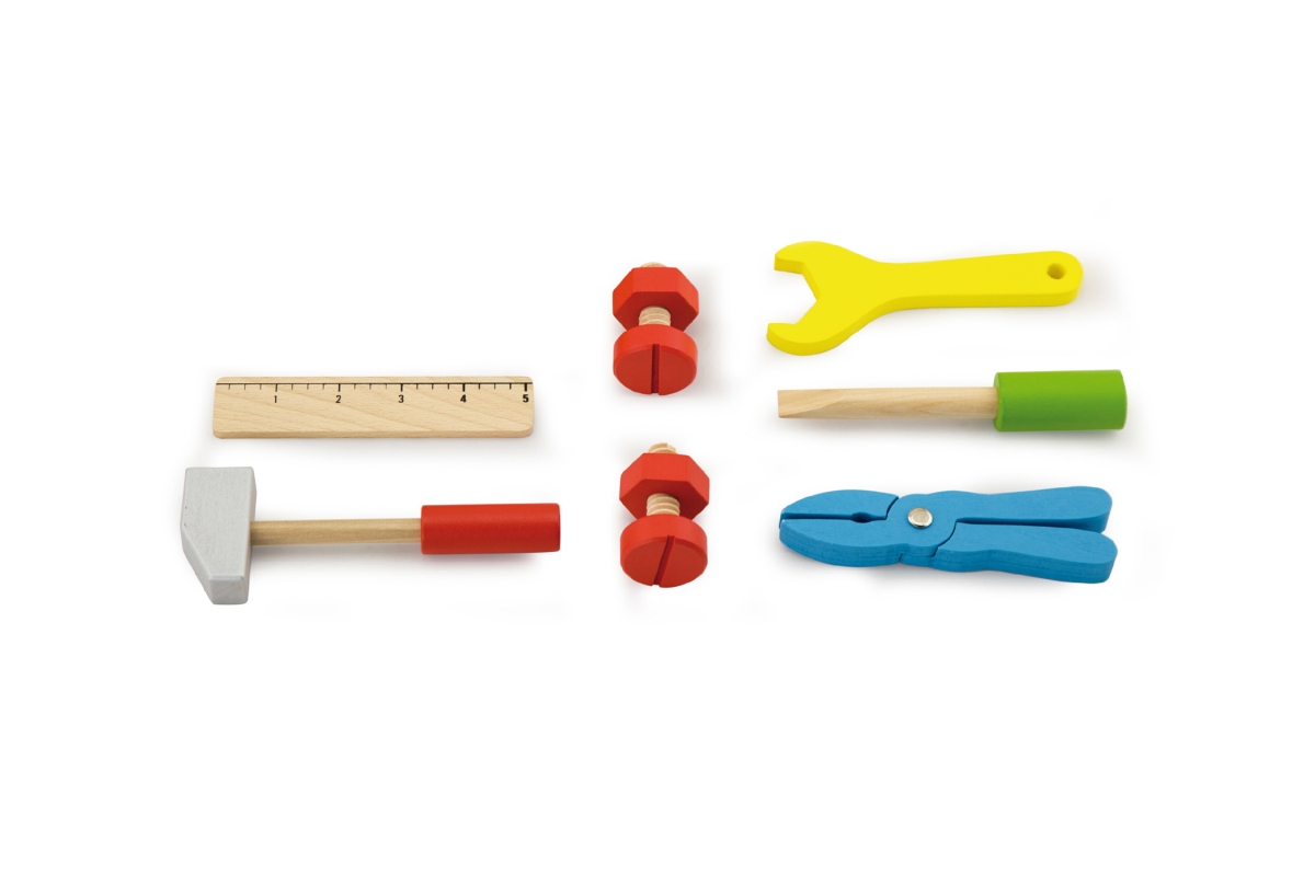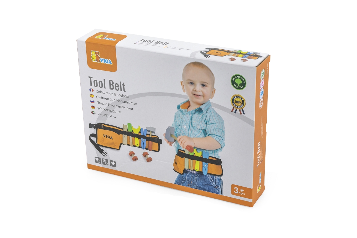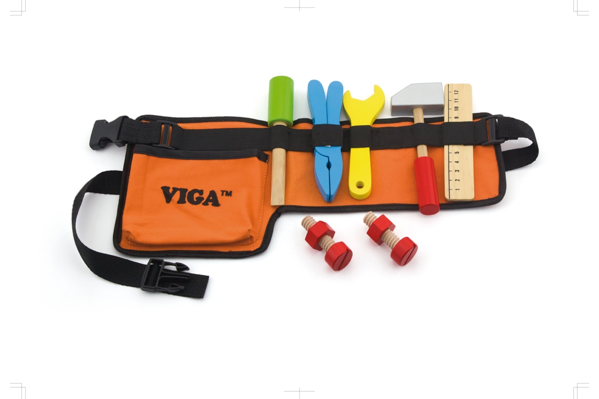 Opasek s dřevěným nářadím (obsahuje kladívko, klíč, šroubovák, metr, šroubky a matice, kleště). Rozměry opasku cca 36 x 18 x 2,5 cm. Rozměry balení cc..