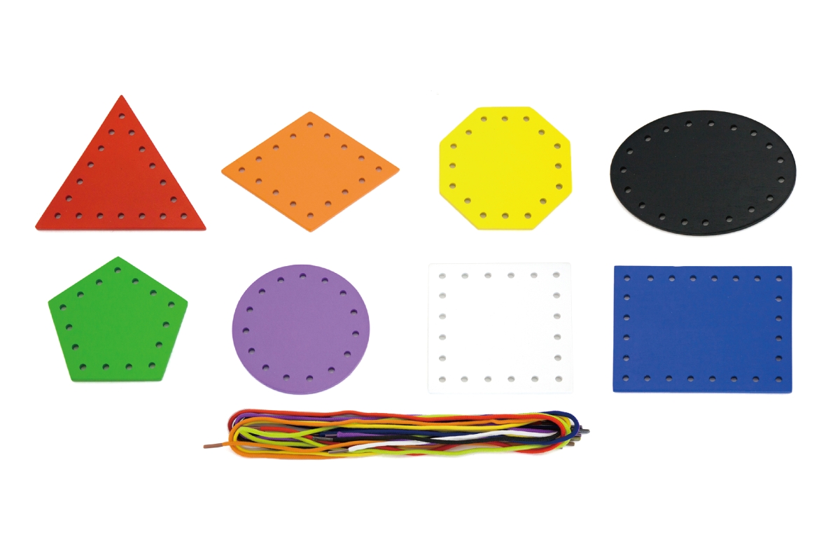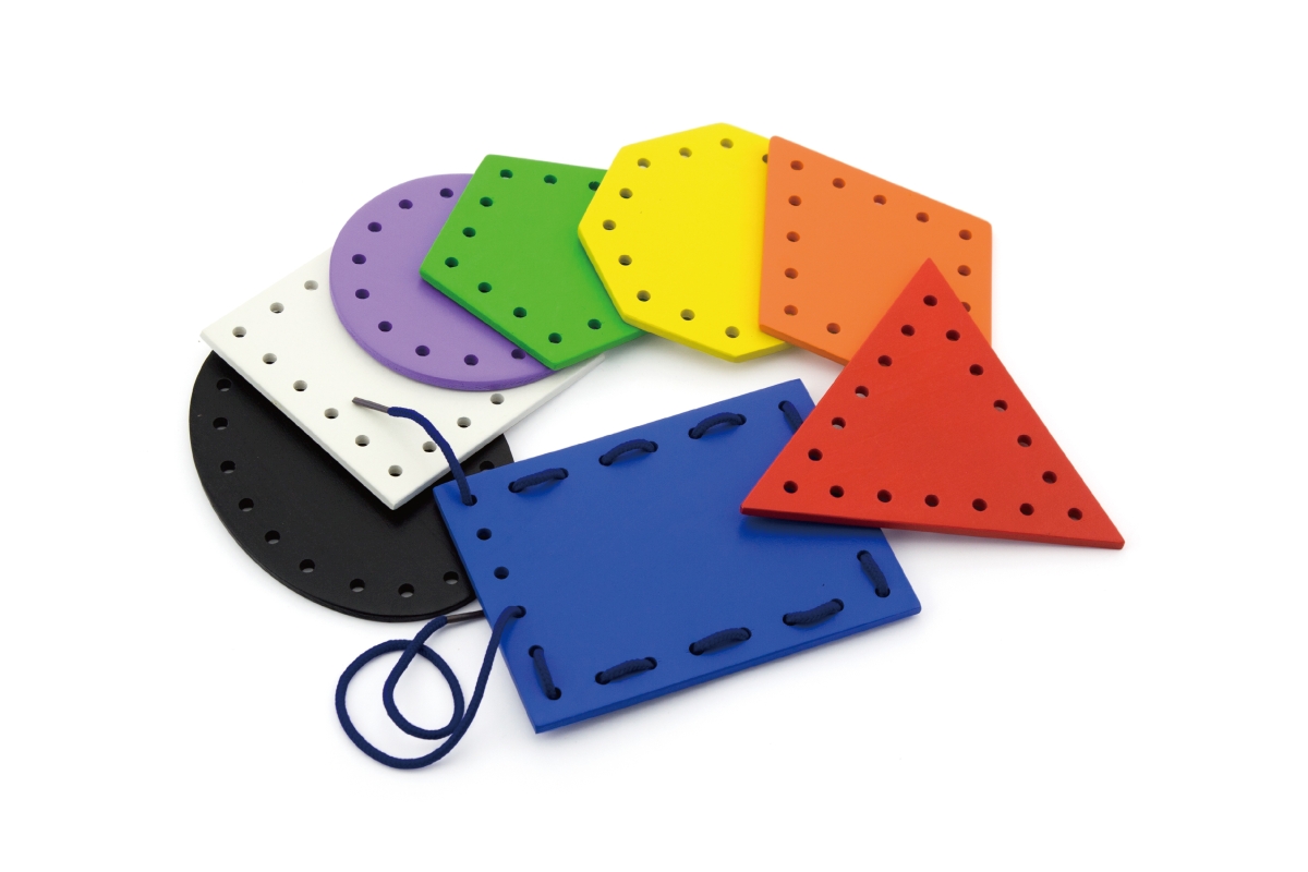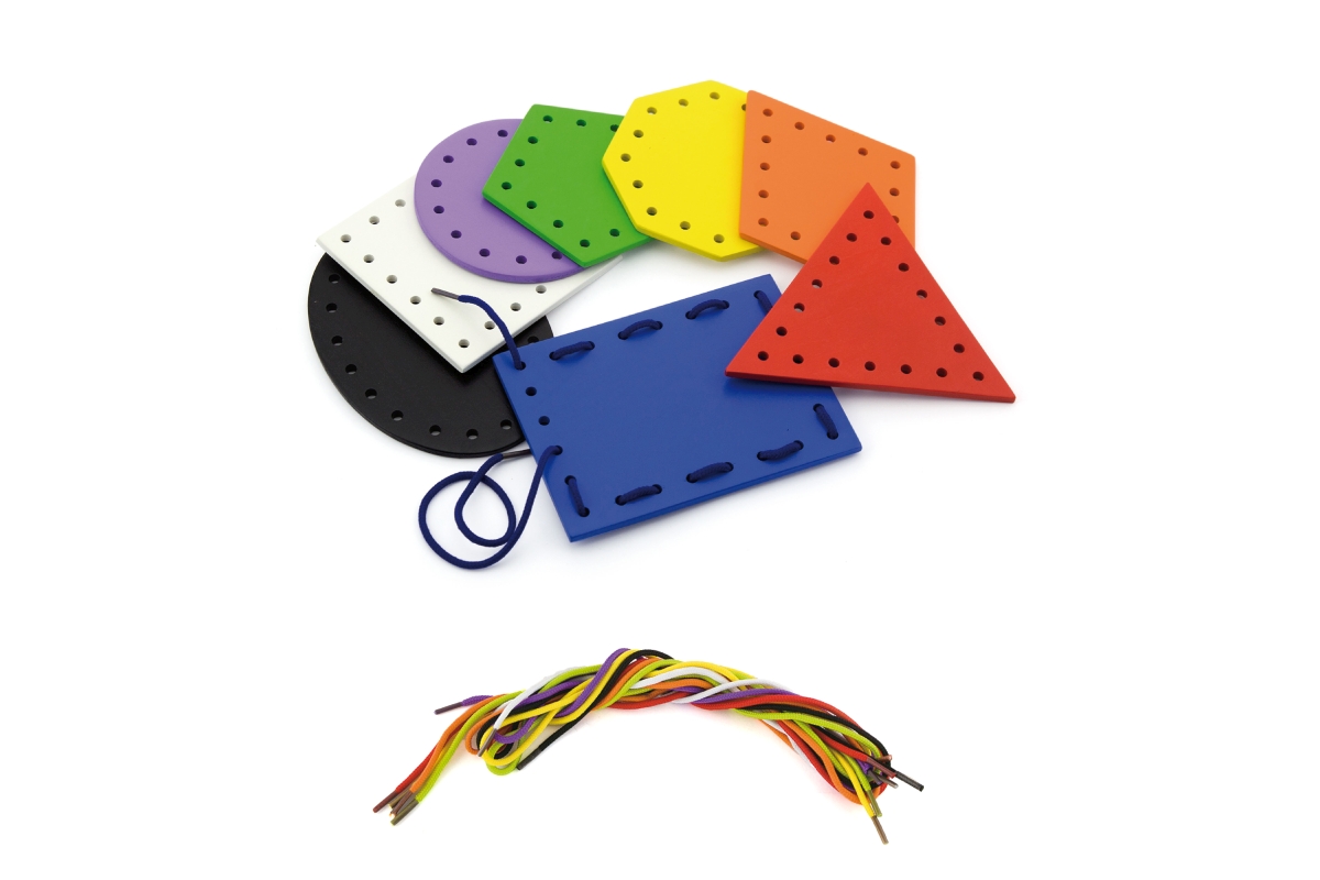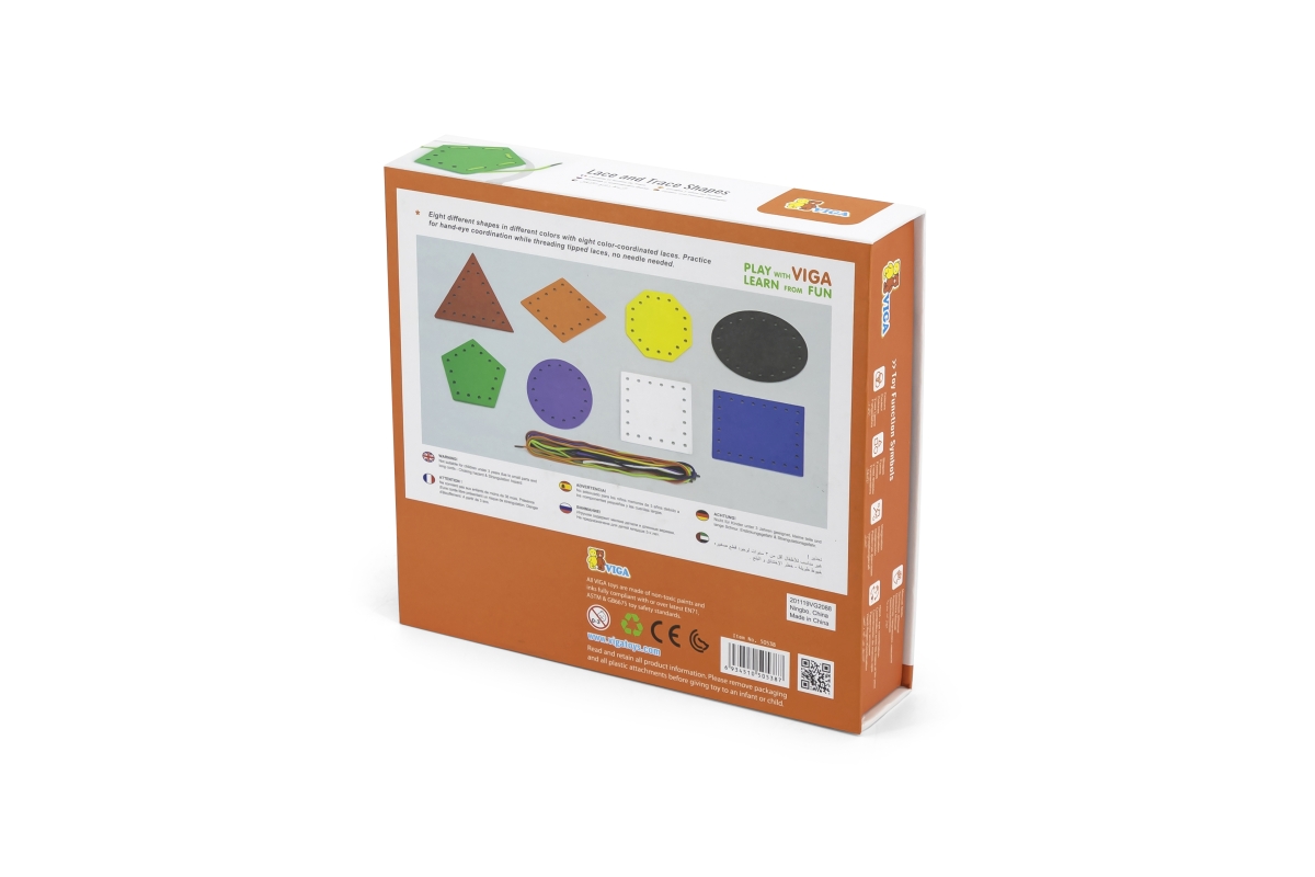 Dřevěné provlékání tvarů. Balení obsahuje 8 destiček s tvary a tkaničky. Rozměry balení cca 20,5x19x4,5 cm. Věk 3+..