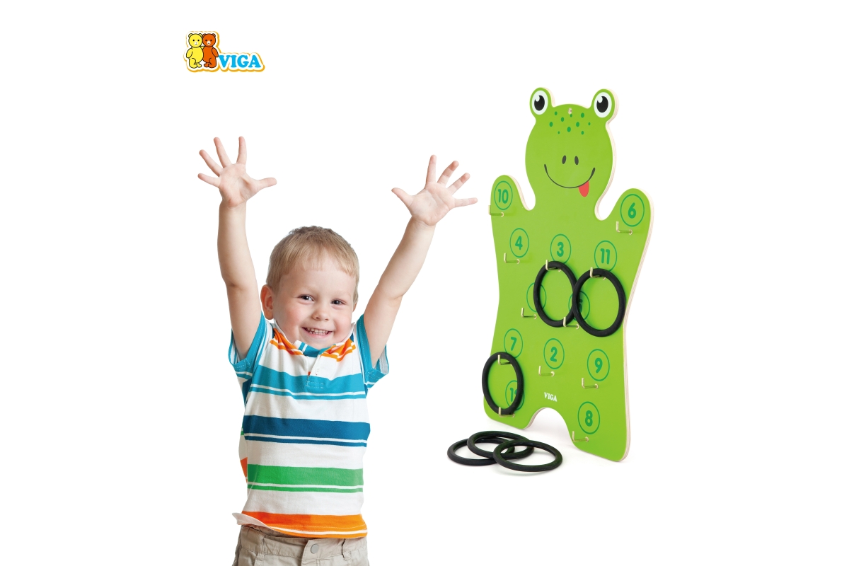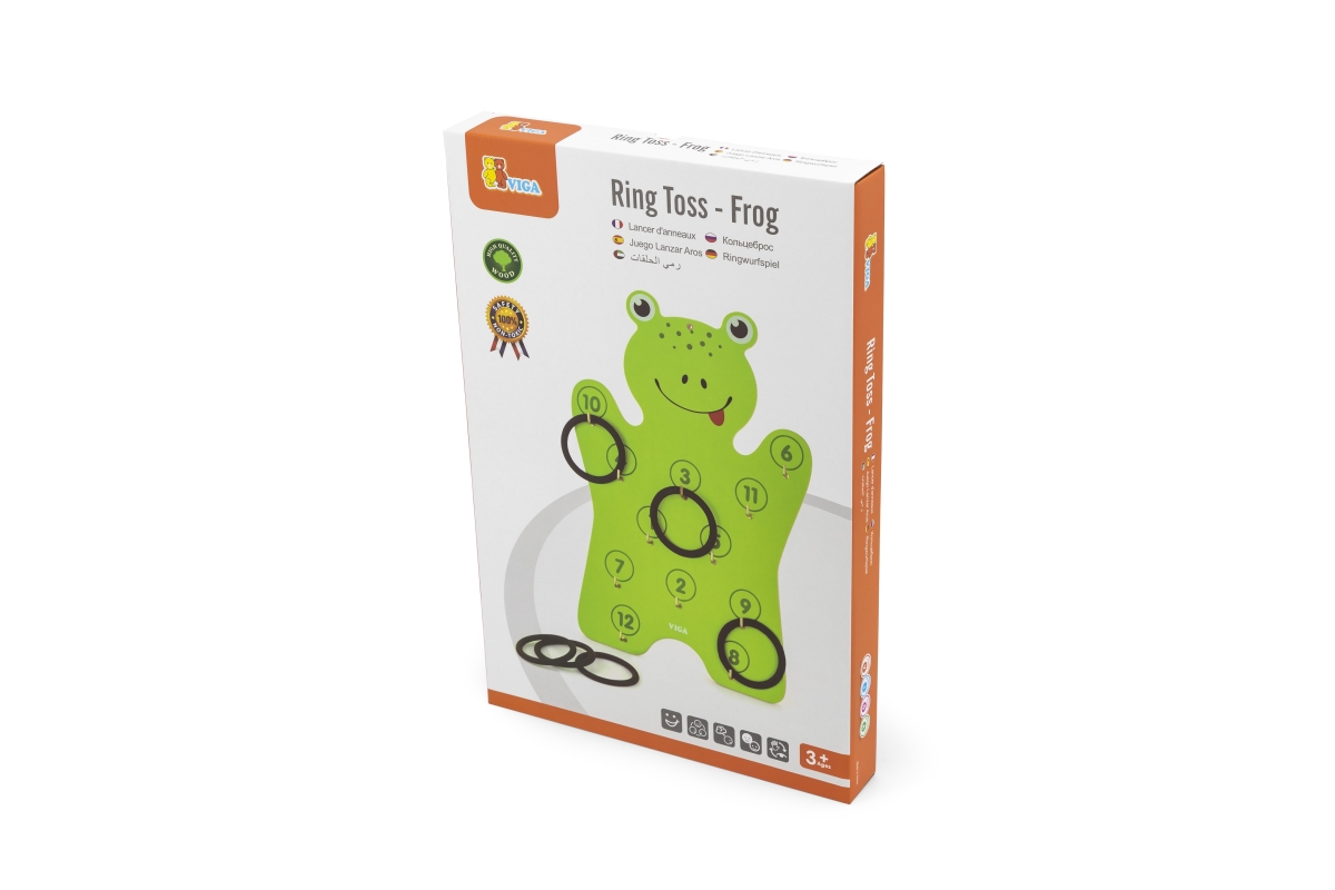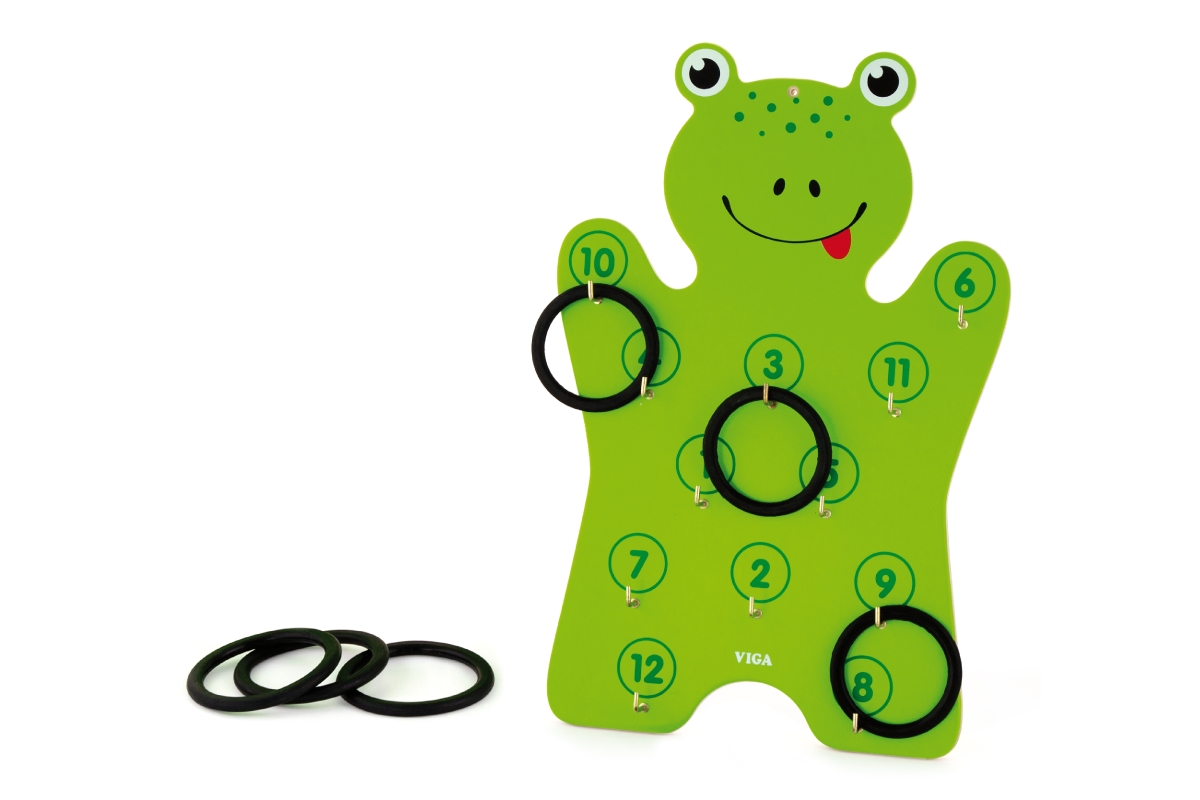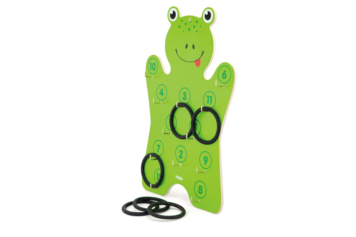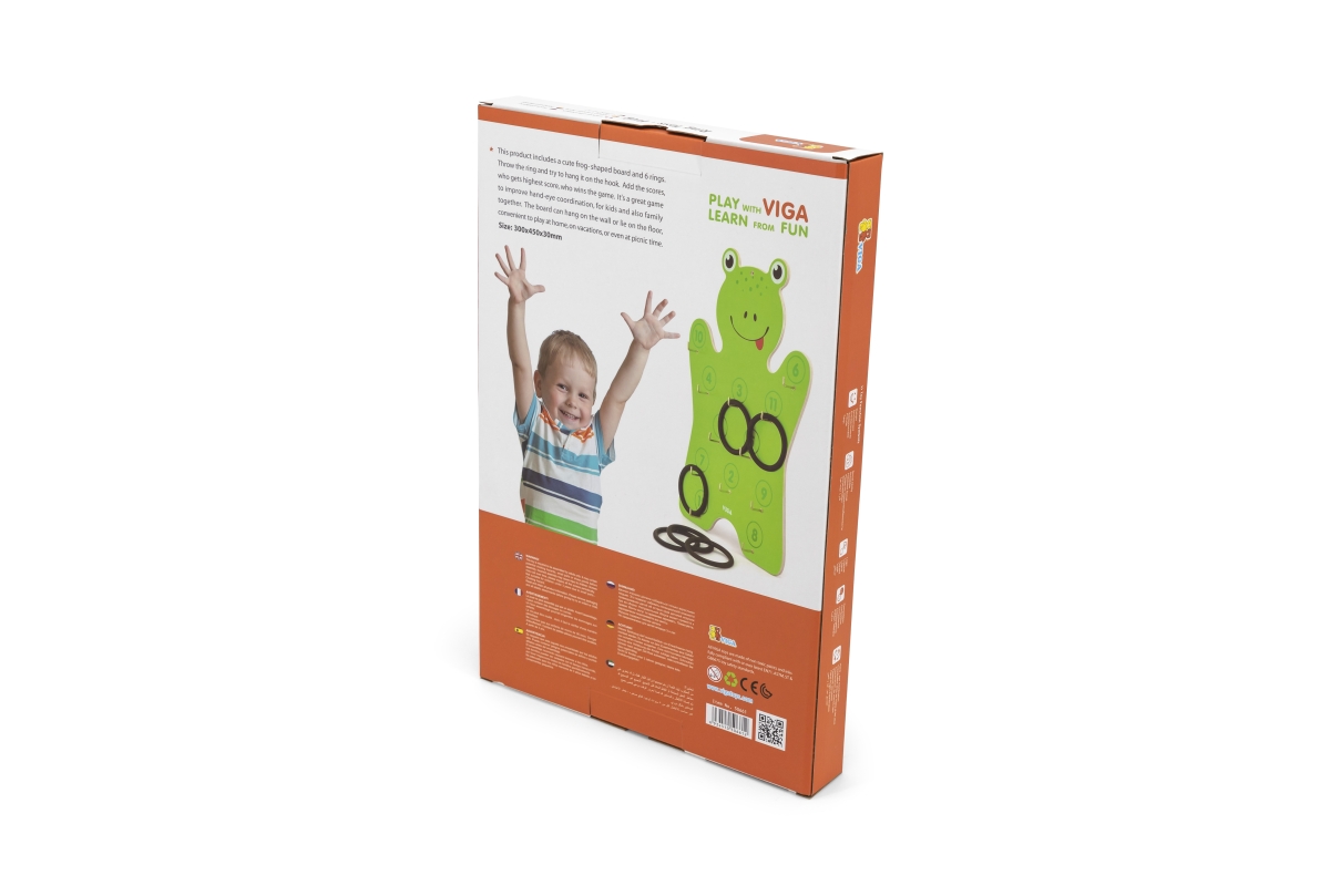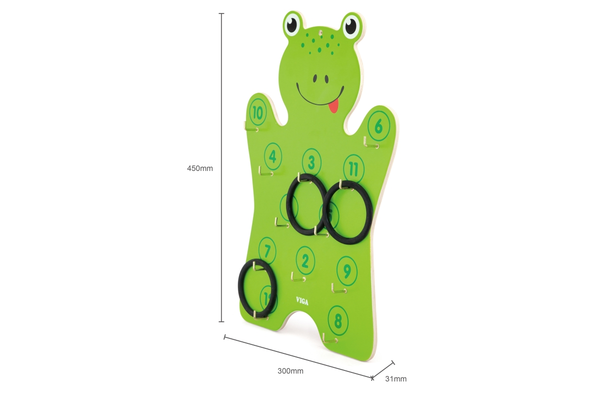 Dřevěná nástěnná hra - házení kroužků. Balení obsahuje dřevěnou žábu o velikosti cca 30 x 45 x 3 cm a 6 kroužku. Rozměry balení cca 30,5 x 45,5 x 4,5 ..