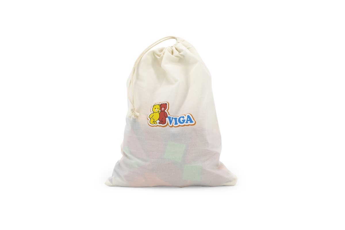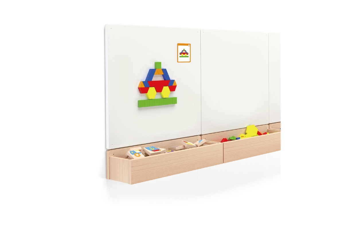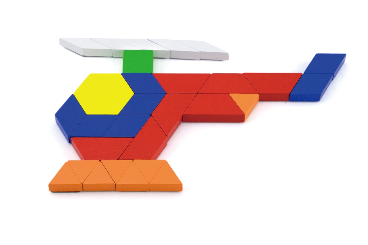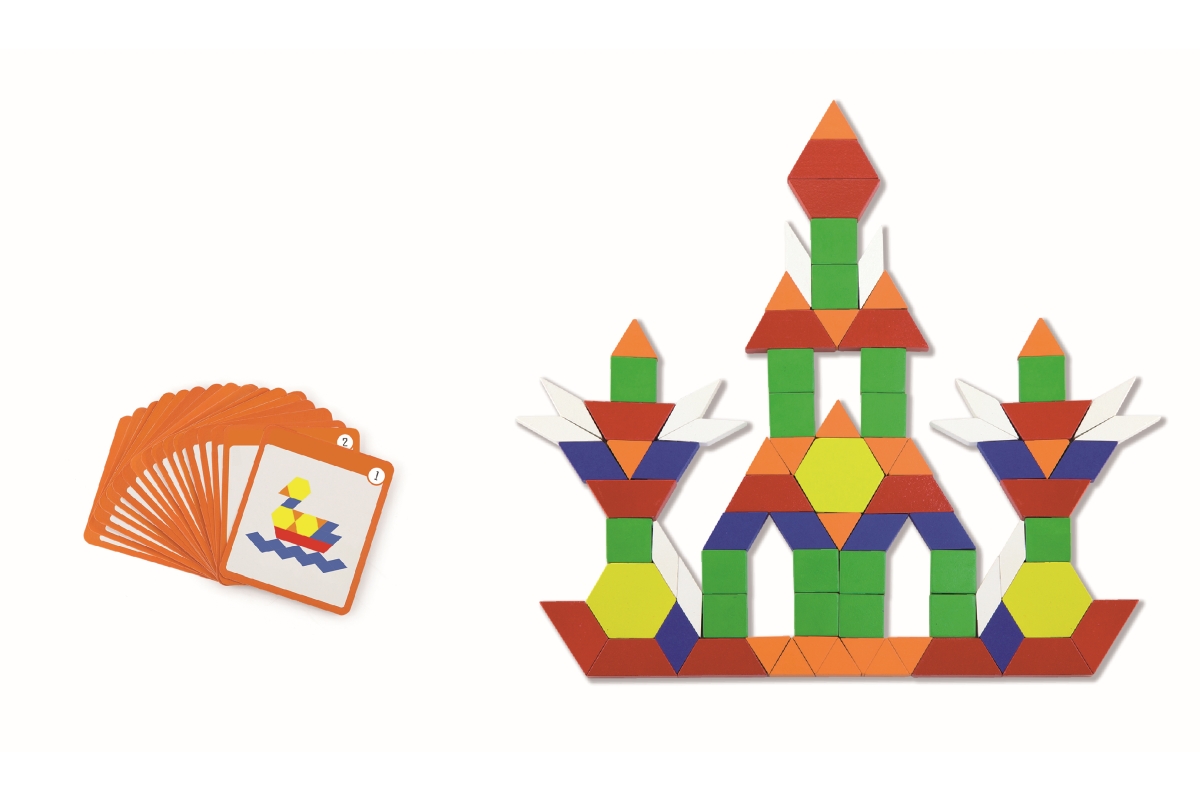 Dřevěné magnetické tvary. Balení obsahuje celkem 102 kusů magnetických geometrických tvarů, kartičky (dle kterých lze skládat obrázky) a praktický lát..