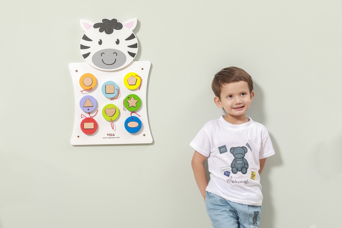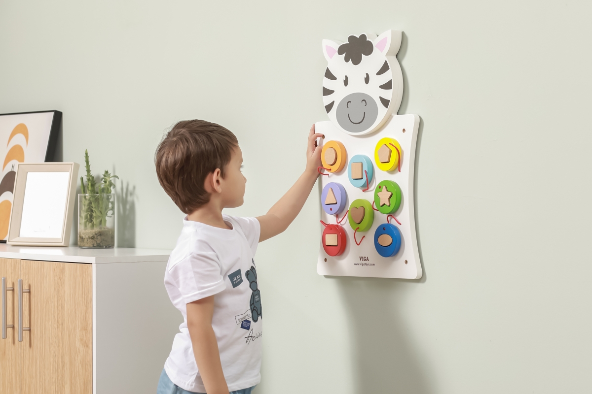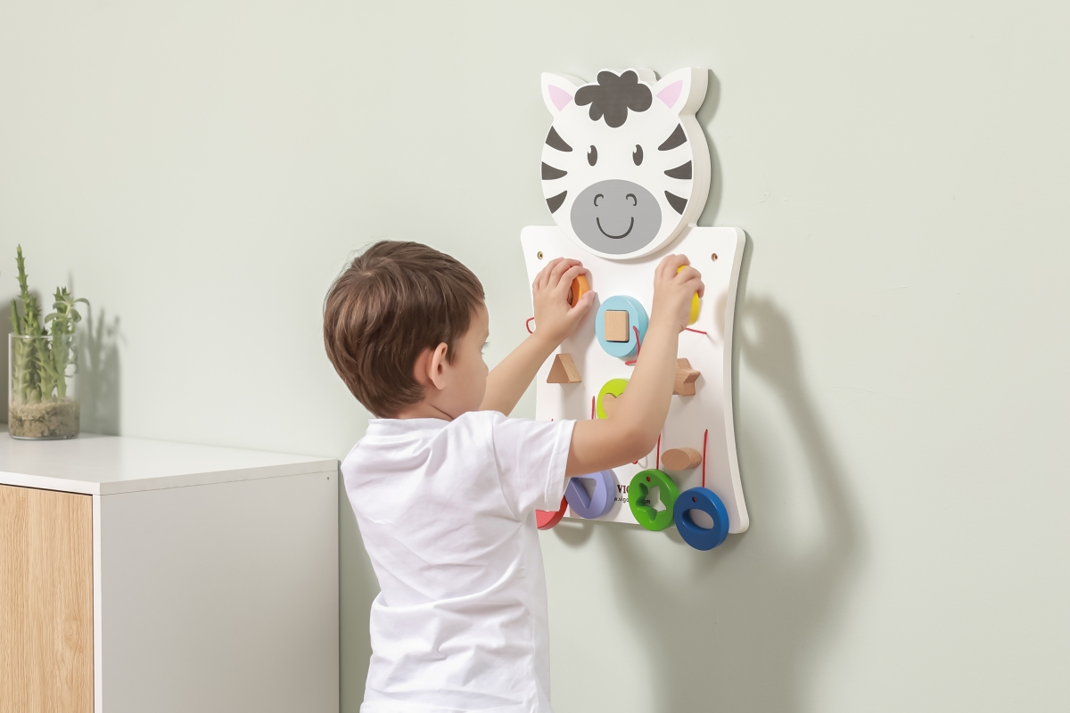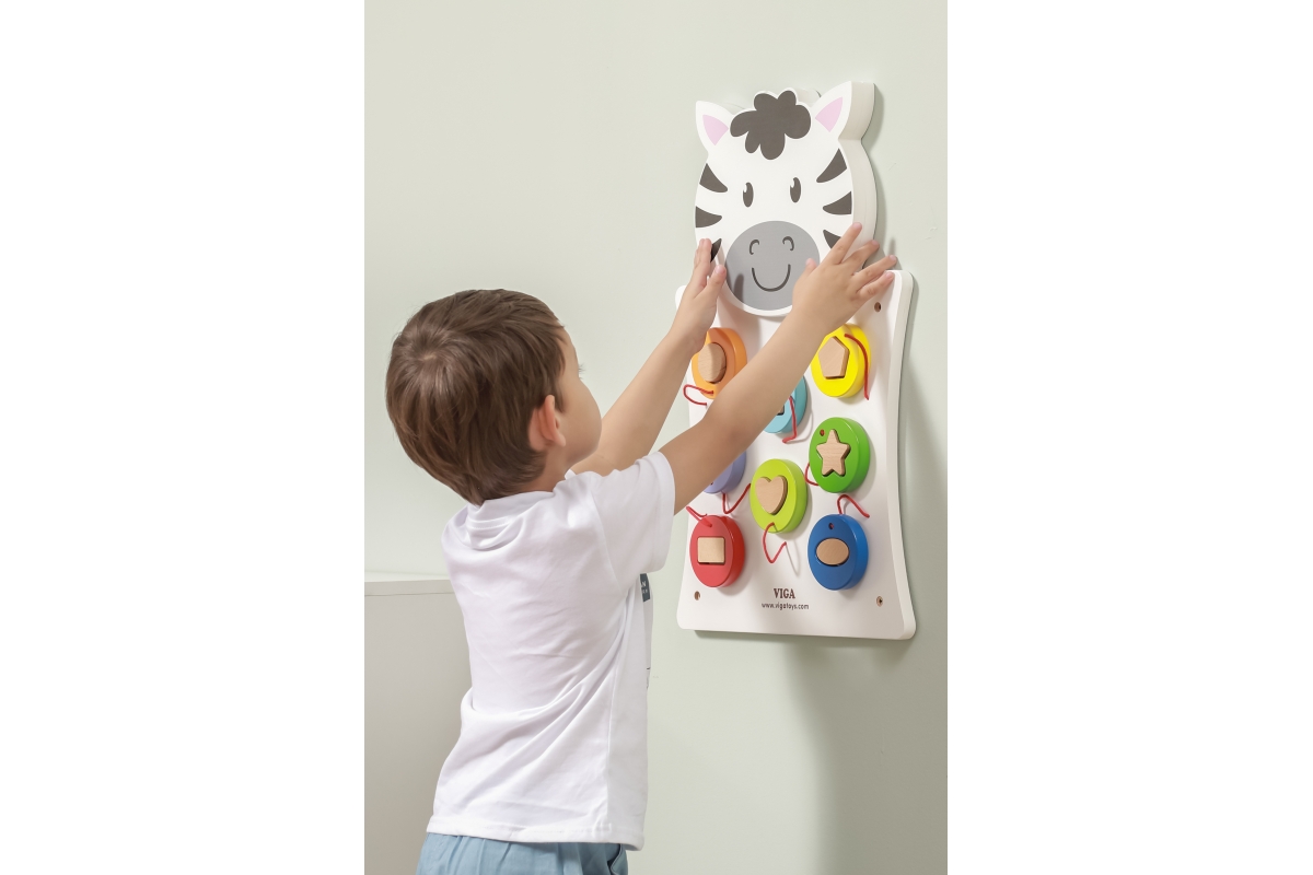 Dřevěná nástěnná hra s motivem zebry. Velikost cca 36 x 55 x 3,5 cm. Hra pro výuku barev a tvarů. Rozměry balení cca 38,5 x 57 x 4,5 cm. Věk 18m+..