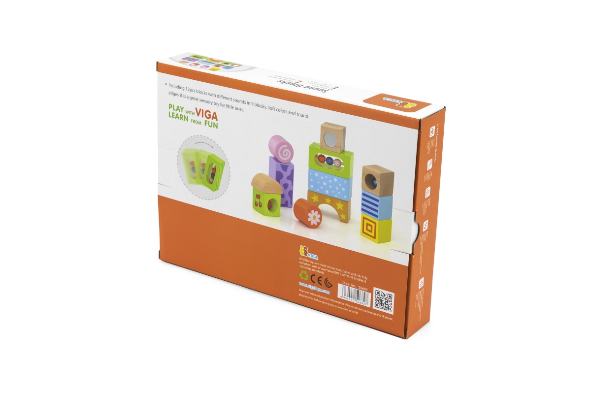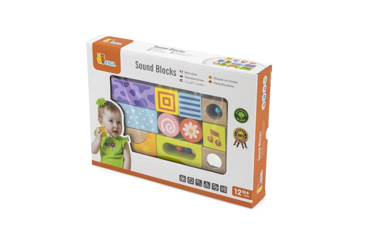Dřevěné kostky se zvuky. Balení obsahuje celkem 12 kostek, z nichž 9 kostek vydávájí zvuky. Rozměry balení cca 29 x 21,5 x 4,5 cm. Věk 12m+..