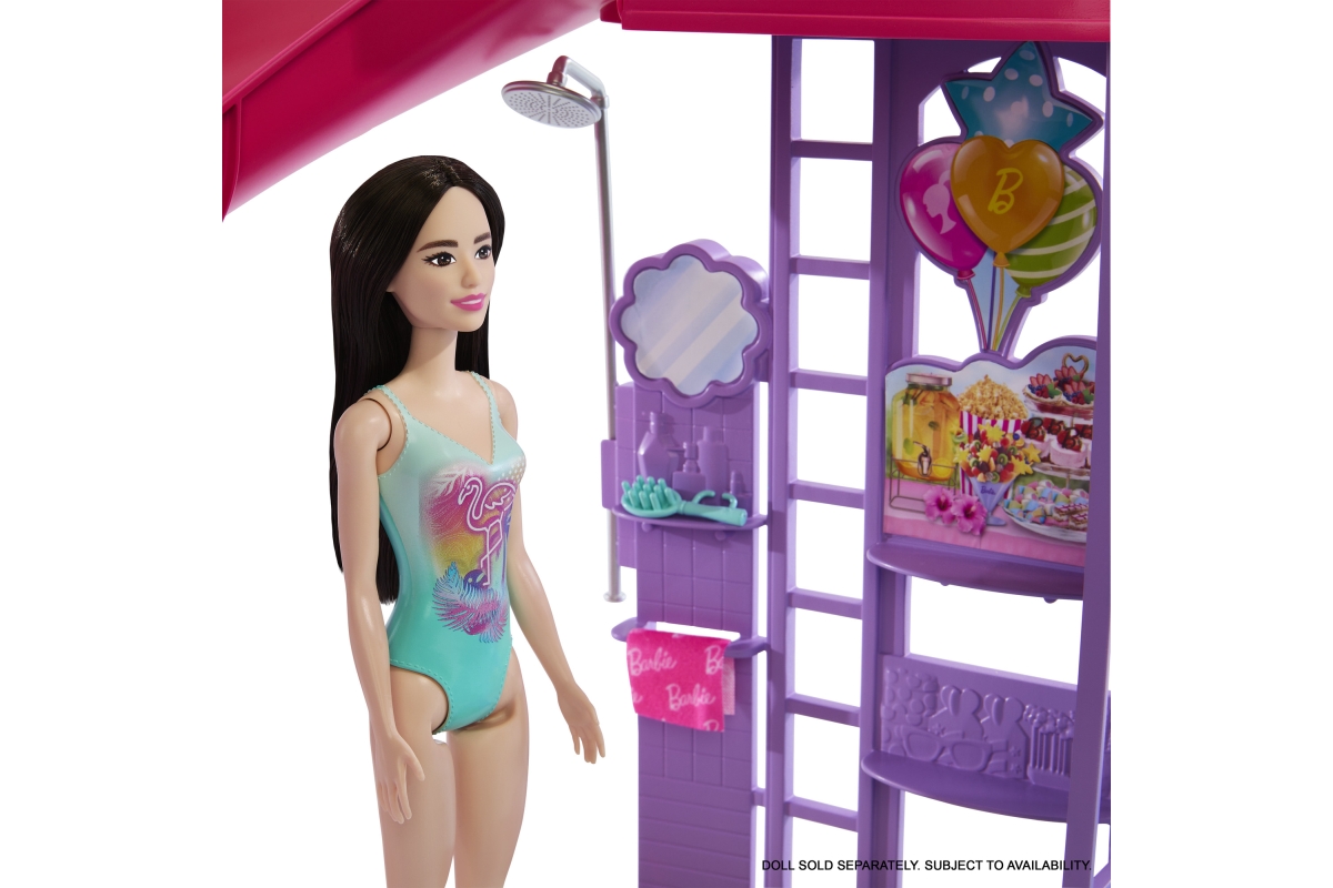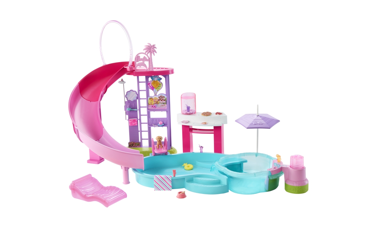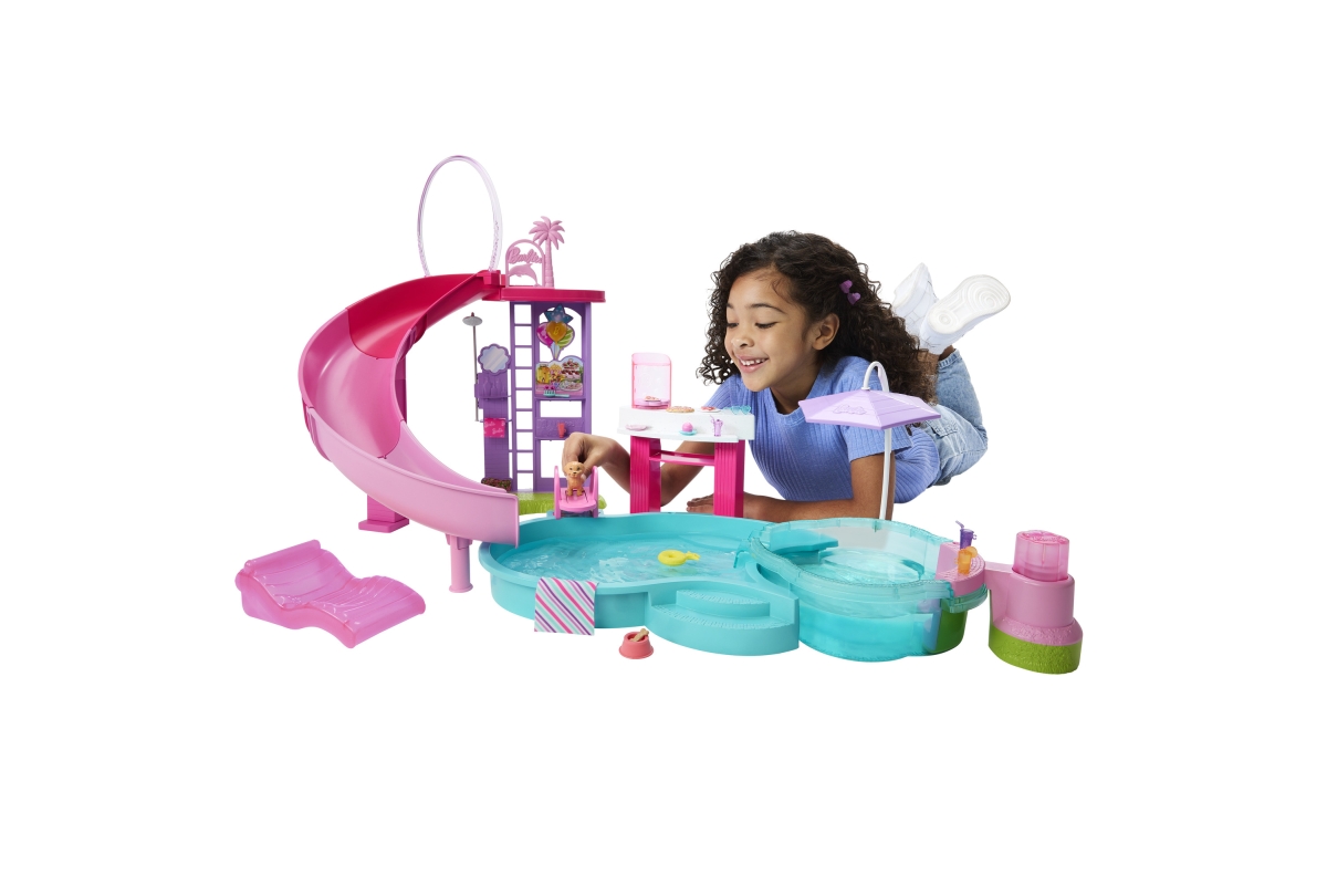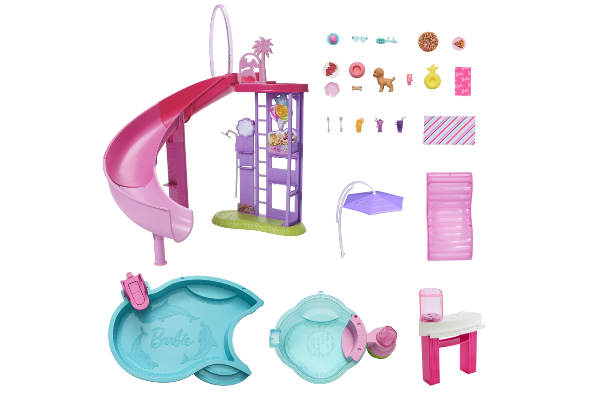 Vítejte u Barbie bazénu snů! Tady je každý den ten nejlepší na koupání! Herní set nabízí šest hracích zón, včetně bazénu, skluzavky, vířivky a snack baru, a více než 20 doplňků. Naplň bazén vodou a uspořádej pořádnou párty! Panenky Barbie (prodávají se samostatně) mohou klouzat po skluzavce do vody, páčkou spustíš bublinky ve vířivce a u snack baru naservíruješ další zábavu. Barvy a vzhled výrobku se mohou lišit. Věk 3+