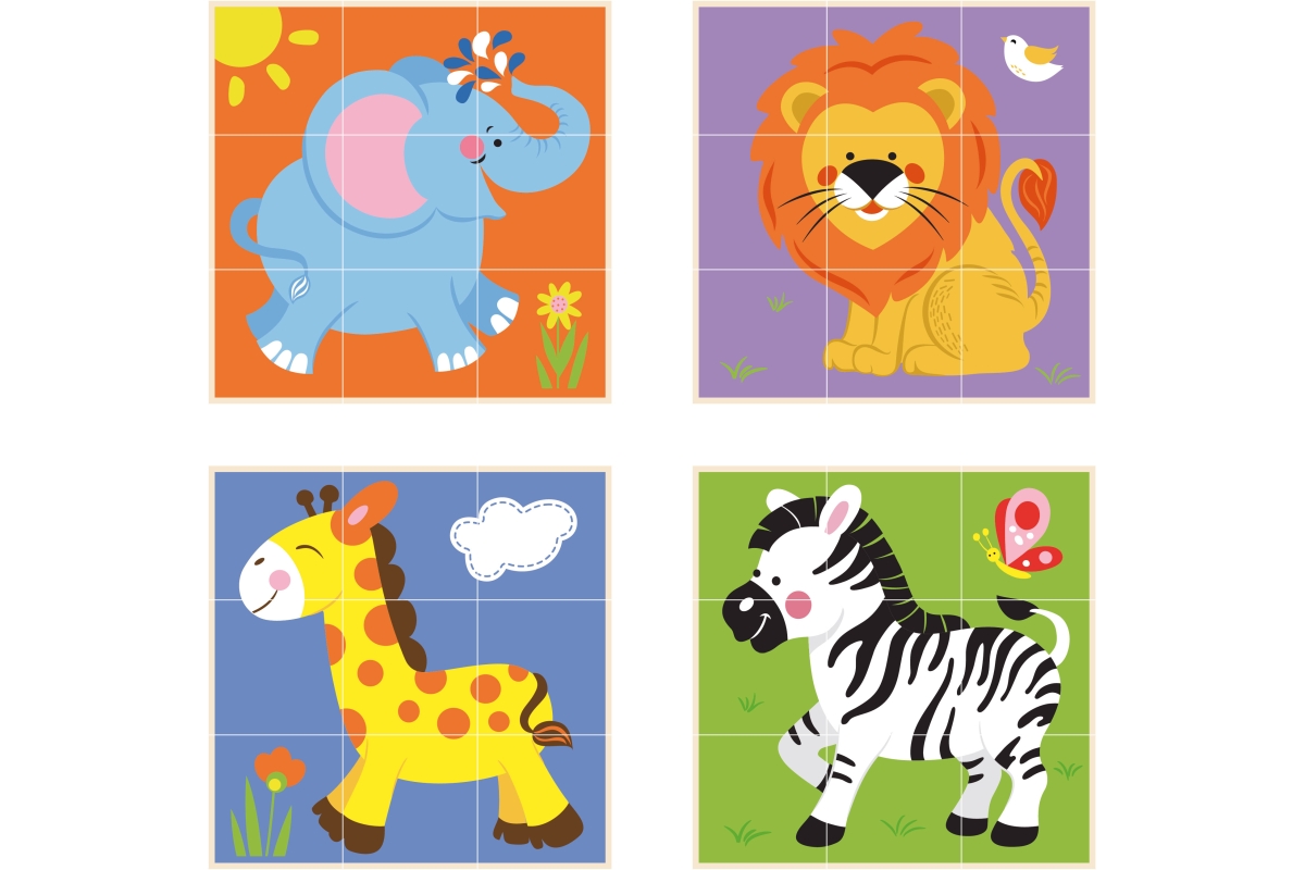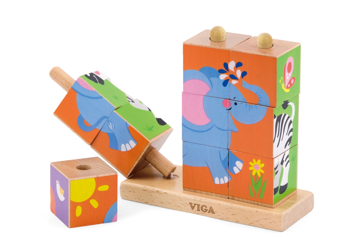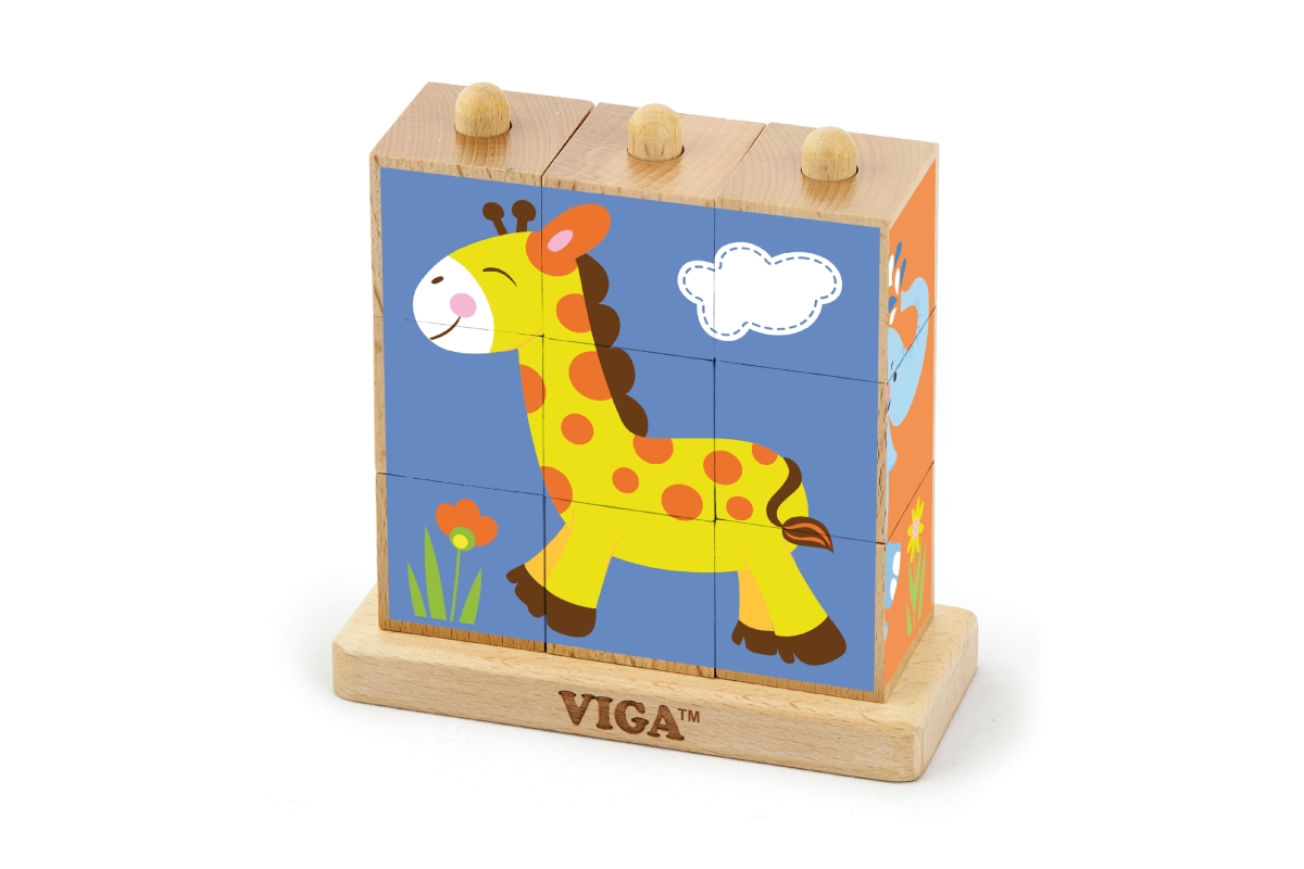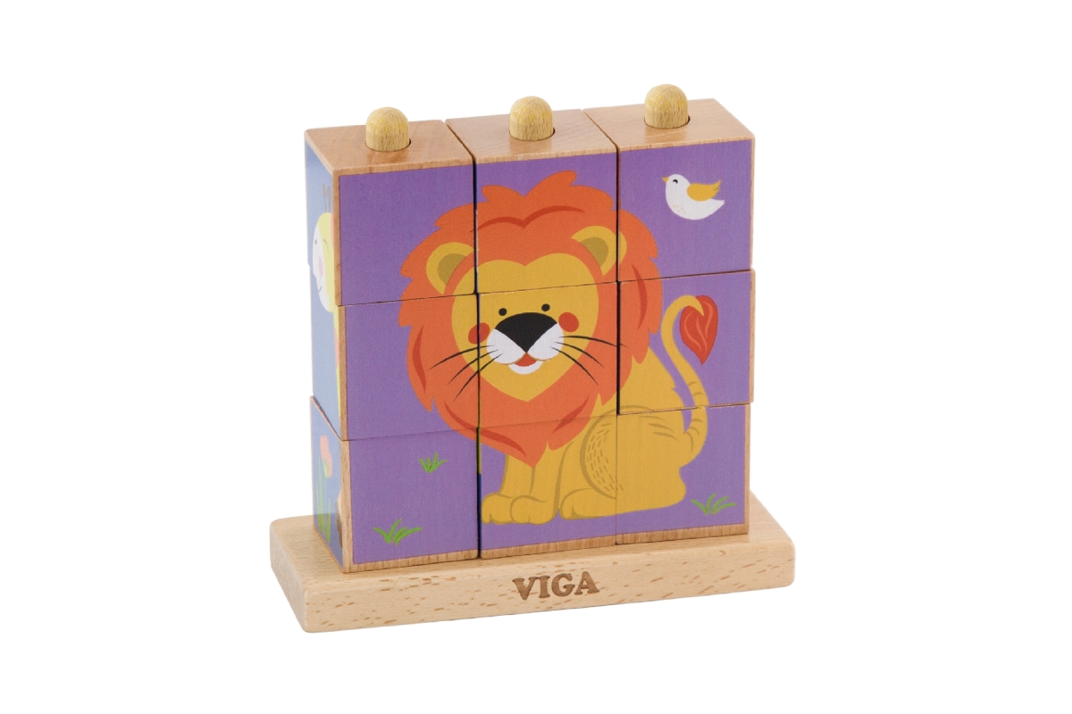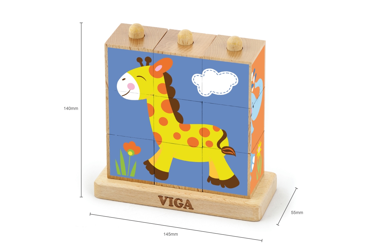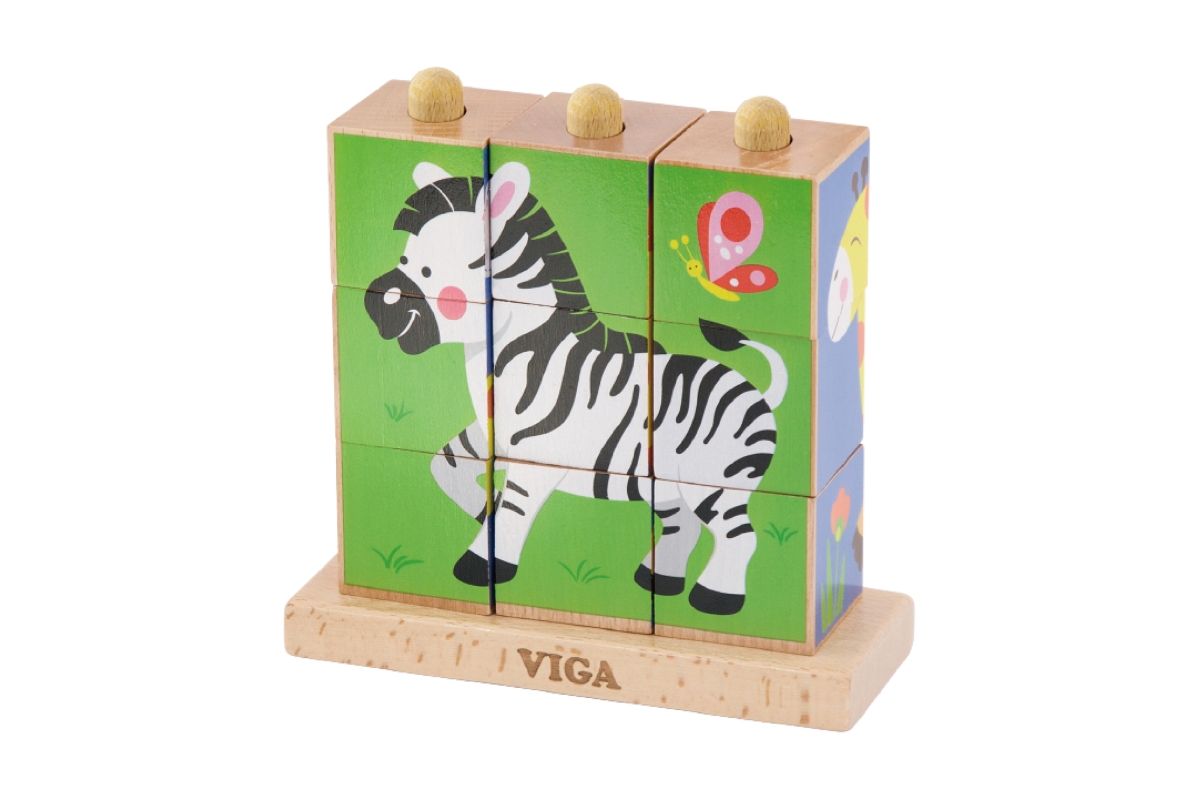 Dřevěné kostky, které lze stavět vertikálně - navlékáním na tyčky. Lze složit 4 různé obrázky. Rozměry hračky cca 14,5 x 14 x 5,5 cm. Rozměry balení c..
