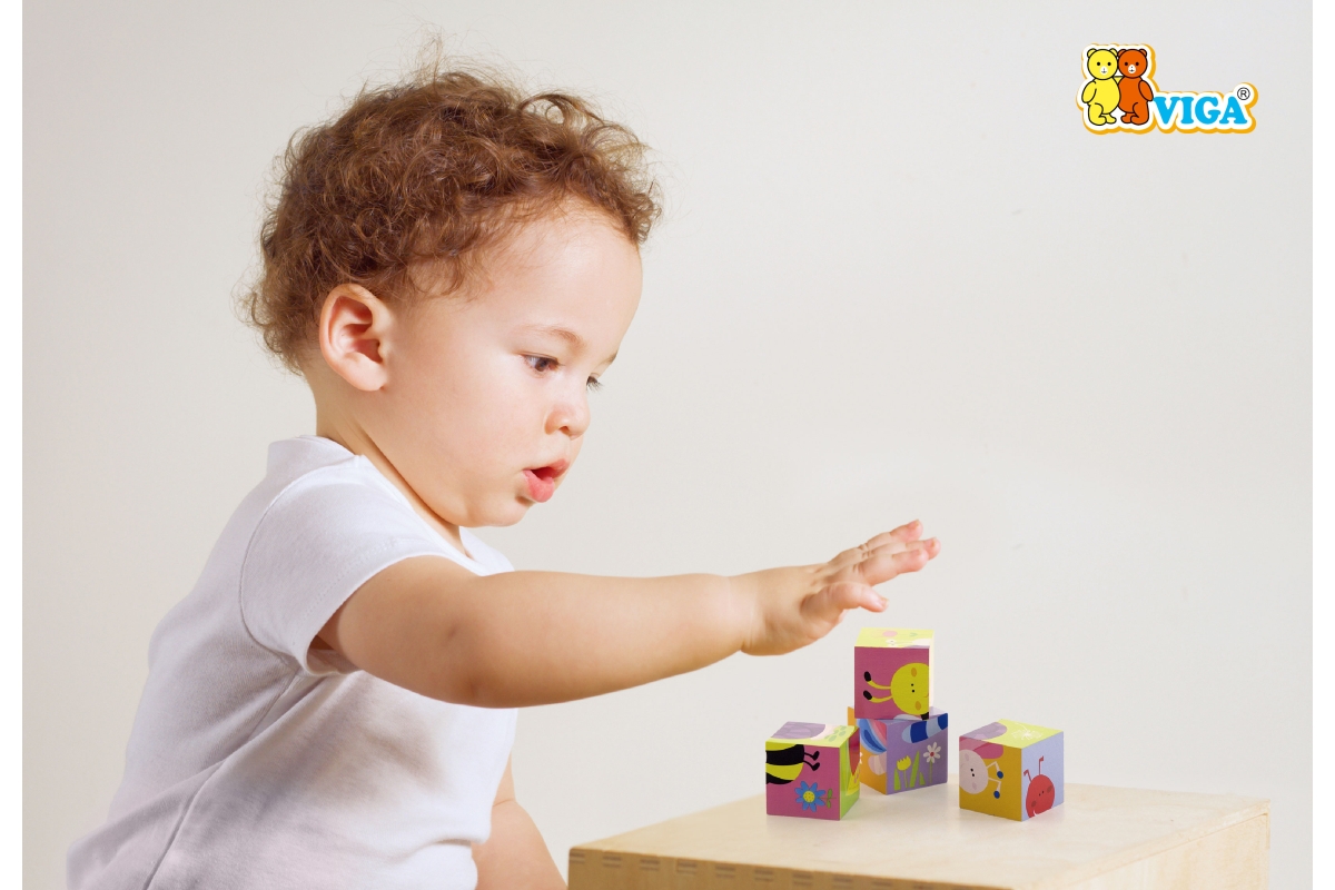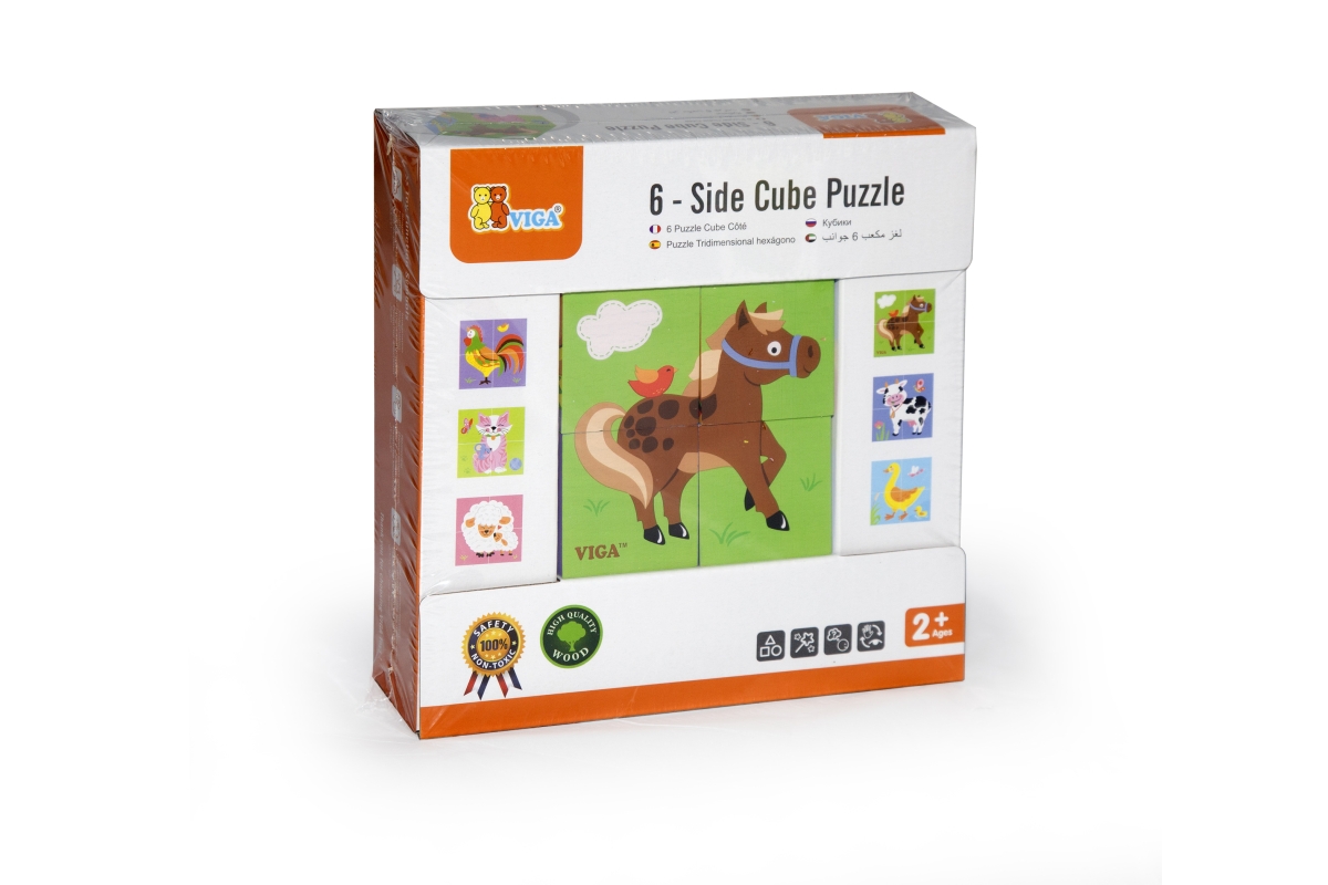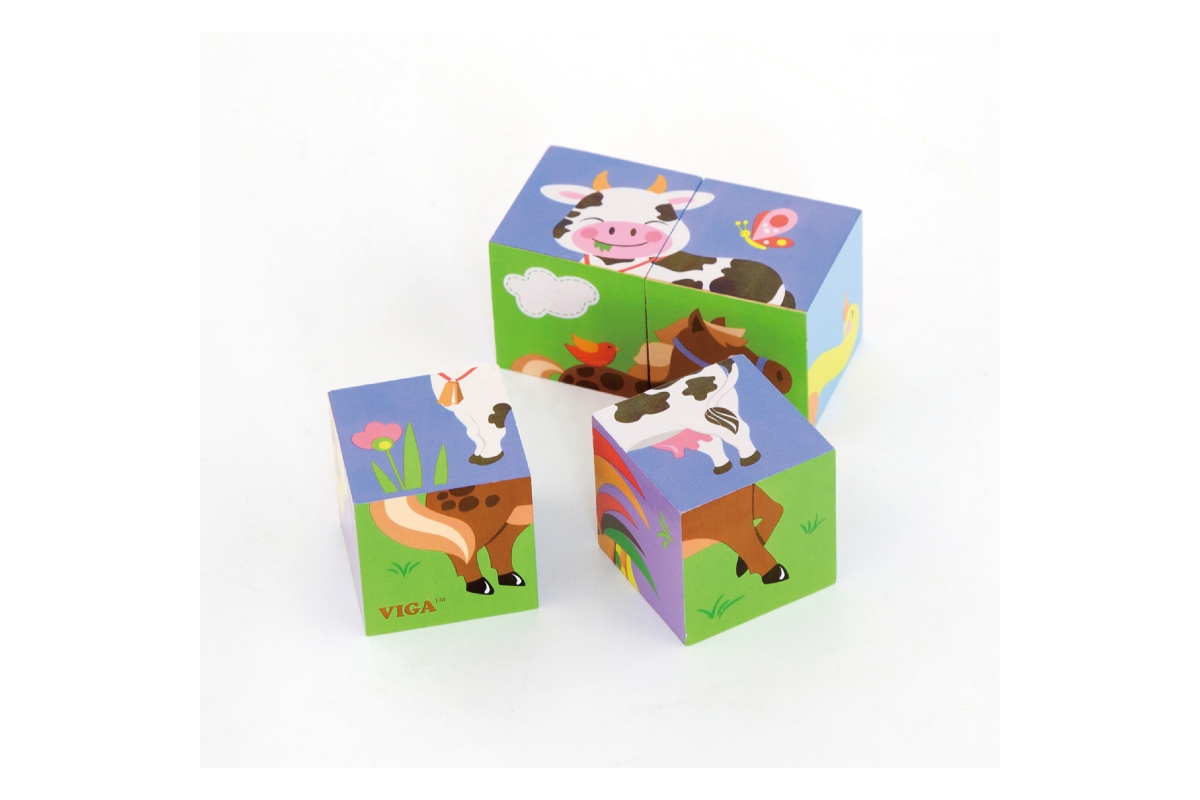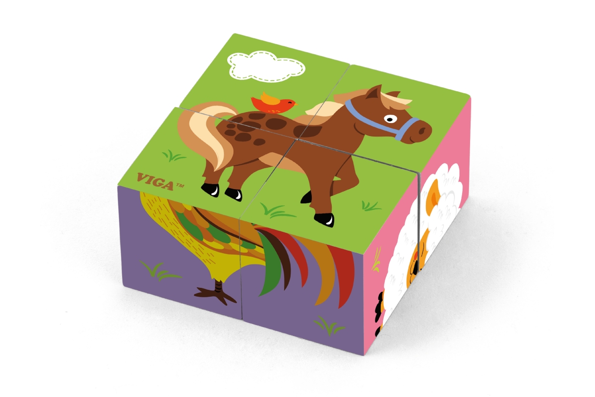 Dřevěné kostky, ze kterých lze složit 6 obrázků zvířátek. Celkem 4 ks. Rozměry kostky cca 4,5 x 4,5 cm. Rozměry balení cca 18 x 18 x 5 cm. Věk 2+..