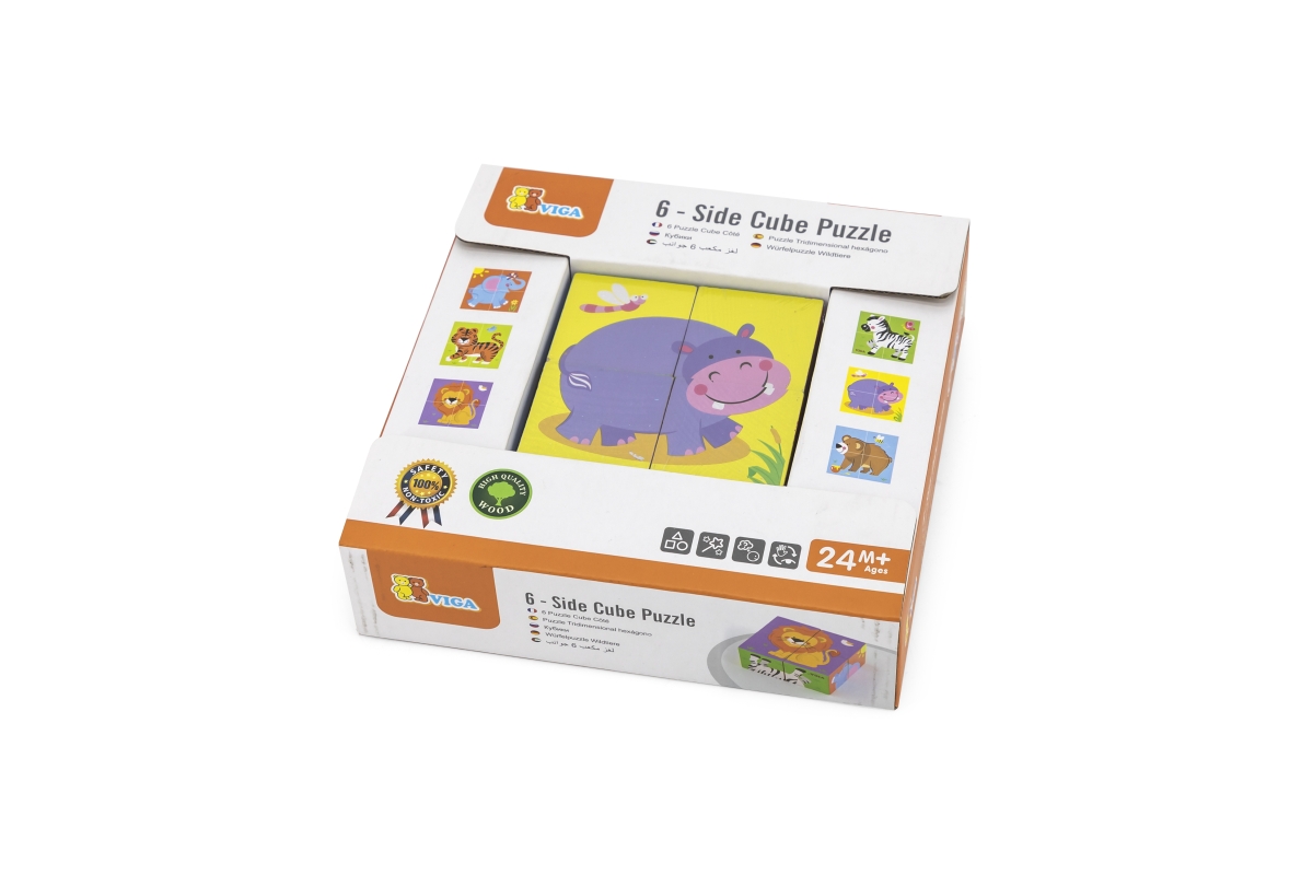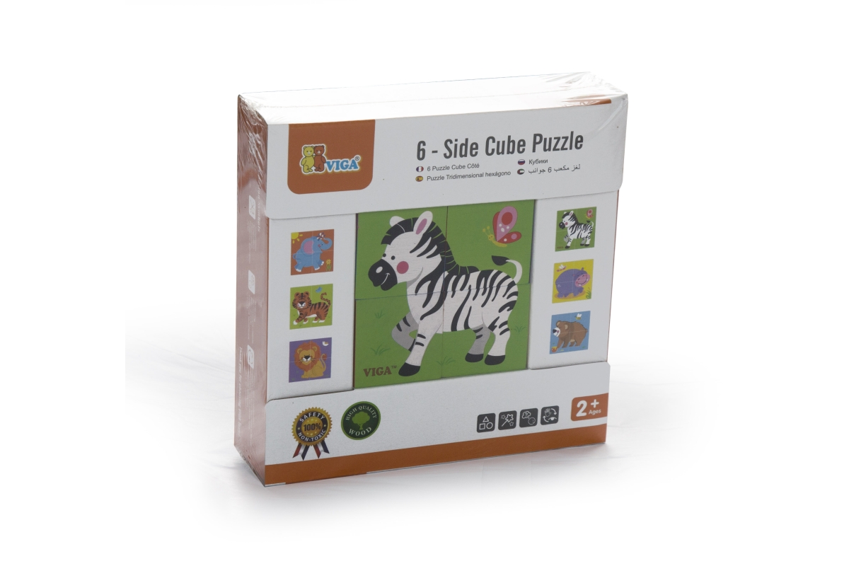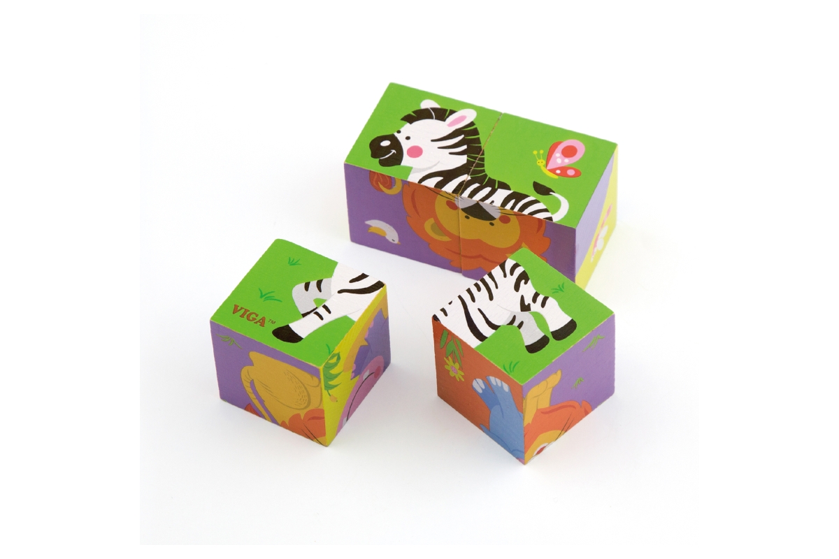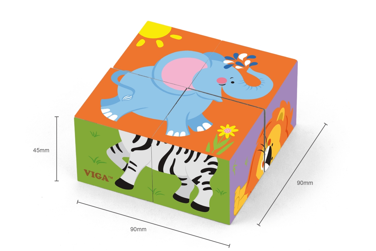 Dřevěné kostky, ze kterých lze složit 6 obrázků zvířátek. Celkem 4 ks. Rozměry kostky cca 4,5 x 4,5 cm. Rozměry balení cca 18 x 18 x 5 cm. Věk 2+..