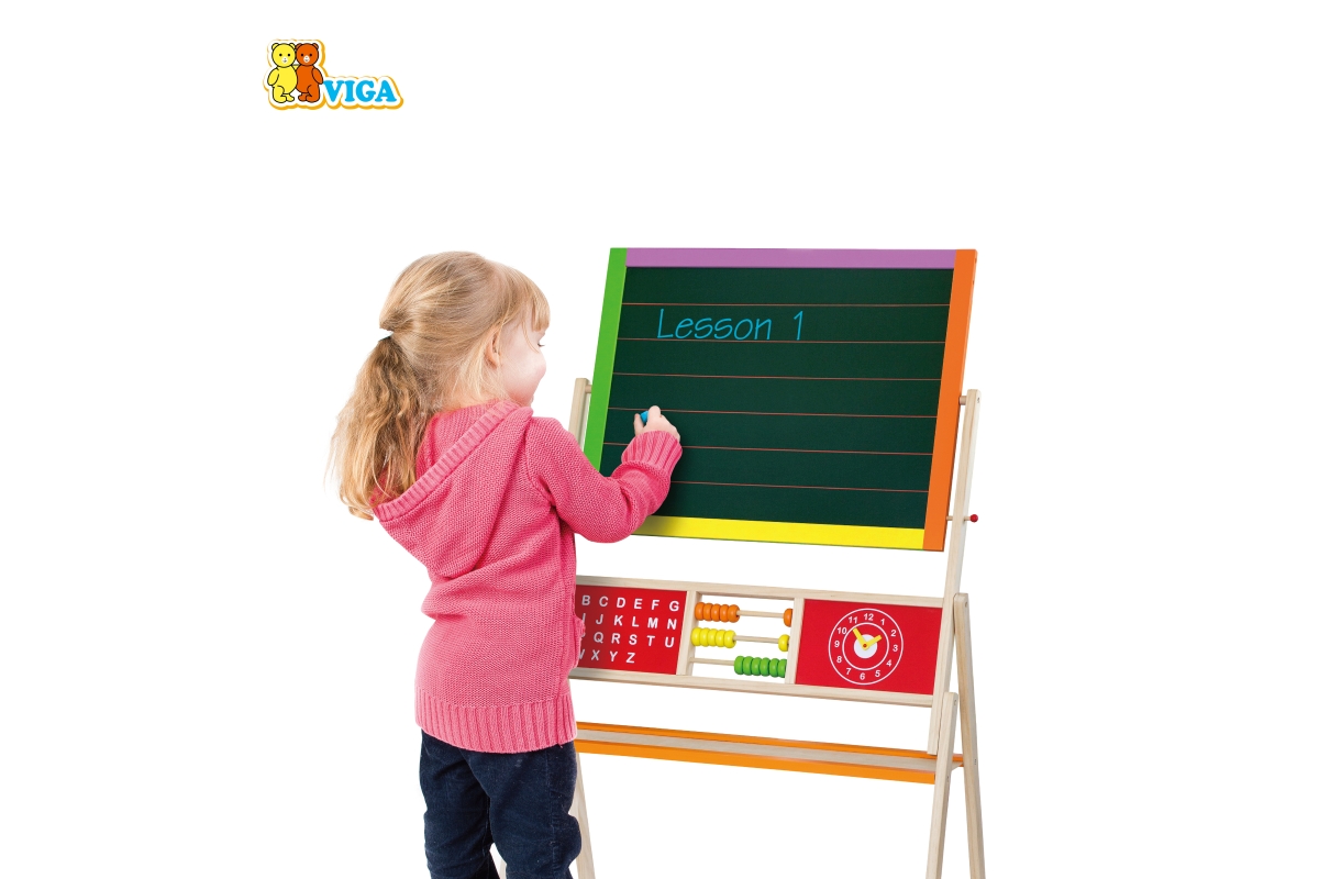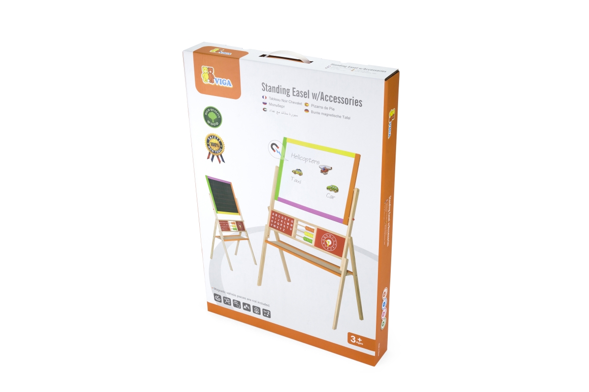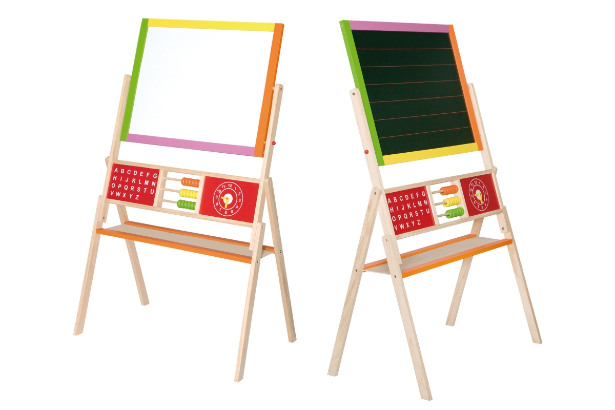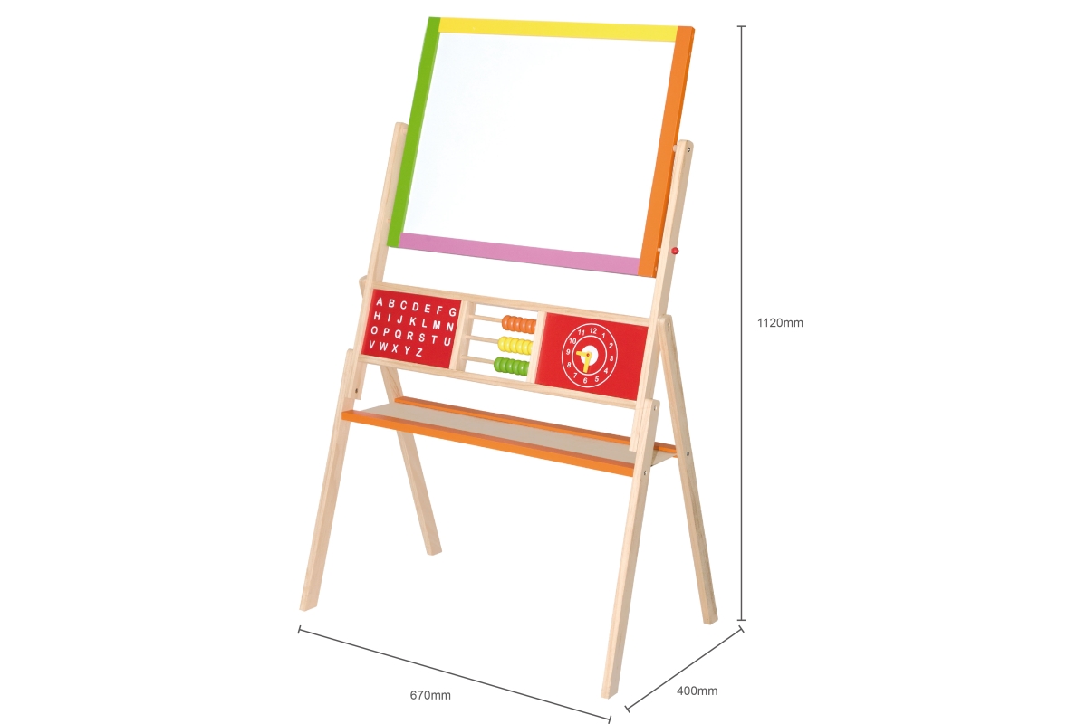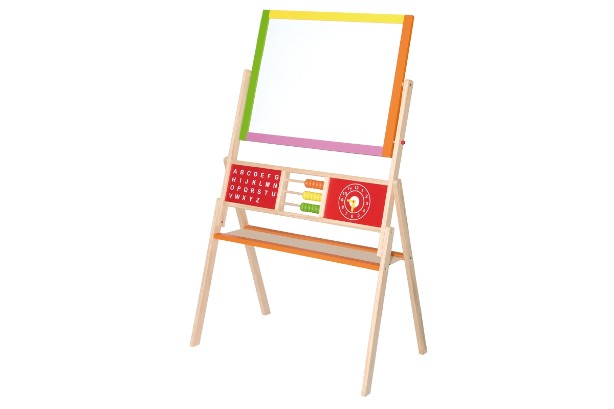 Dřevěná tabule 2v1. Jedna strana tabule je bílá magnetická na kterou lze psát speciální fixou. Na druhé straně je černá tabule na kterou lze psát křídami. Pod tabulí je také počítadlo, písmena a hodiny. Balení obsahuje také křídy, fix a houbičku. Rozměry tabule cca 112 x 67 x 40 cm. Rozměry balení cca 47 x 68 x 7,5 cm. Věk 3+