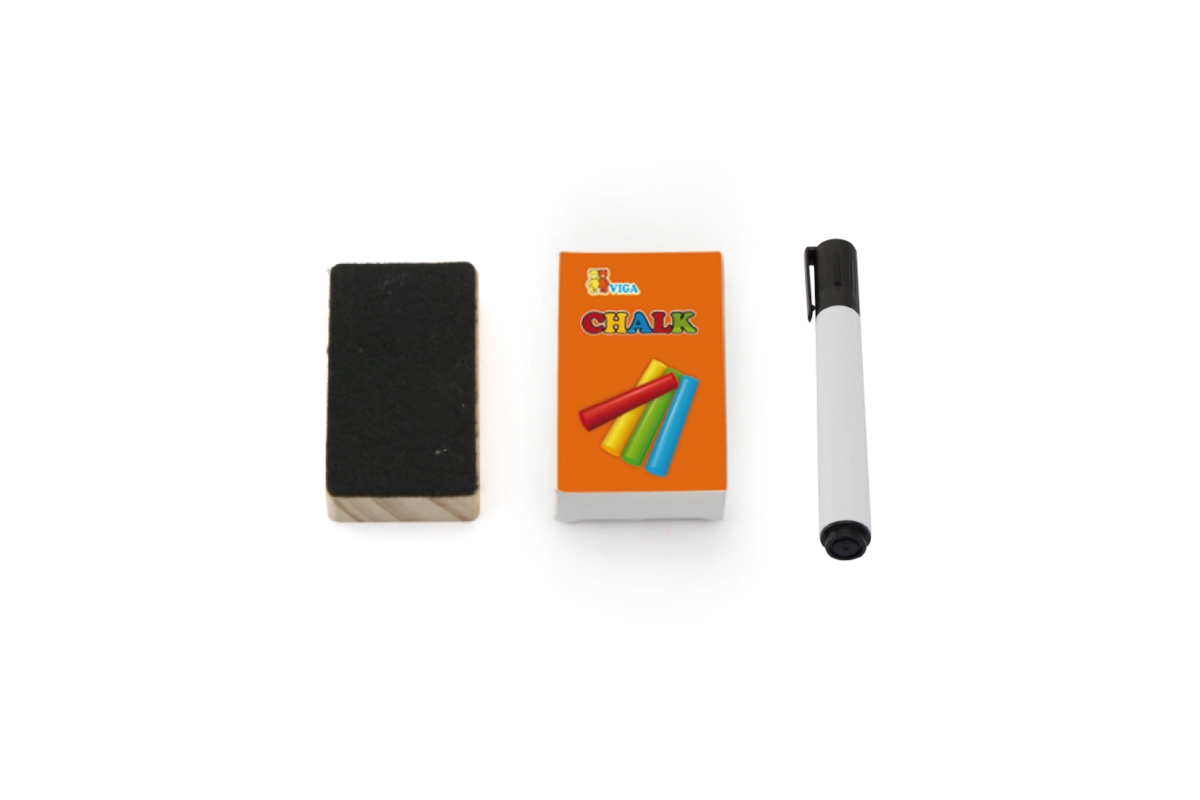 Dřevěná tabule 2v1. Jedna strana tabule je bílá magnetická na kterou lze psát speciální fixou. Na druhé straně je černá tabule na kterou lze psát kříd..