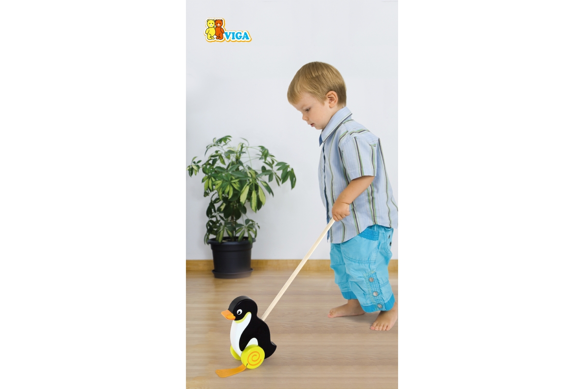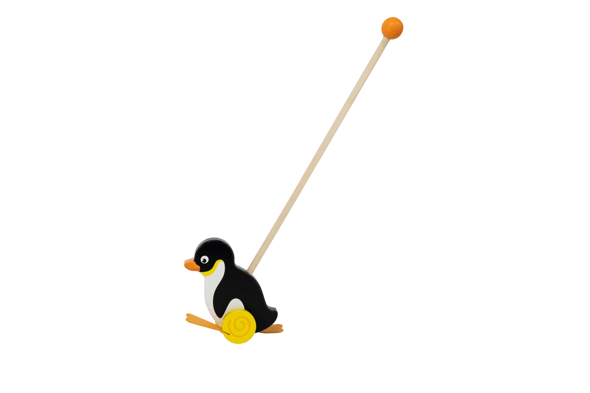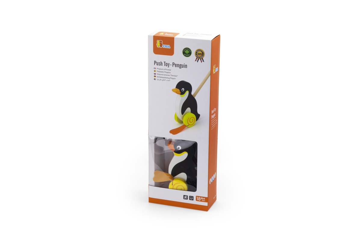 Dřevěná tahačka tučńák. Rozměry tučňáka cca 16 x 10 cm + dřevěná tyč na tlačení. Rozměry balení cca 50 x 18 x 8,5 cm. Věk 18m+..