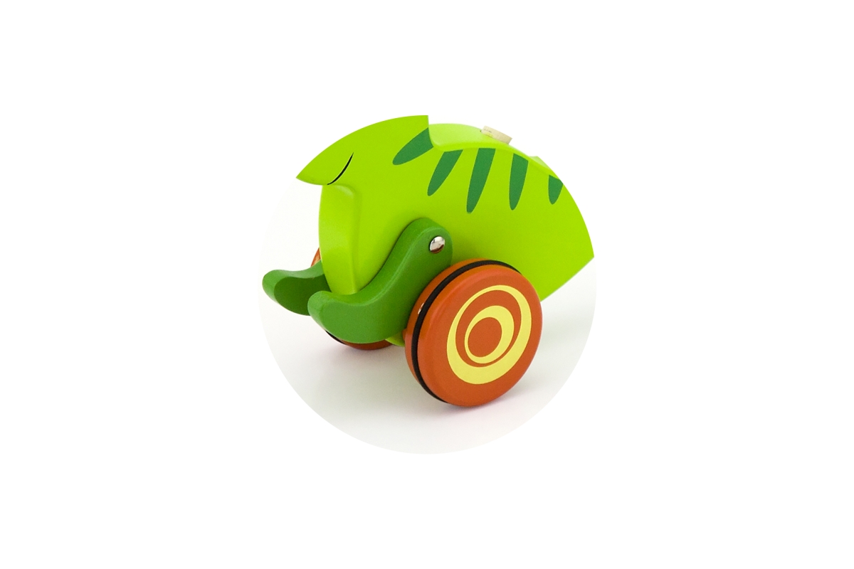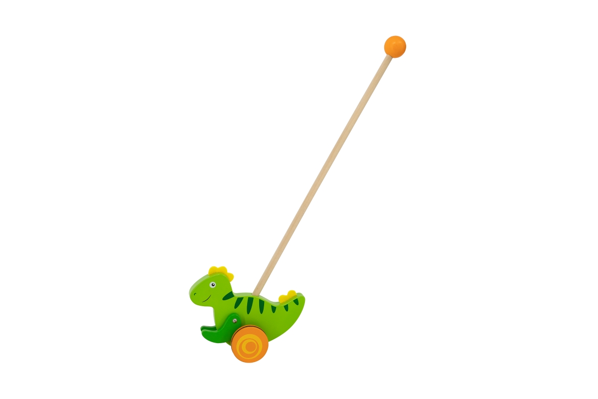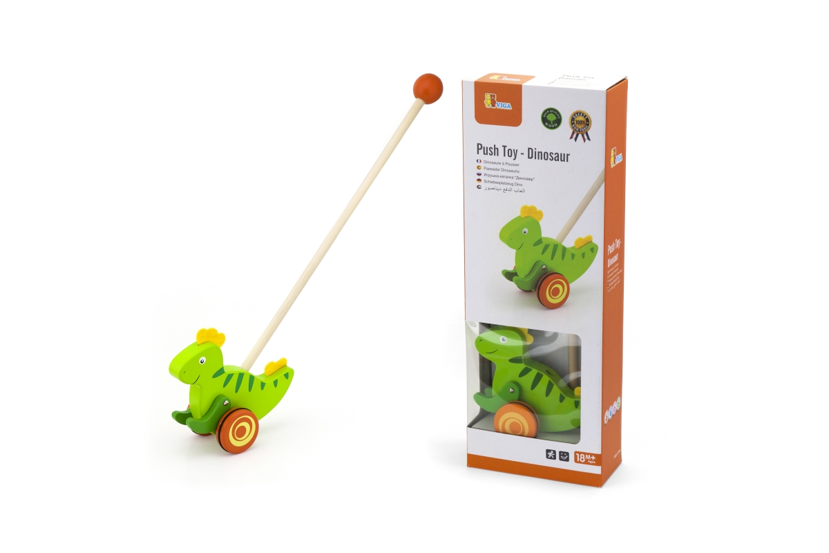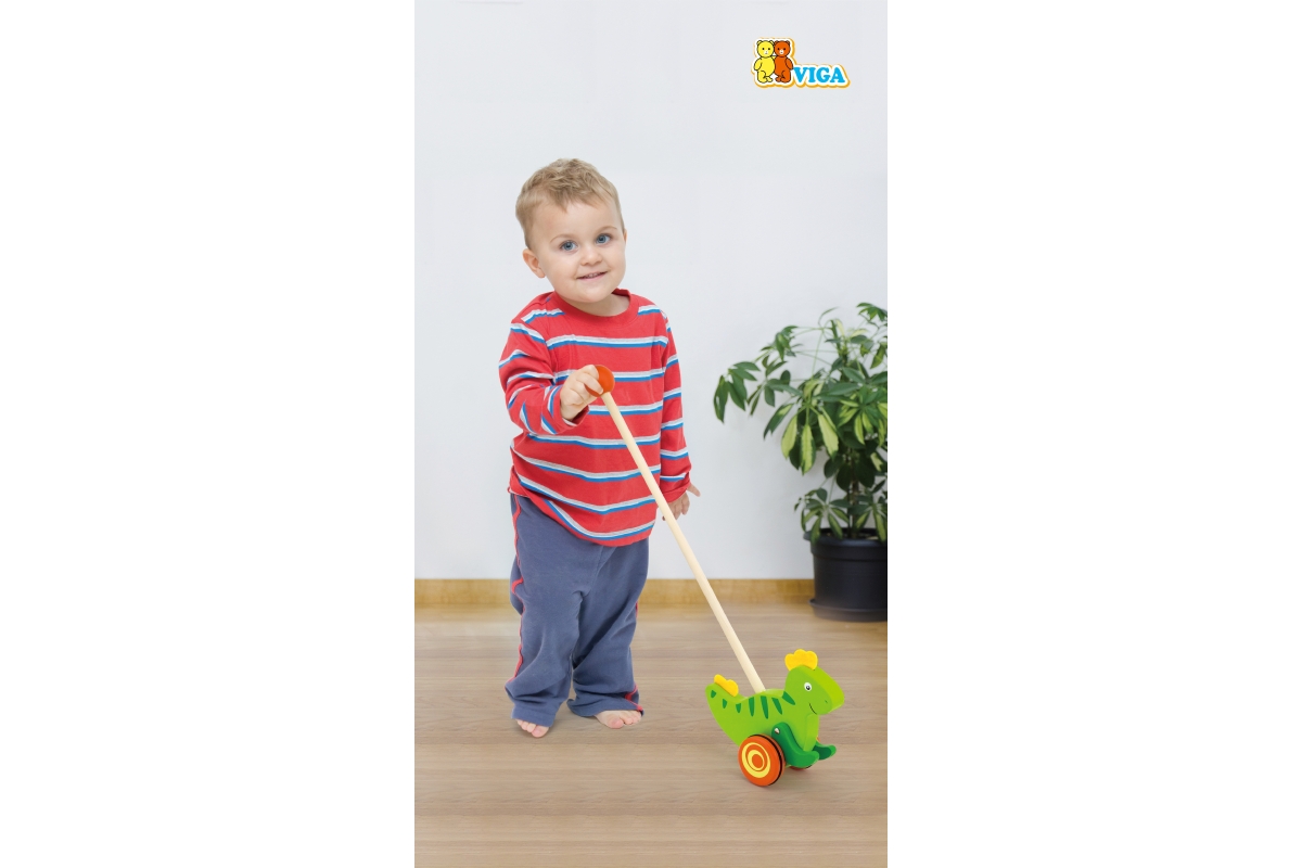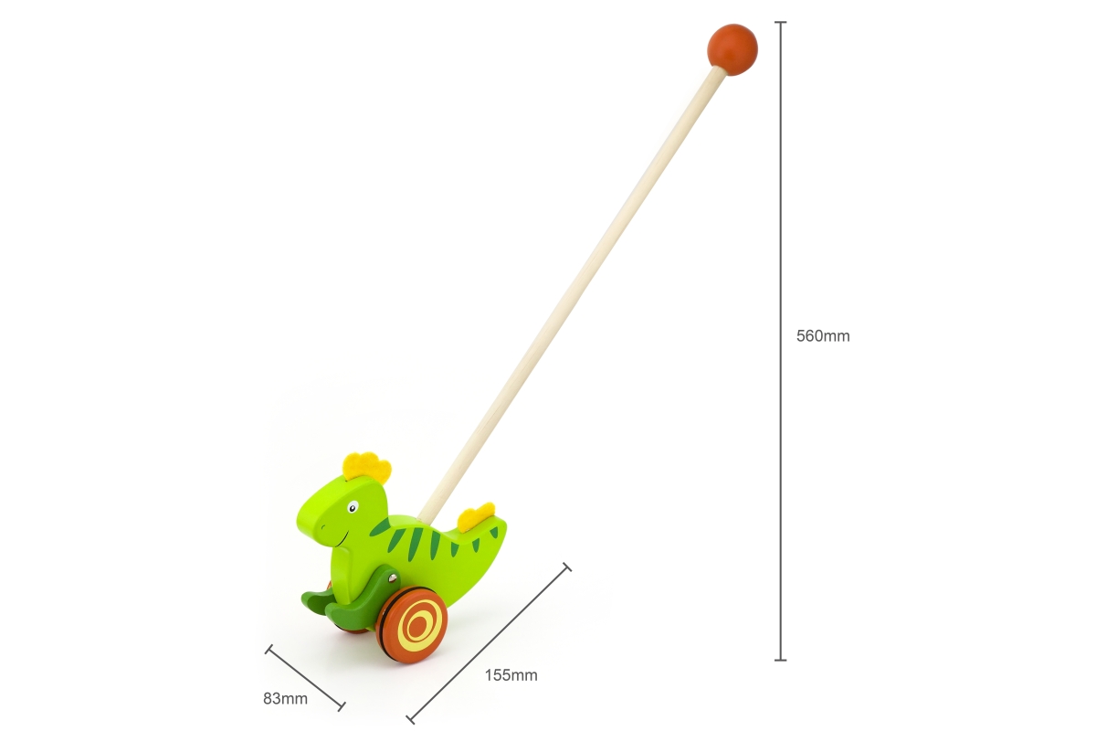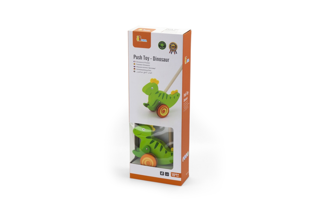 Dřevěná tahačka dinosaurus. Rozměry dinosaura cca 16,5 x 15 cm. Rozměry balení cca 18 x 50 x 8,5 cm. Věk 18m+..