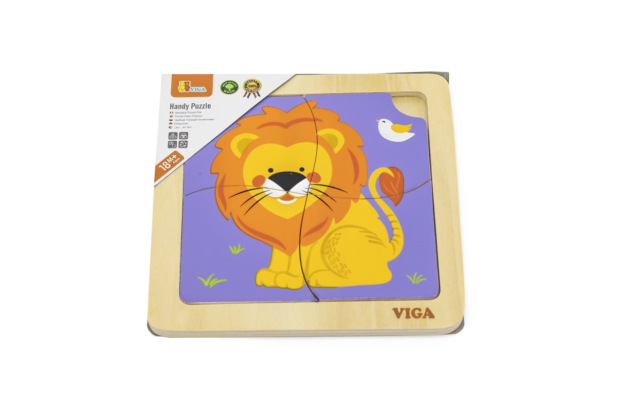 Dřevěné puzzle lev - 4 díílky, obrázek o rozměru cca 12 x 12 cm. Rozměry balení cca 15 x 15 x 1 cm. Věk 18m+..
