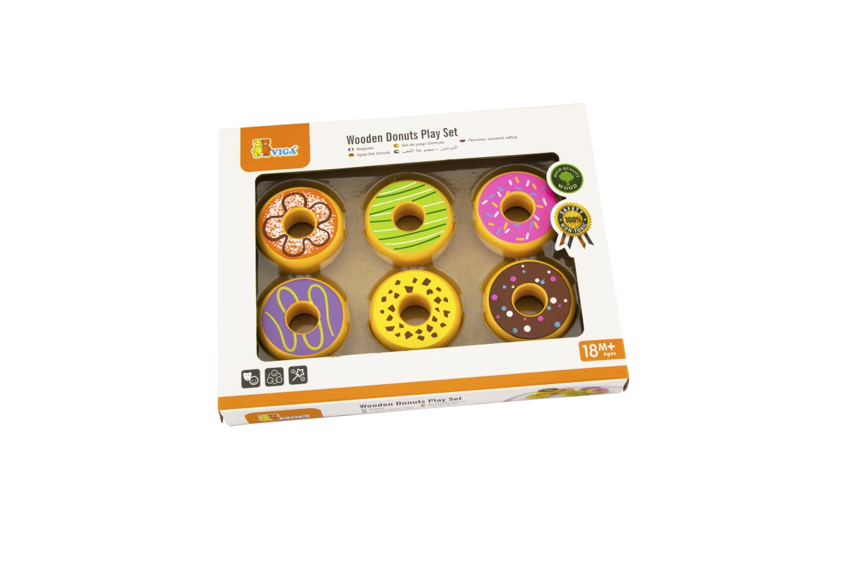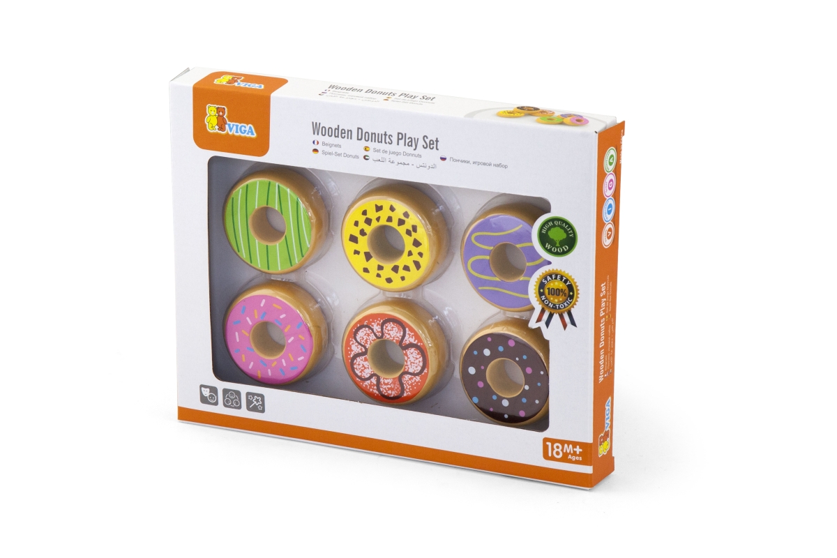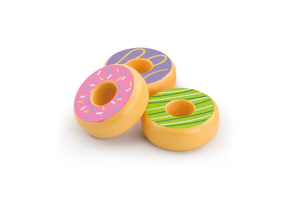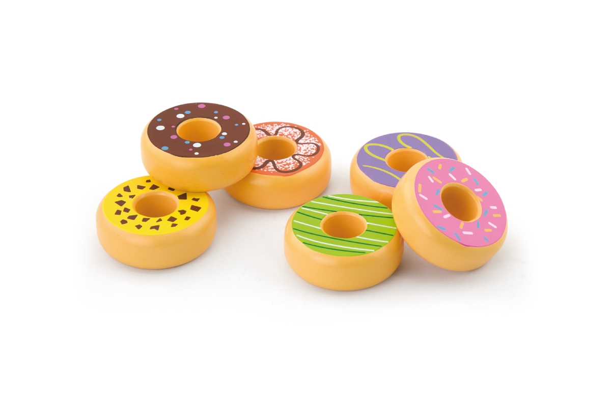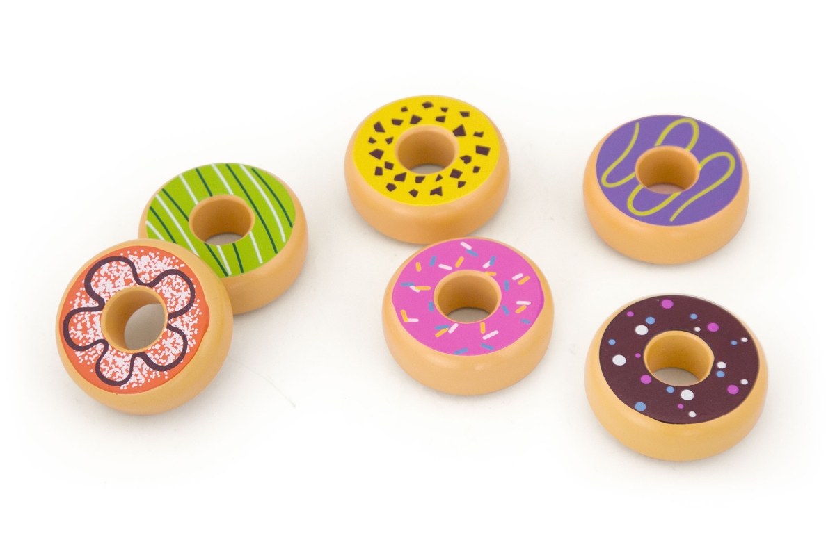 Dřevěné donuty. V balení je celkem 6 donutů různých barev o velikosti cca 5,5 x 5,5 cm. Rozměry balení cca 24,5 x 19 x 3 cm. Věk 18m+..