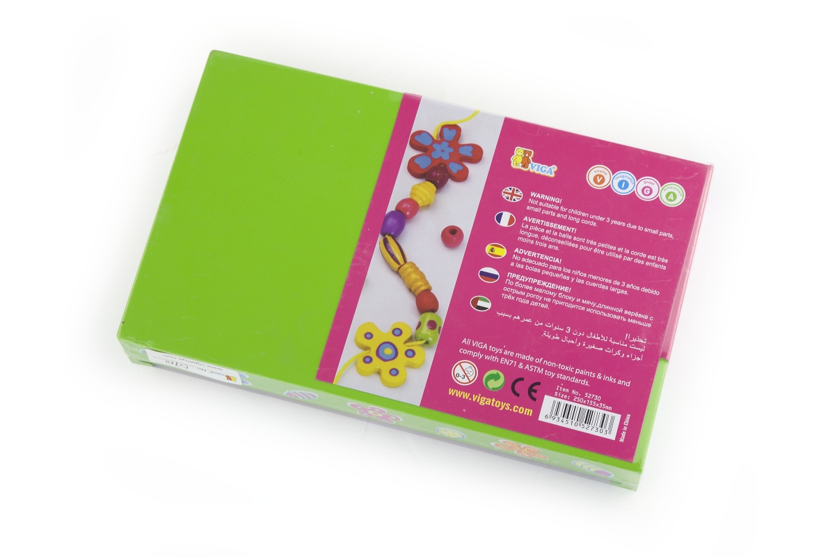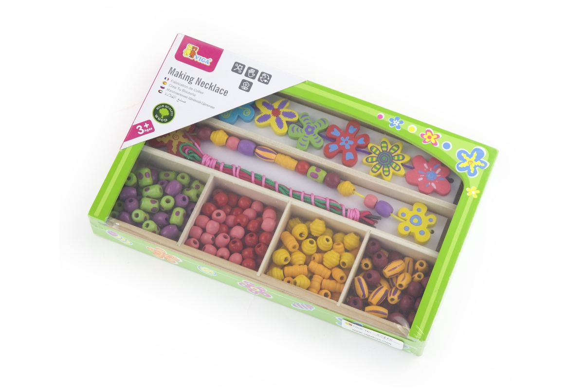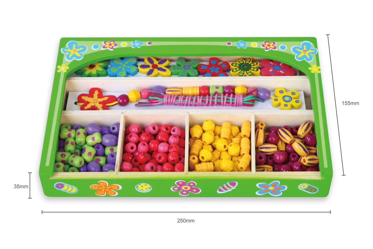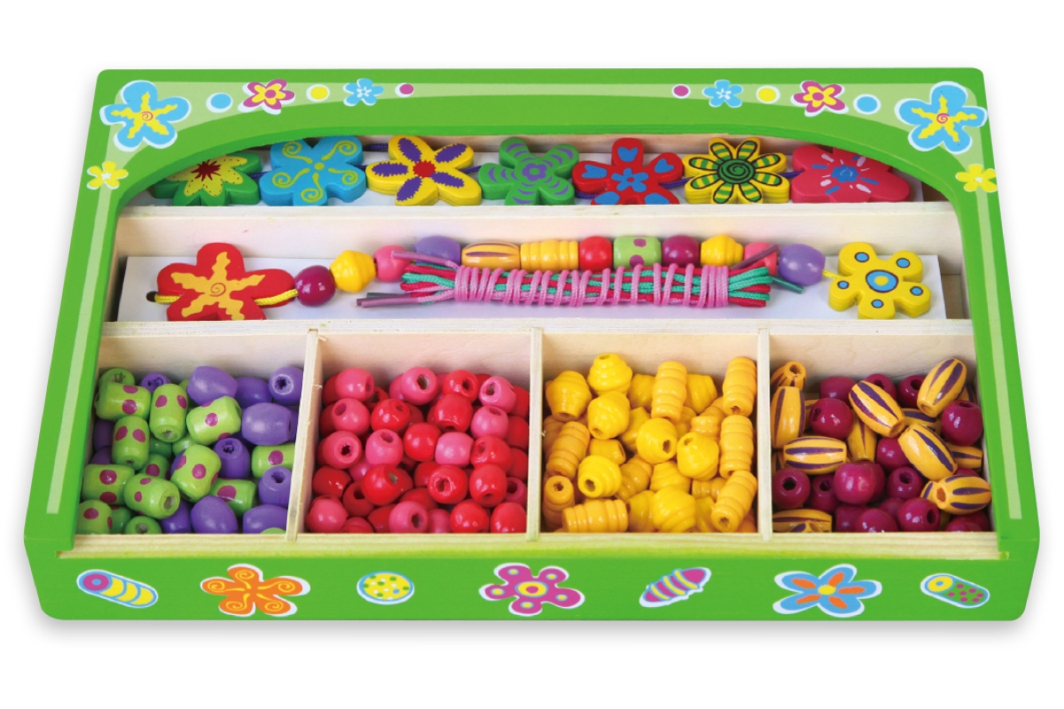 Dřevěná sada korálků. Rozměry balení cca 25 x 15,5 x 3,5 cm. Věk 3+..