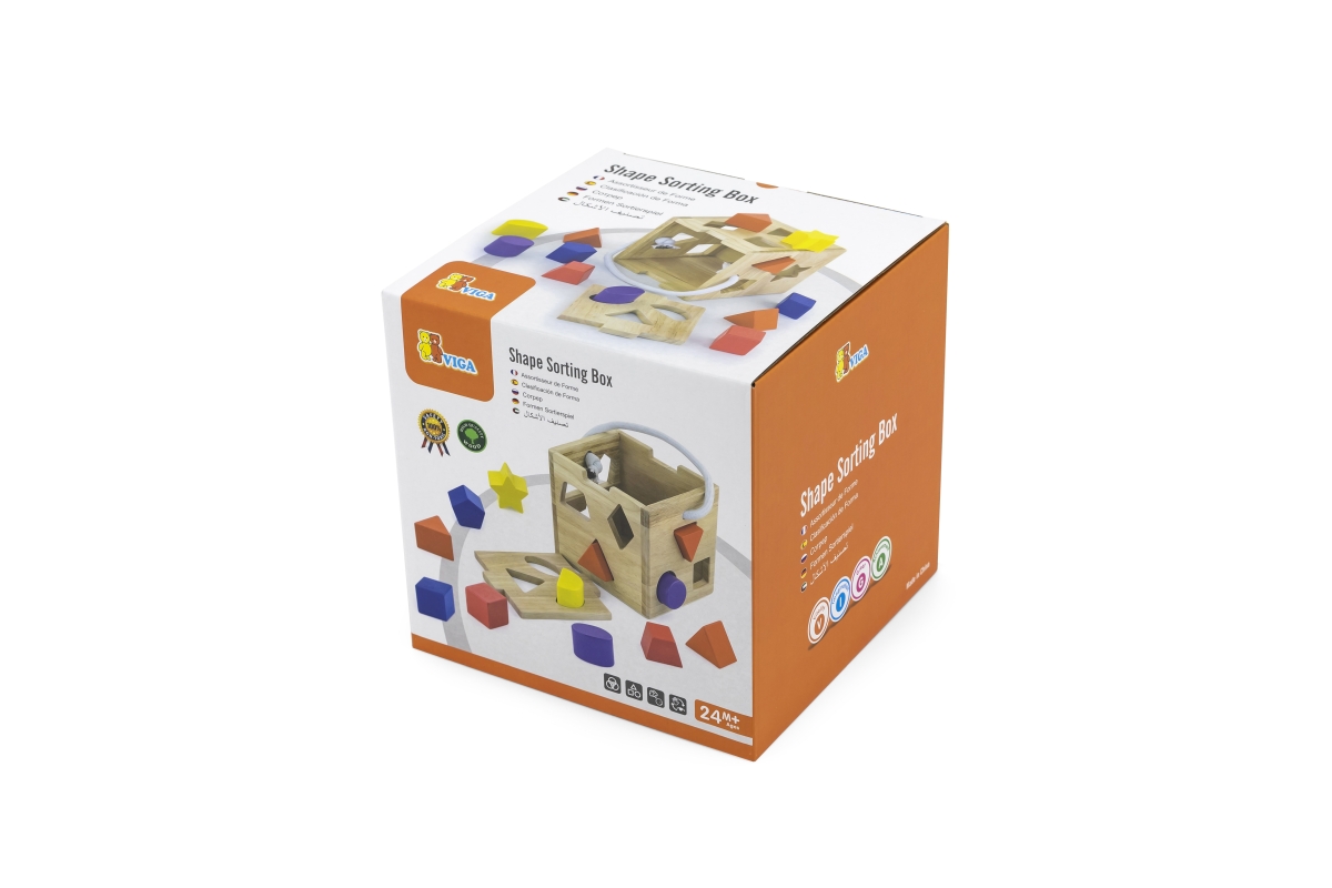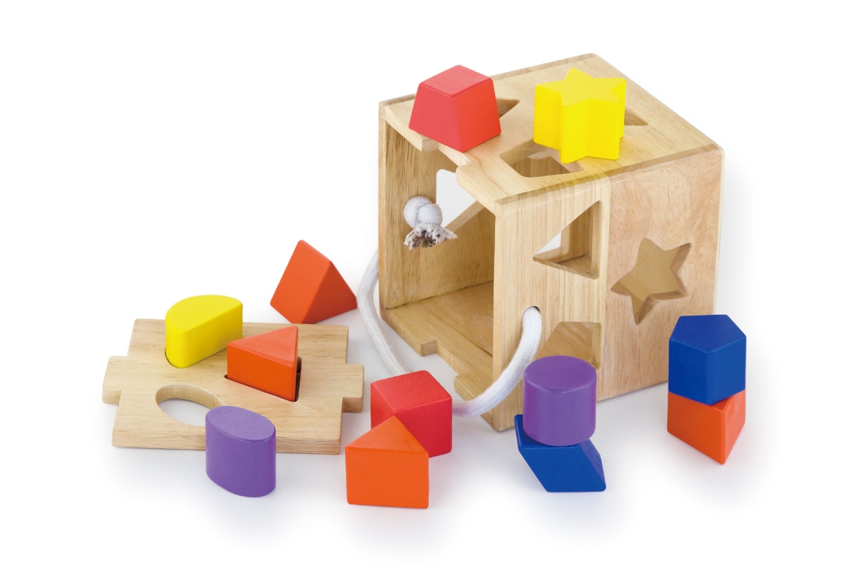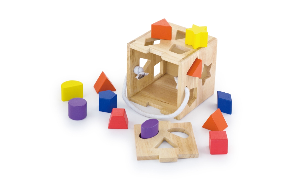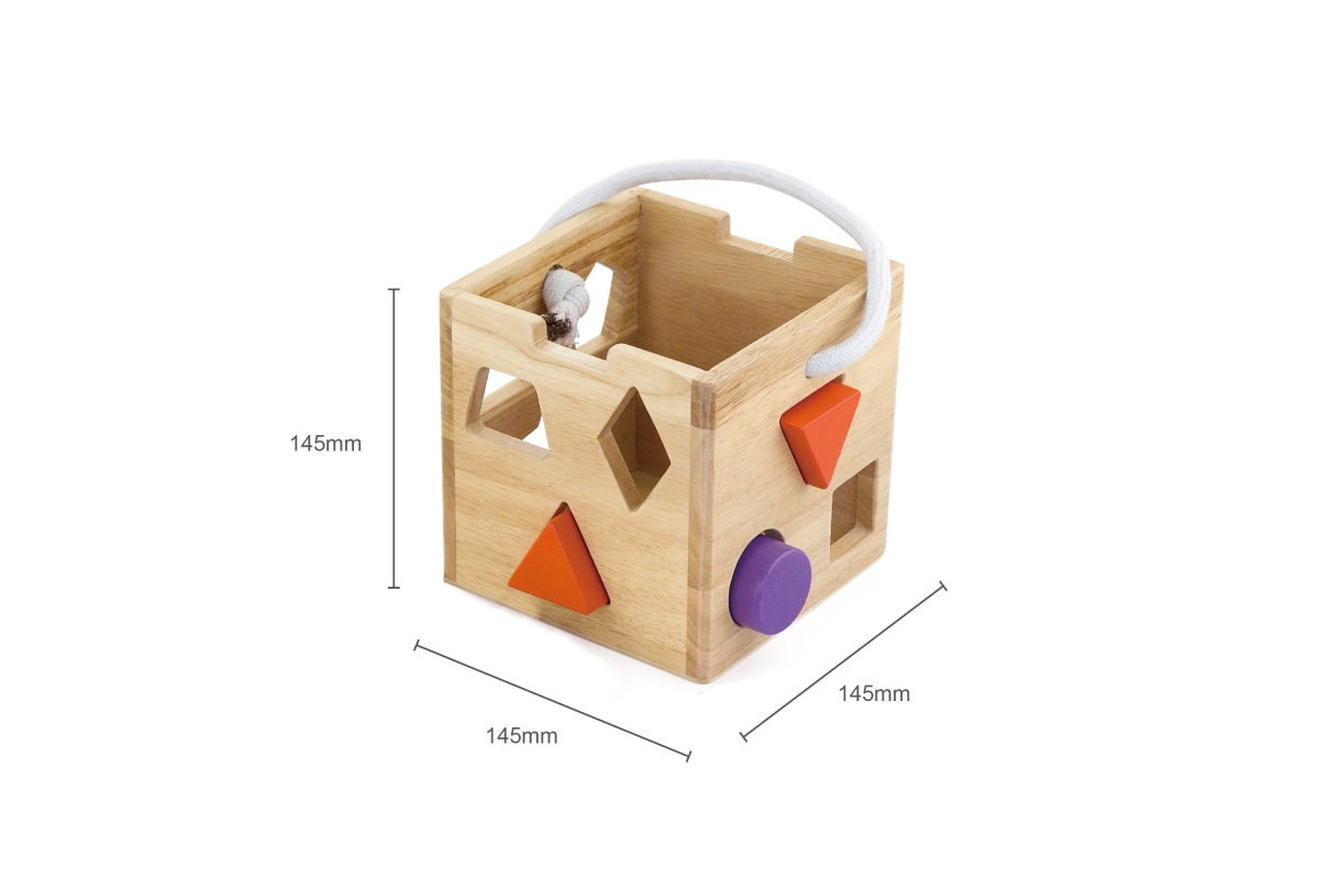 Dřevěná vkládačka kostka o rozměru cca 14,5 x 14,5 x 14,5 cm. Rozměry balení cca 19,5 x 20 x 19,5 cm. Věk 2+..