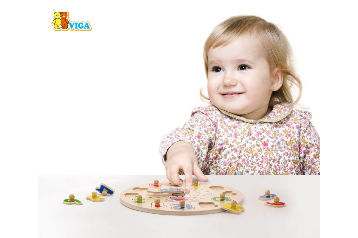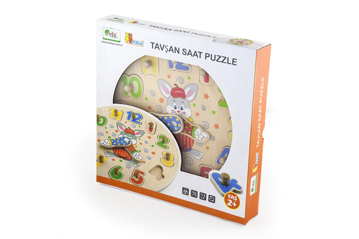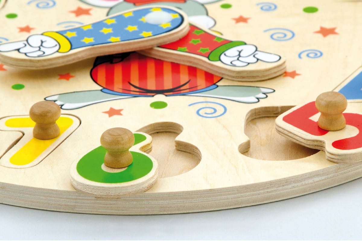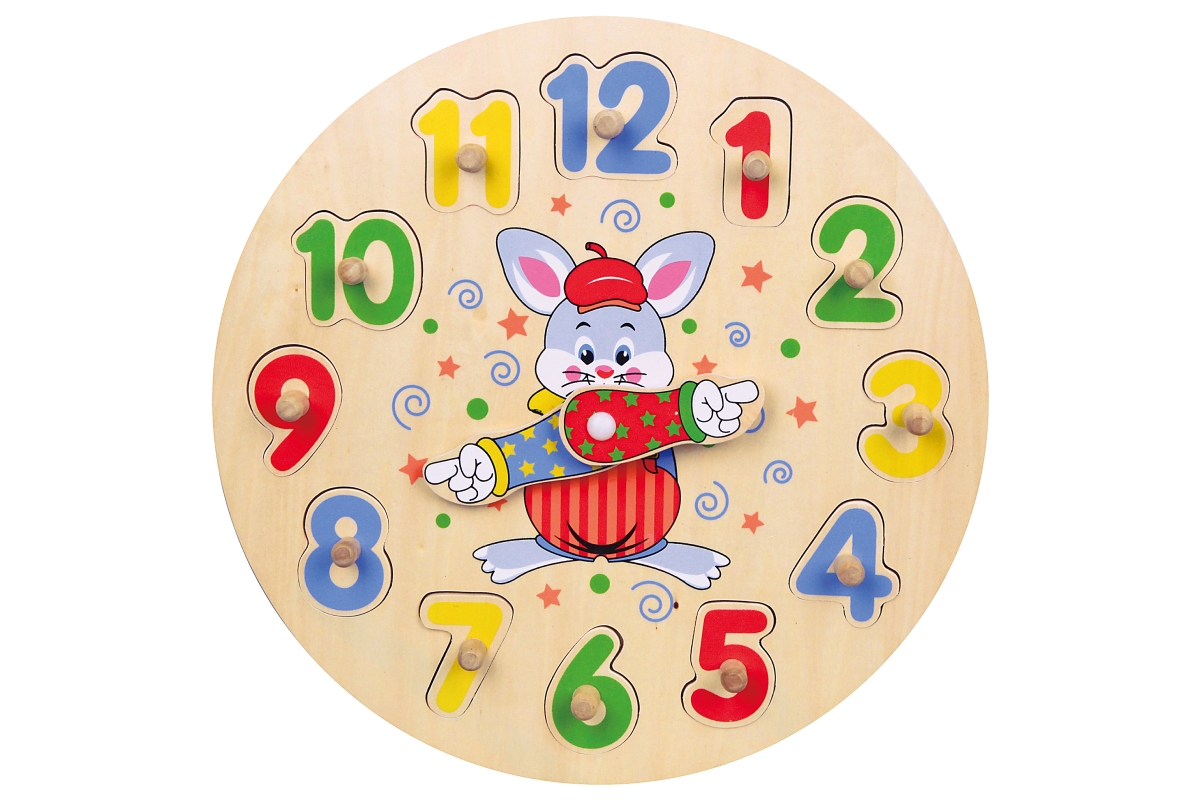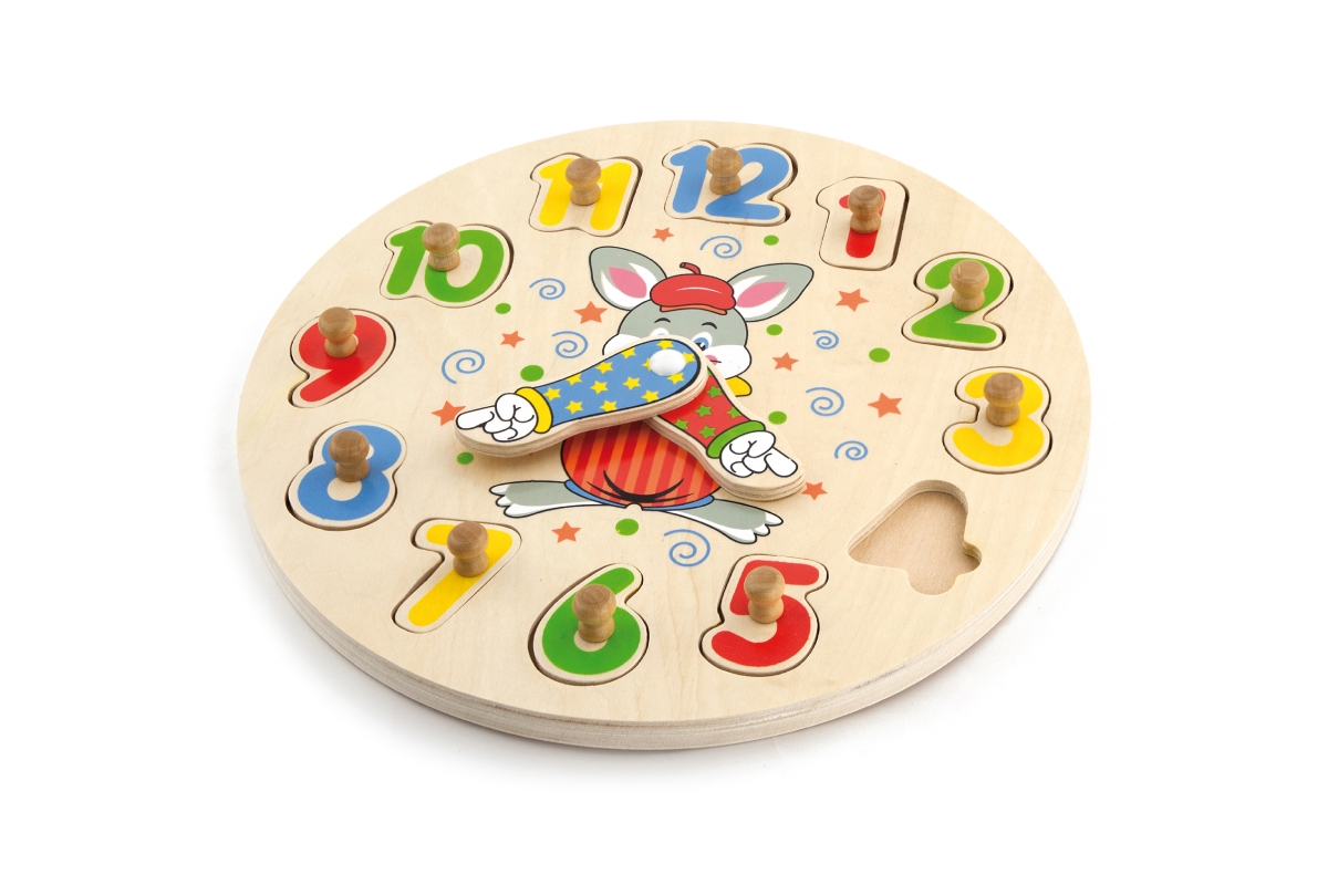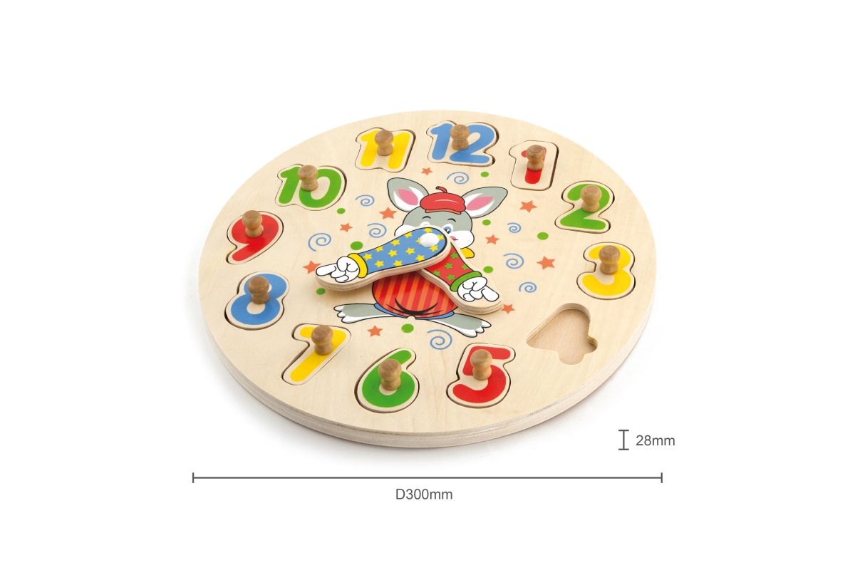 Dřevěné hodiny pro snadnou výuku. Hodiny slouží také jako vkládačka. Balení obsahuje 12 dílků. Rozměry cca 30 x 30 x 2 cm. Věk 24m+..