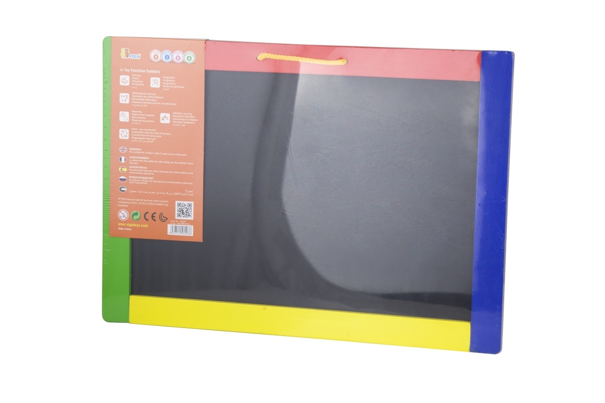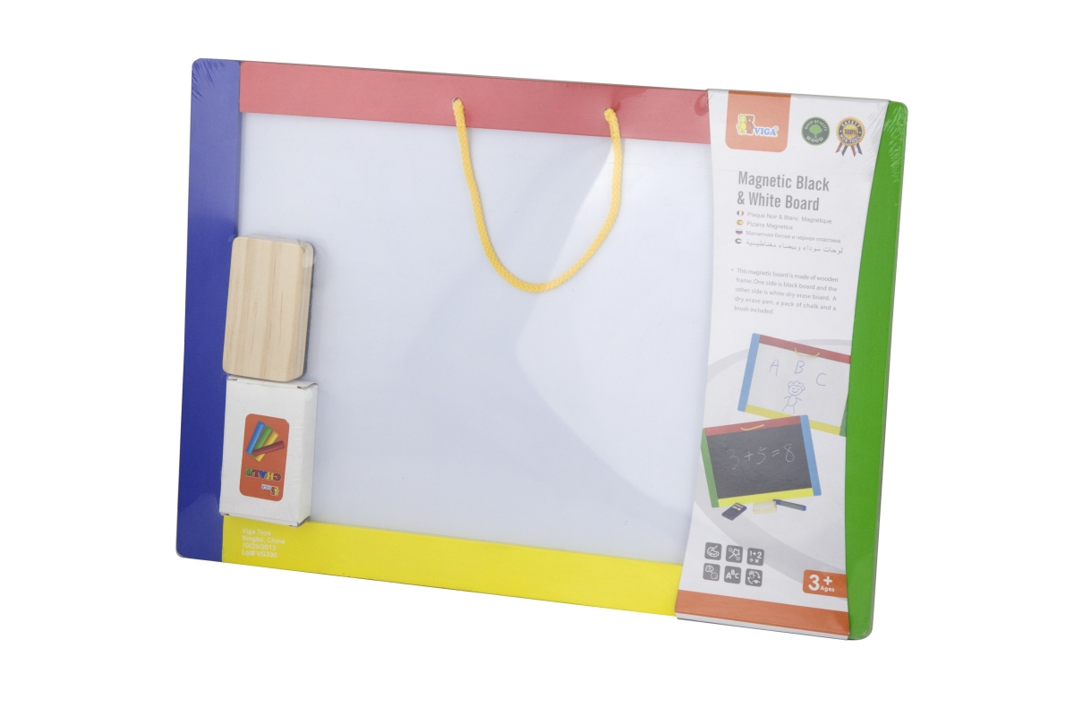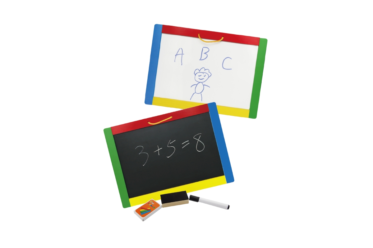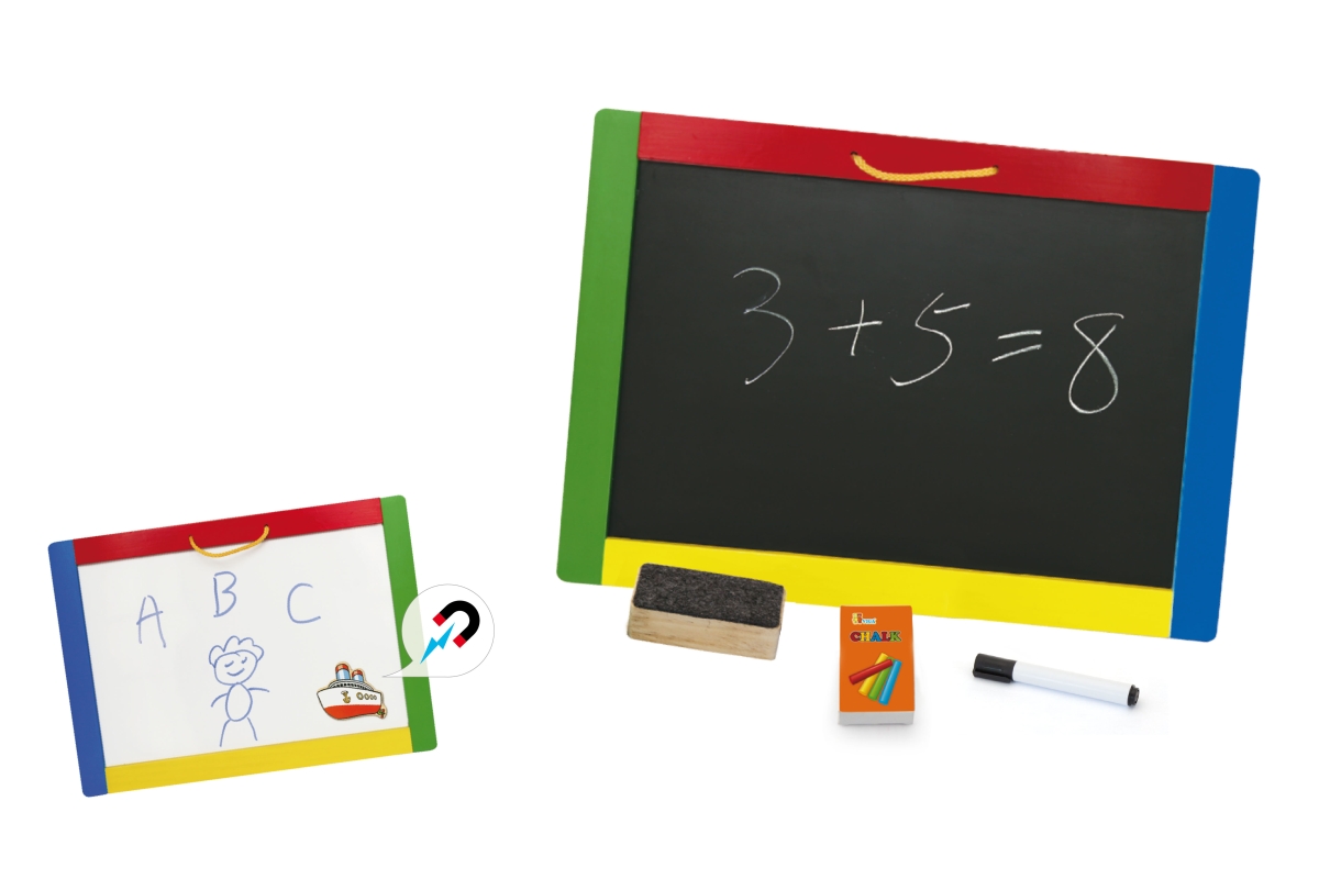 Dřevěná tabule o velikosti cca 42 x 30 x 1 cm. Z jedné strany je černá magnetická tabule, na kterou lze kreslit křídami a z druhé strany je bílá tabul..