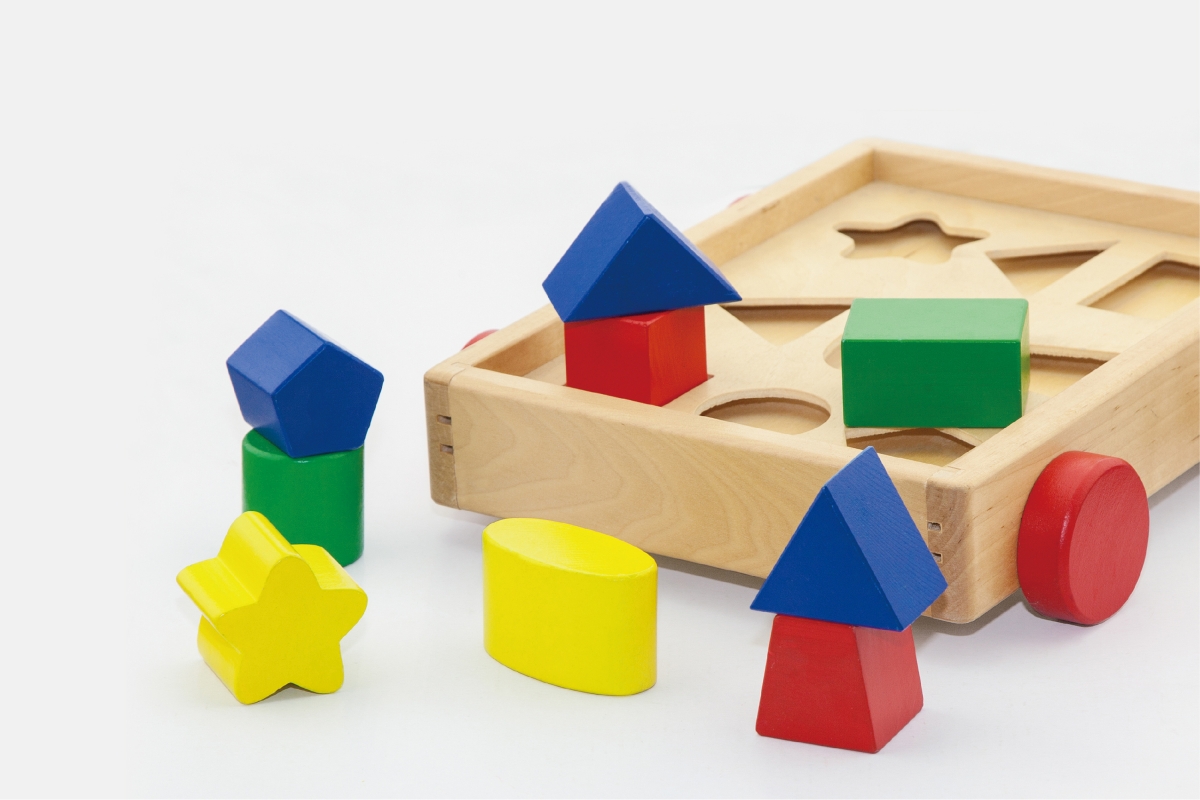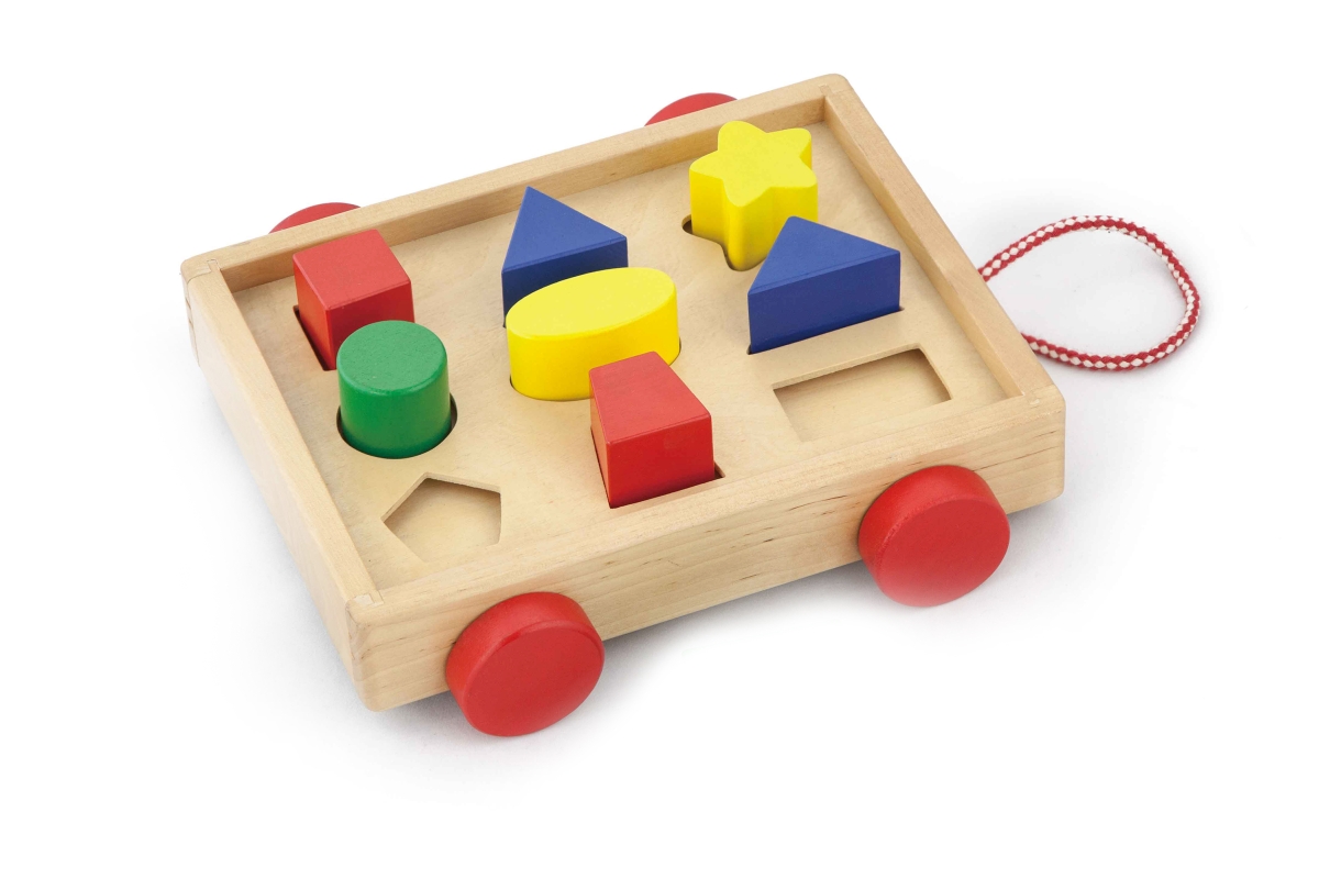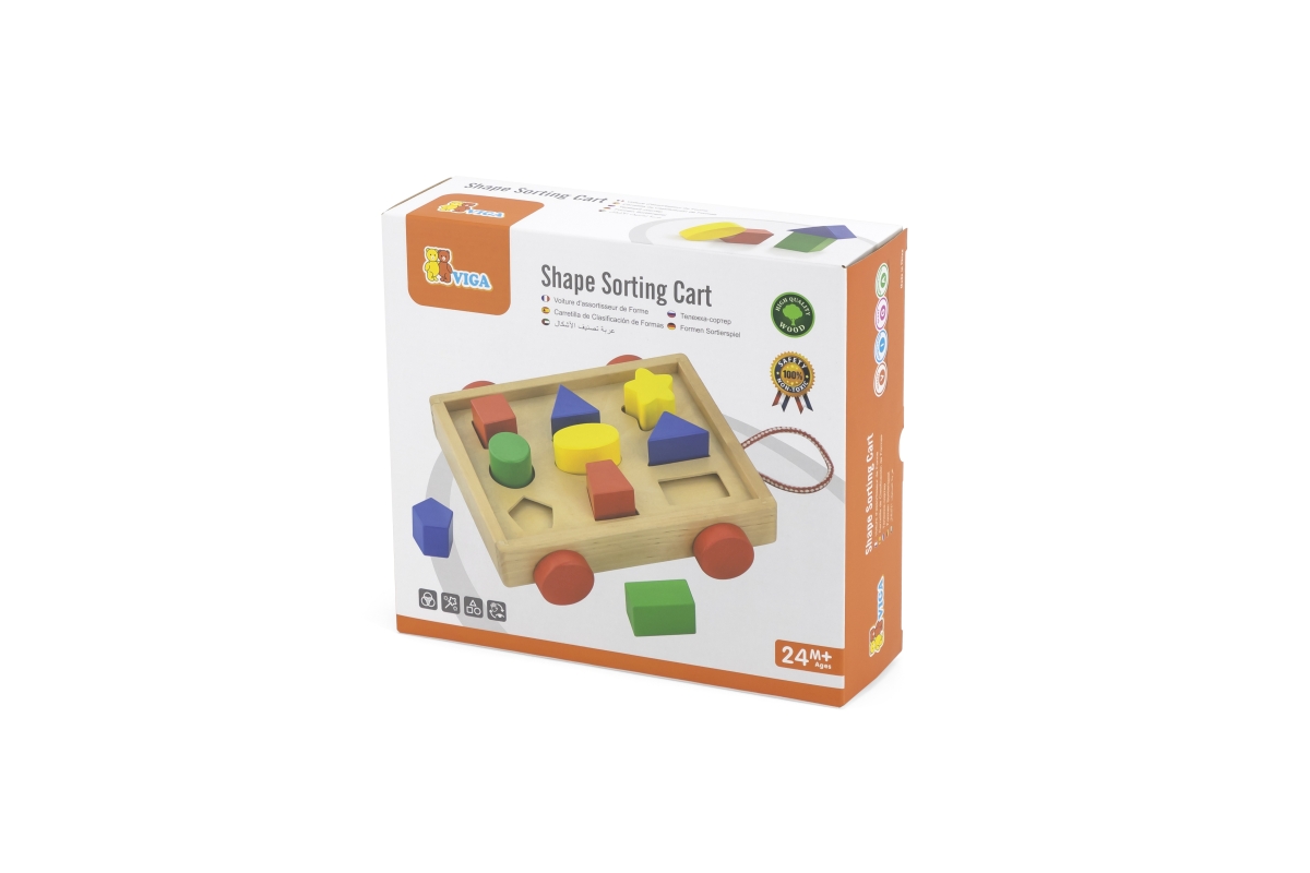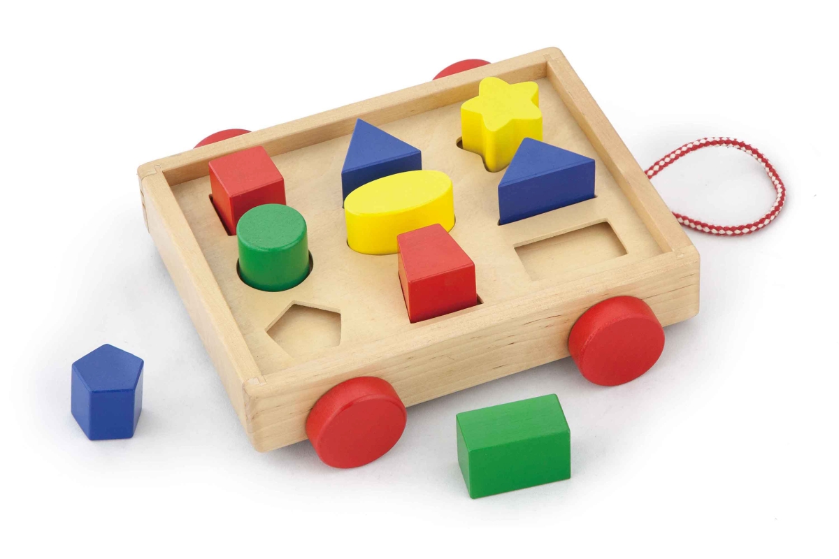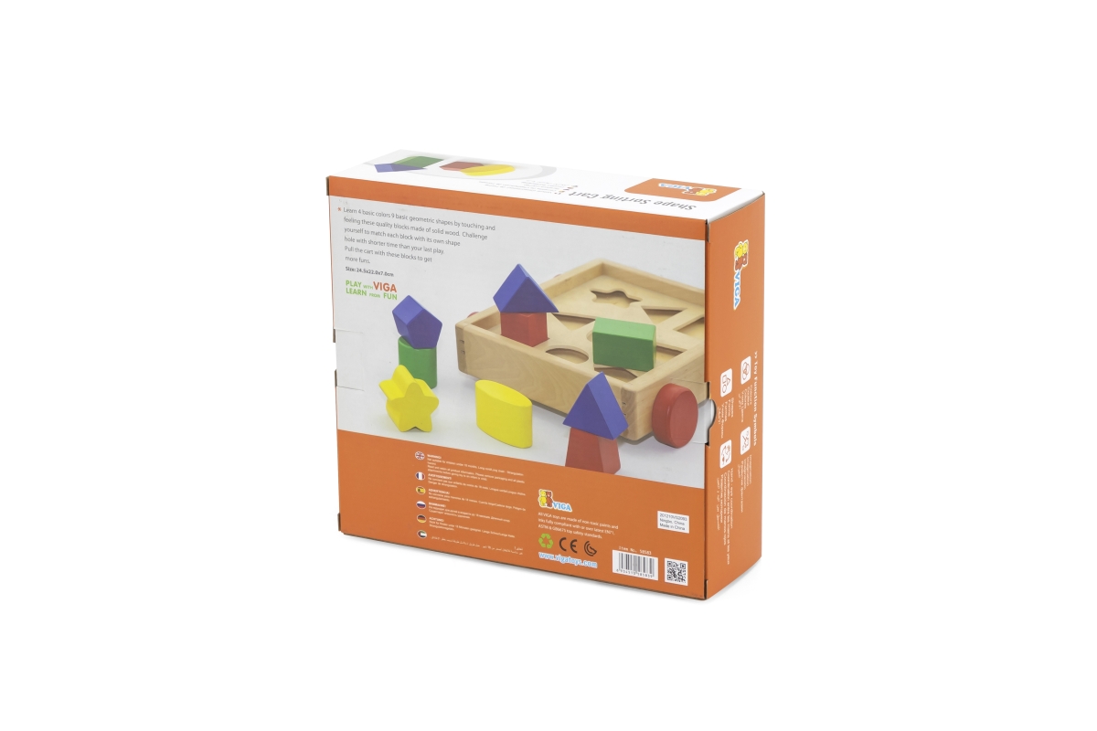 Dřevěná vkládačka - vozík. Balení obsahuje vozík o velikosti cca 24,5 x 22 x 7 cm a 9 kostek různých tvarů a barev na vkládání. Rozměry balení cca 25,..