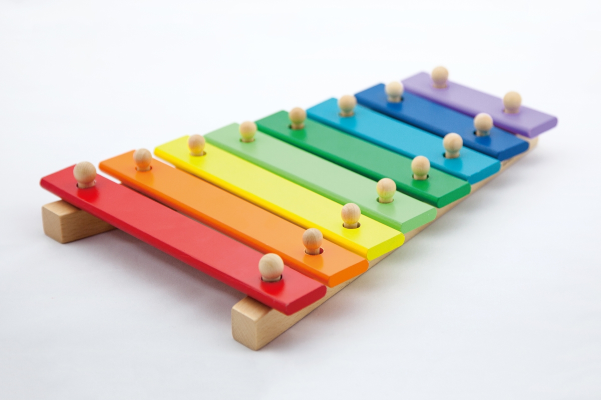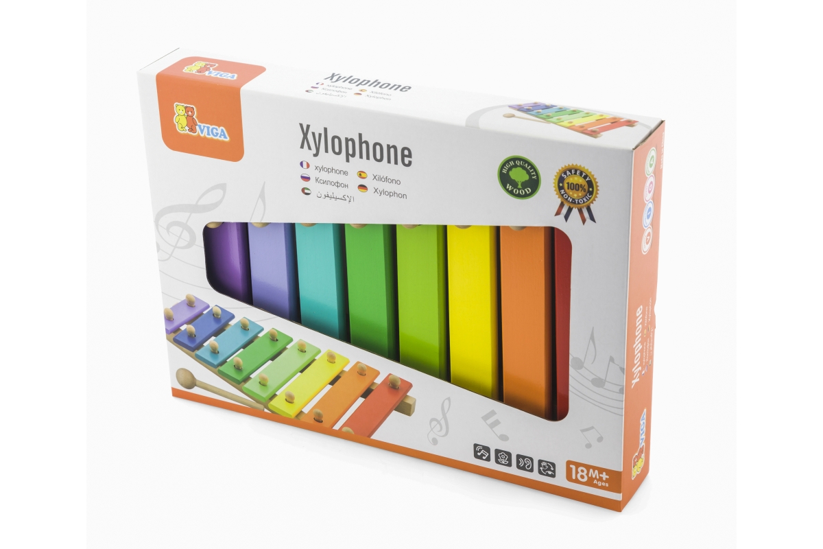 Dřevěný xylofon o rozměru cca 31 x 23 x 3,5 cm. Rozměry balení cca 32,5 x 23,5 x 5 cm. Věk 18m+..