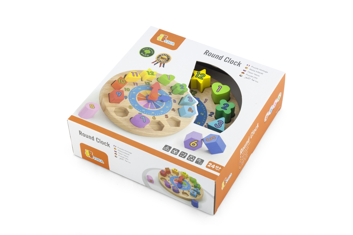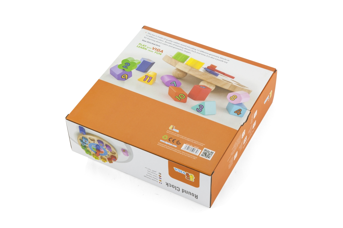 Dřevěné hodiny o velikosti cca 22 x 6 cm. Balení obsahuje 12 různých tvarů různých barev s čísly, které lze do hodin vkládat. Rozměry balení cca 28 x ..