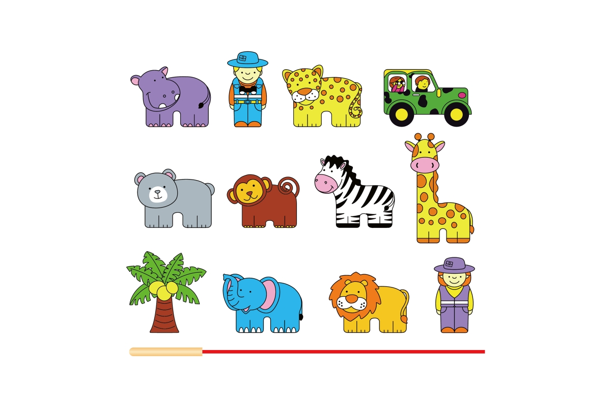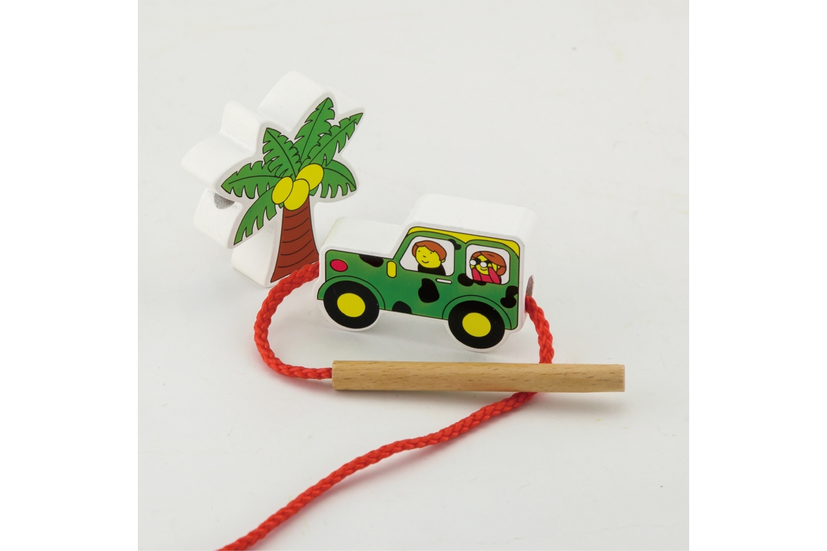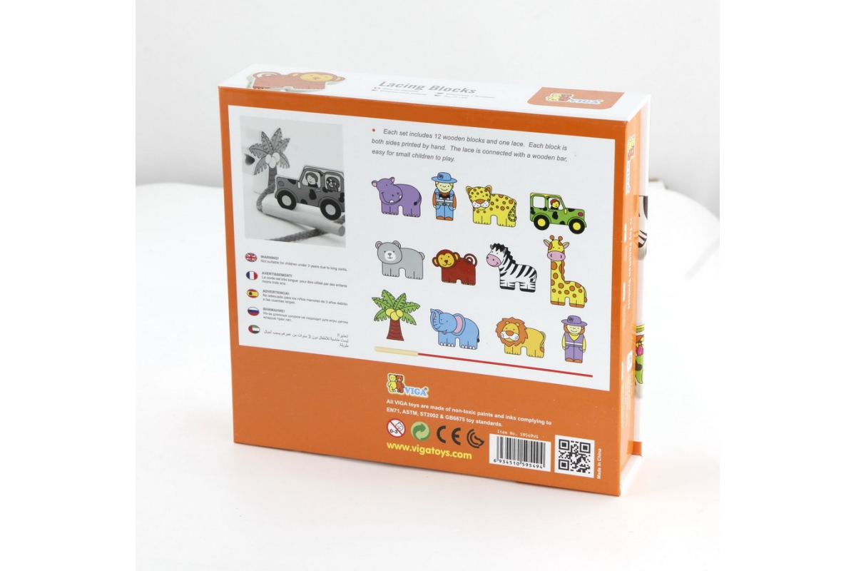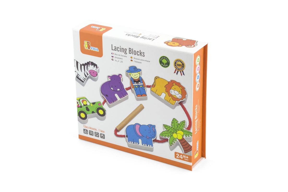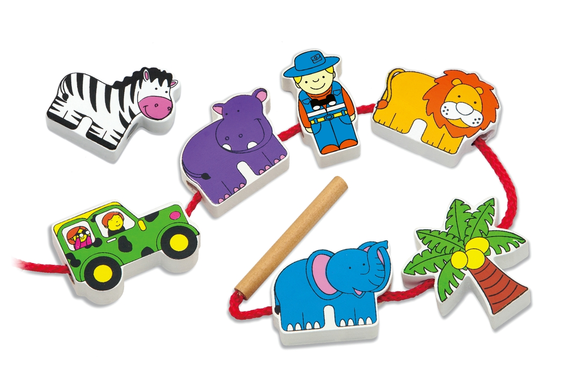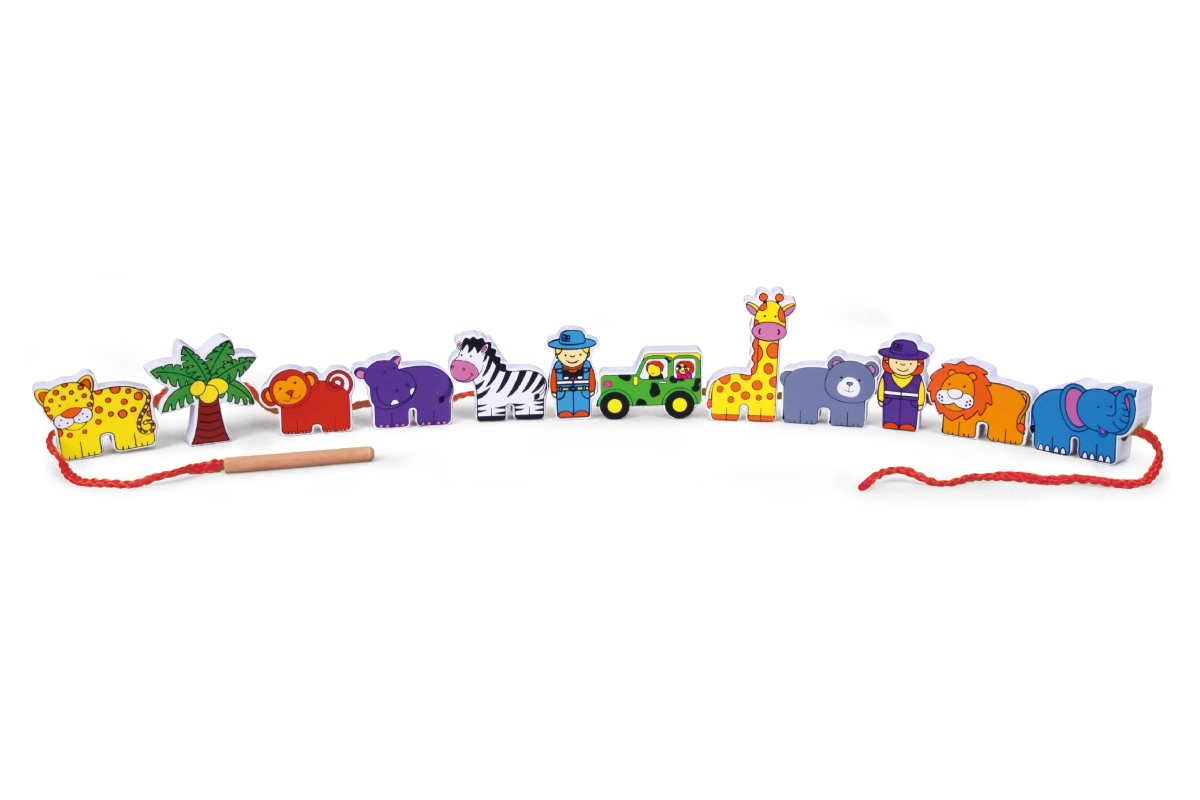 Dřevěné navlékání safari. Obsahuje 12 dřevěných bloků a 1 navlékací provázek. Baleno v krabičce, která slouží jako úschovný box. Rozměry balení cca 21..