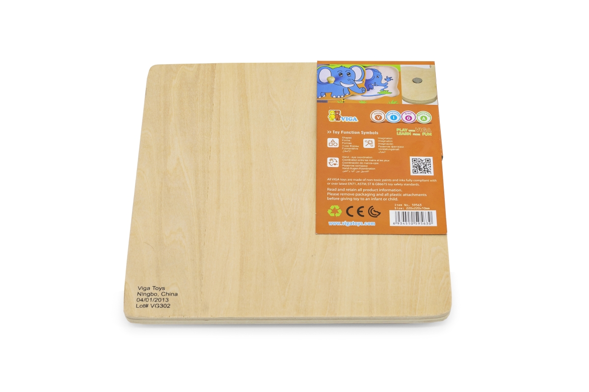 Dřevěná vkládačka se zvířátky. Rozměry dřevěné desky cca 22 x 22 cm. Rozměry balení cca 22 x 22 x 1 cm. Věk 12m+..