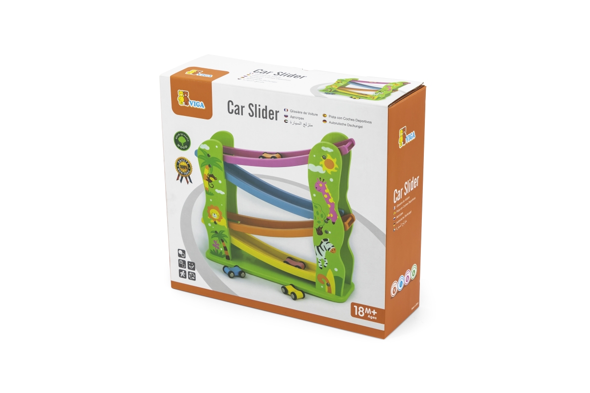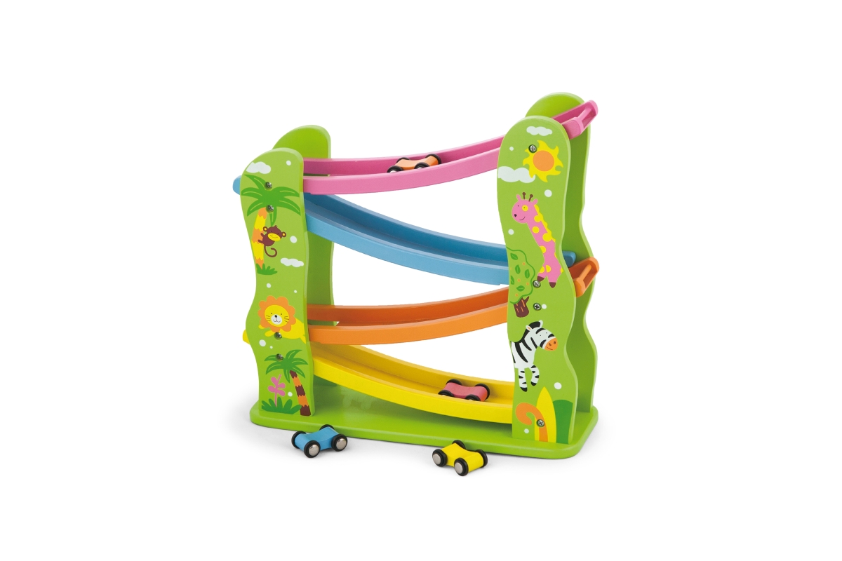 Dřevěná klouzačka s autíčky. Rozměry dráhy cca 31 x 29 x 10 cm. Rozměry balení cca 33 x 31 x 11 cm. Věk 18m+..