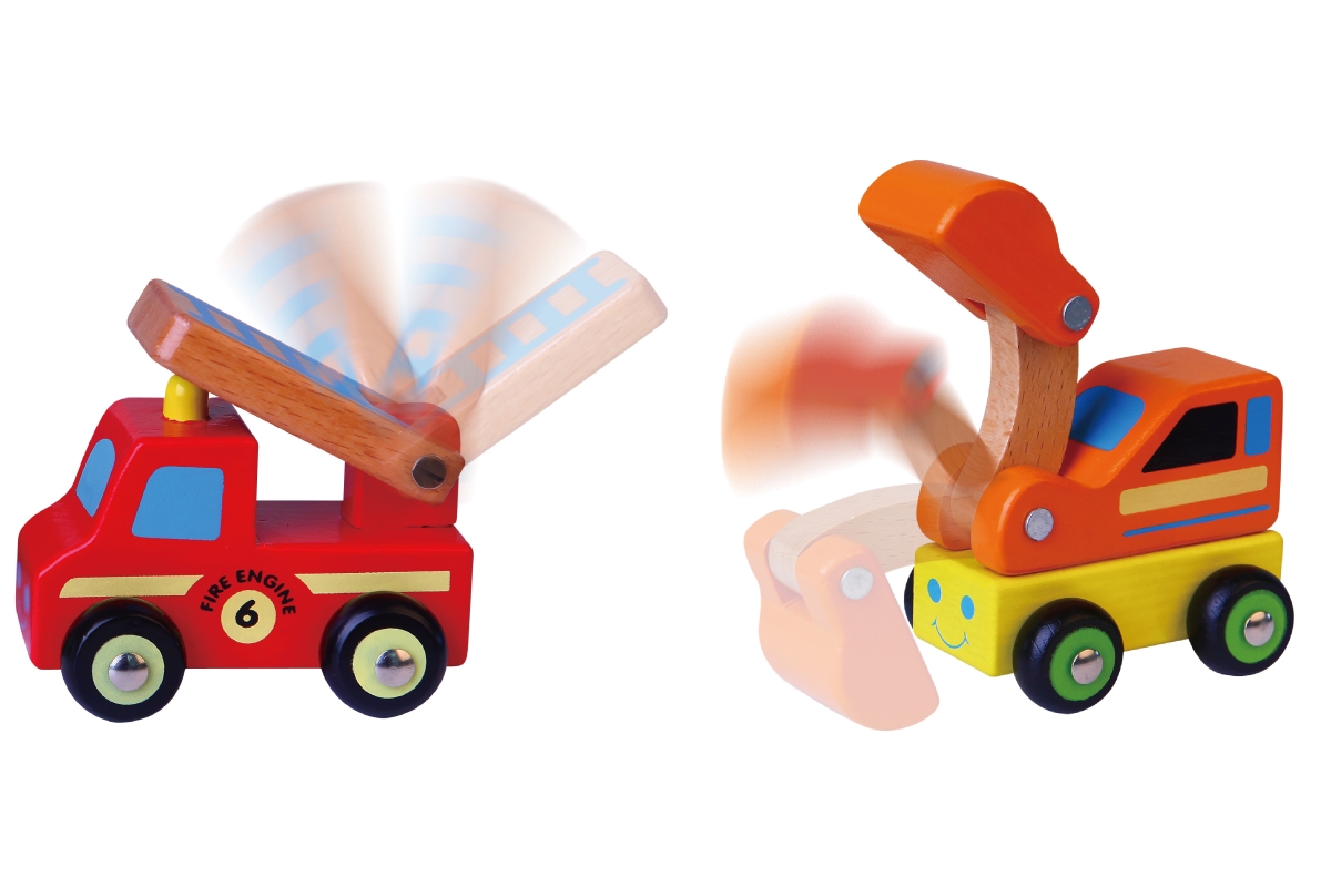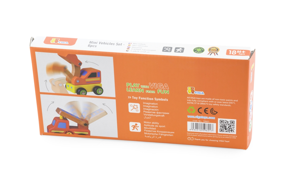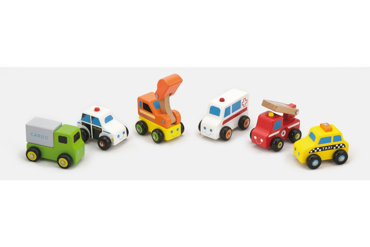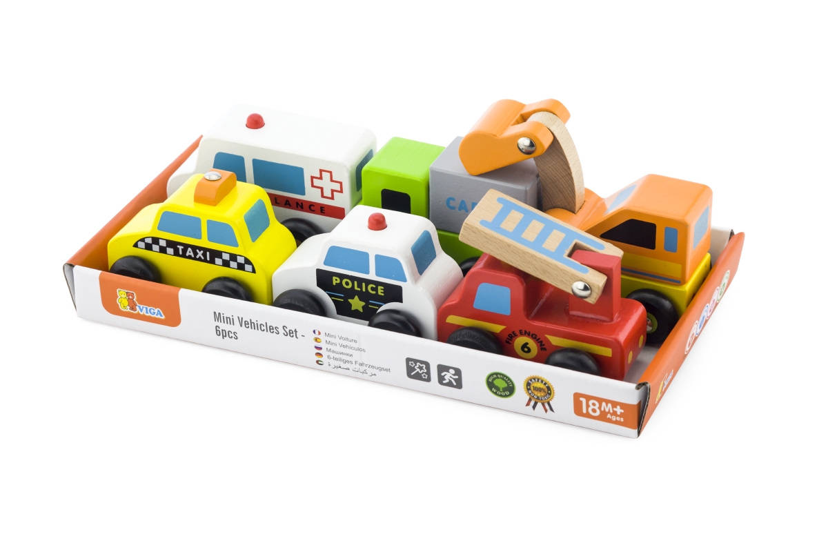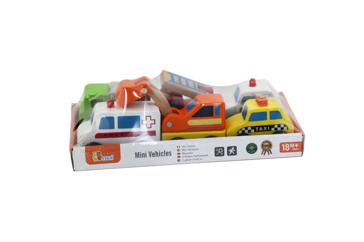Sada 6 ks dřevěných autíček - taxi,ambulance,bagr,policie,požární auto,nákladní auto.Rozměry auta cca 10 x 6 x 3 cm (dle druhu). Rozměry balení cca 25..