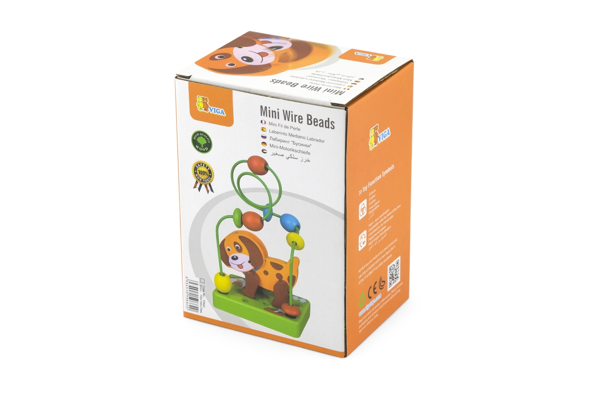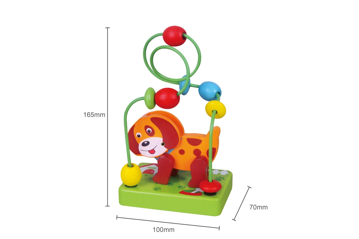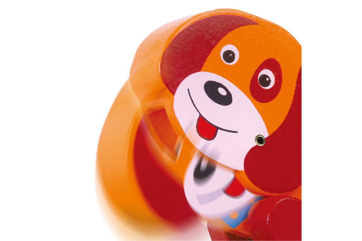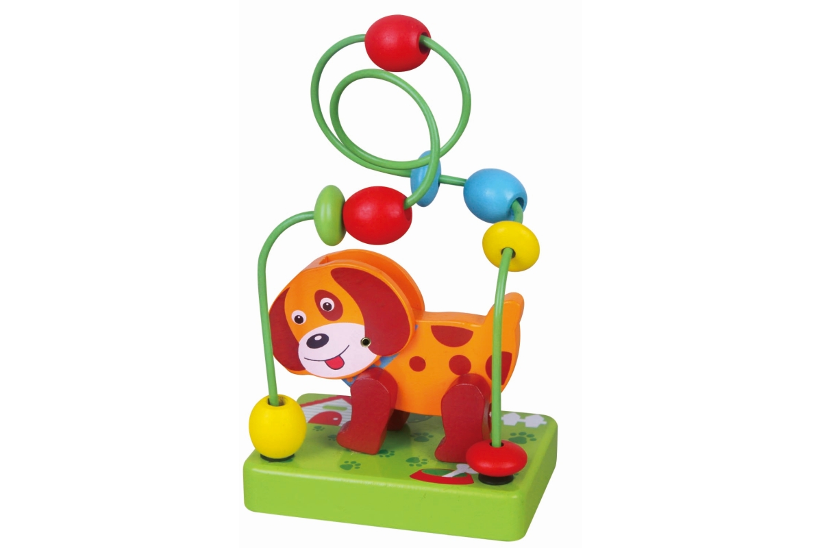 Dřevěný labyrint s pejskem. Pejsek má ohýbací hlavičku. Rozměry labyrintu cca 10 x 7 x 15 cm. Rozměry balení cca 17 x 9 x 12 cm. Věk 2+..