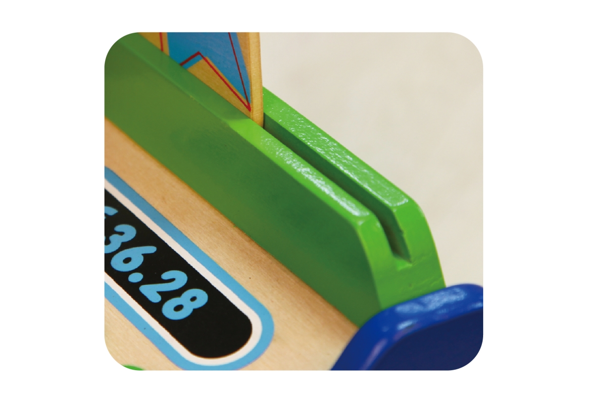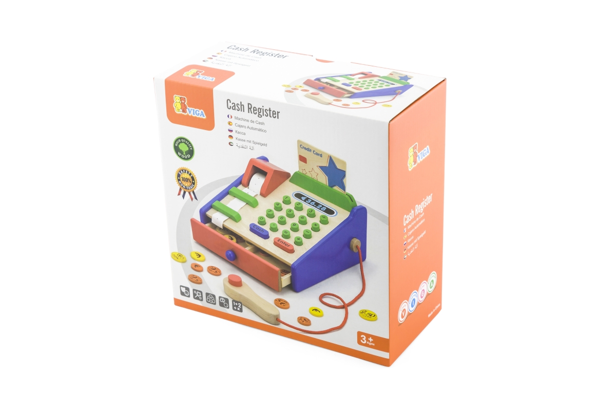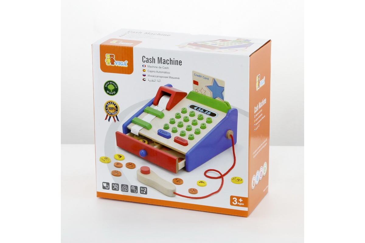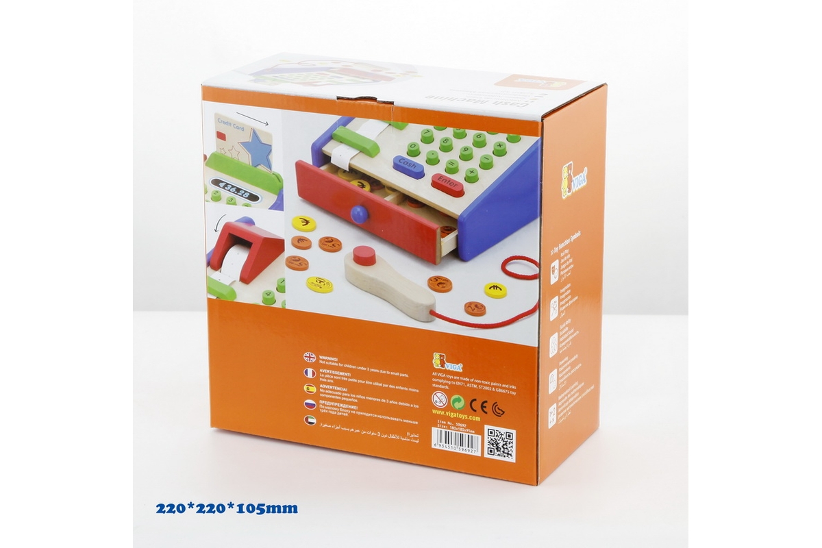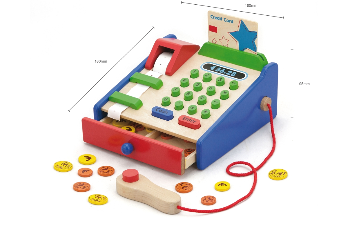 Dřevěná pokladna o rozměru cca 18 x 18 x 9 cm. Obsahuje pokladnu se skenerem a papírovými štítky, 40 dřevěných mincí a kreditní kartu. Rozměry balení ..