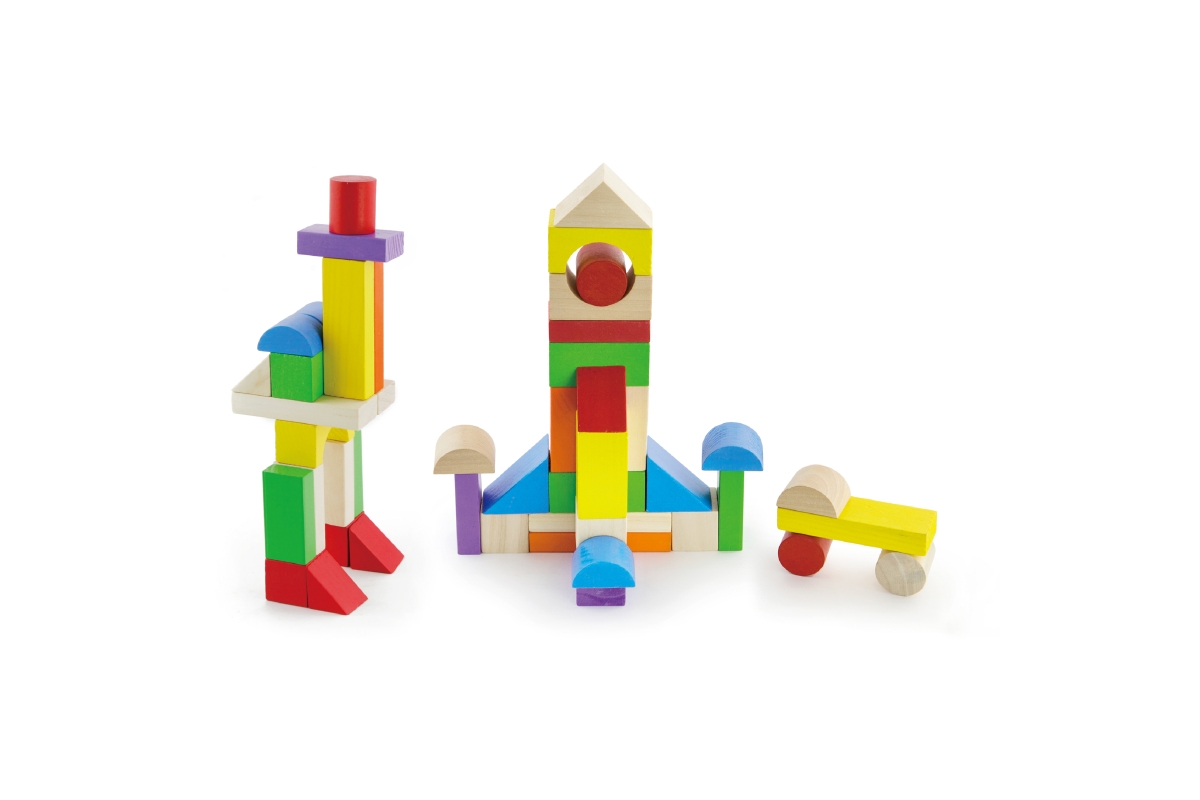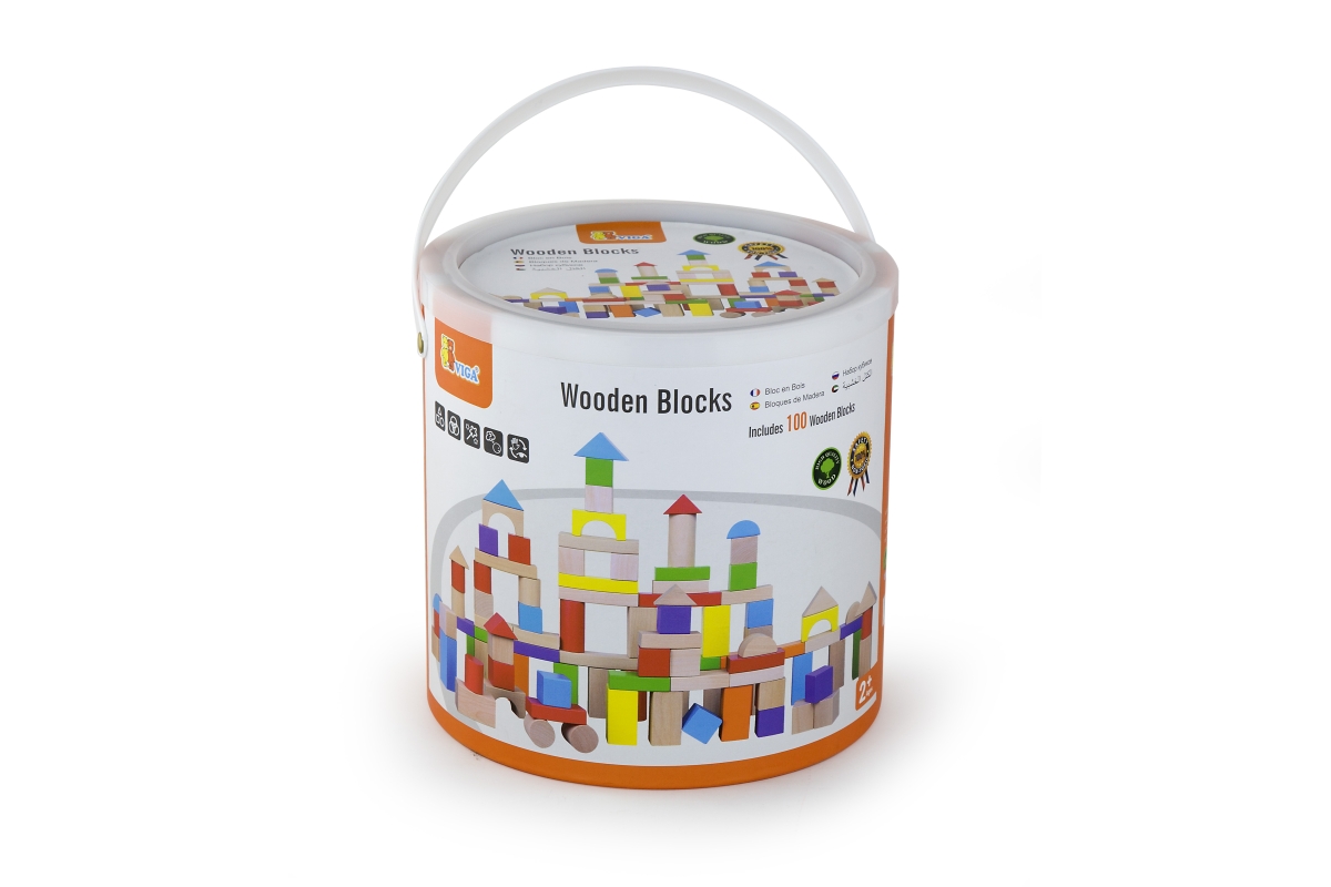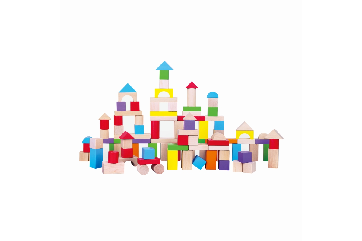 Dřevěná stavebnice v kyblíku. Obsahuje 100 dílků a obrázkovou brožuru s návody na stavění. Rozměry balení cca 22,5 x 22 cm. Velikost kostek 2,5 - 7,5 ..