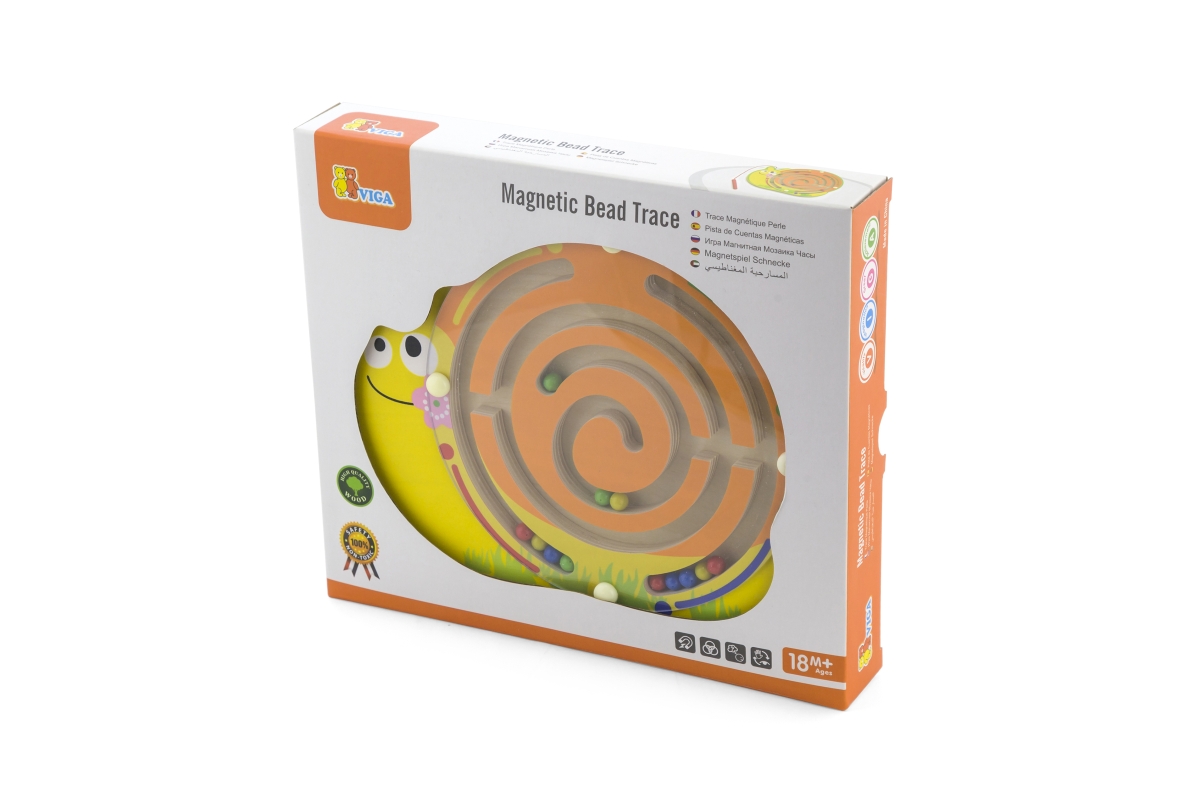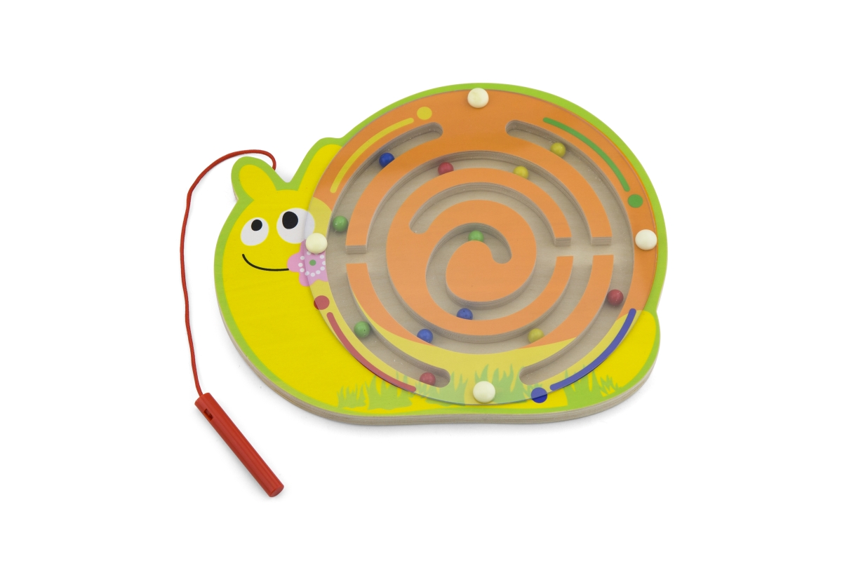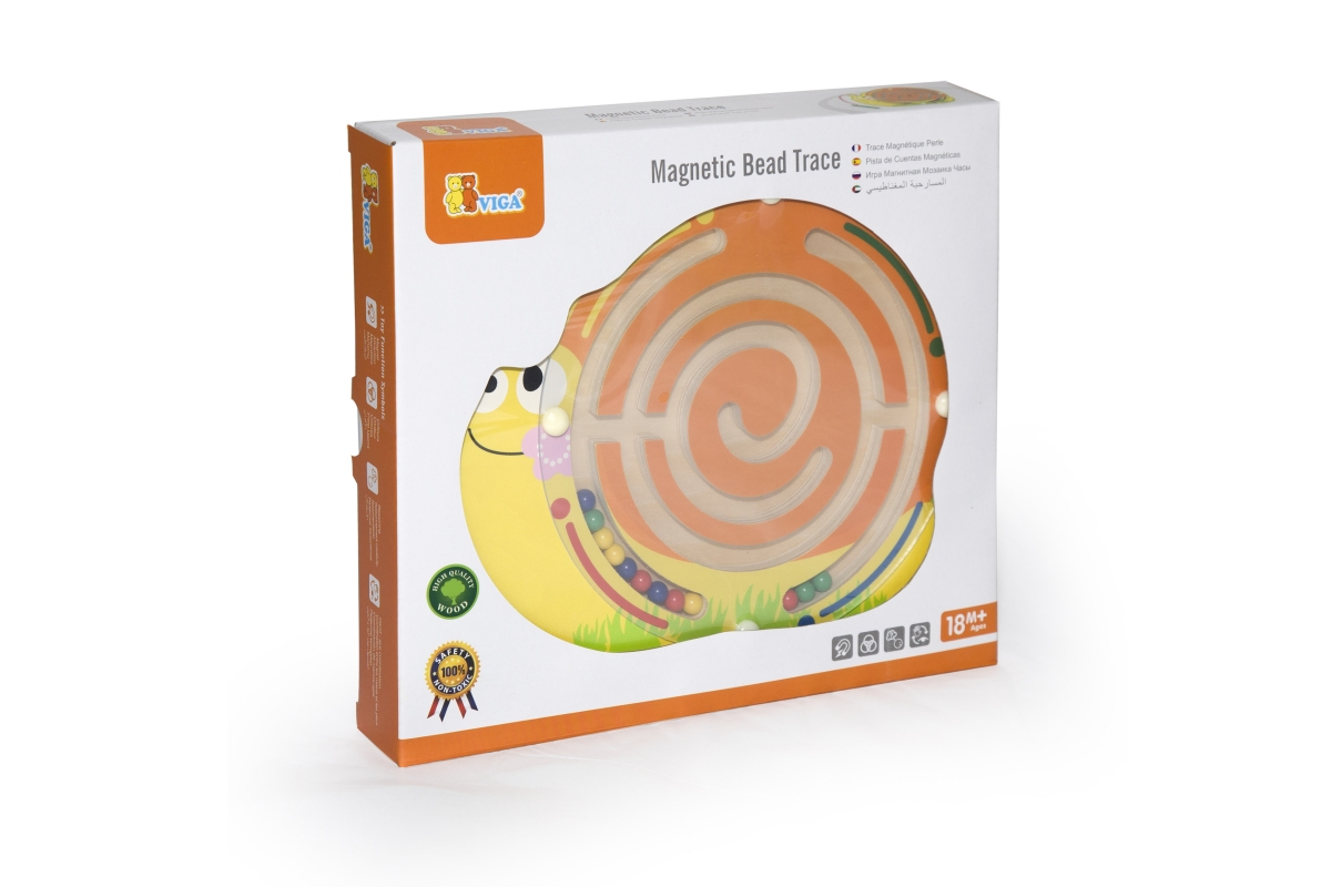 Dřevěný magnetický labyrint s kuličkami ve tvaru šneka. Rozměry cca 21,5 x 19 cm. Rozměry balení cca 25 x 22 x 4 cm. Věk 18m+..