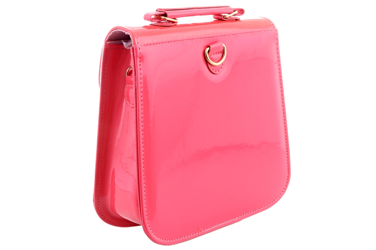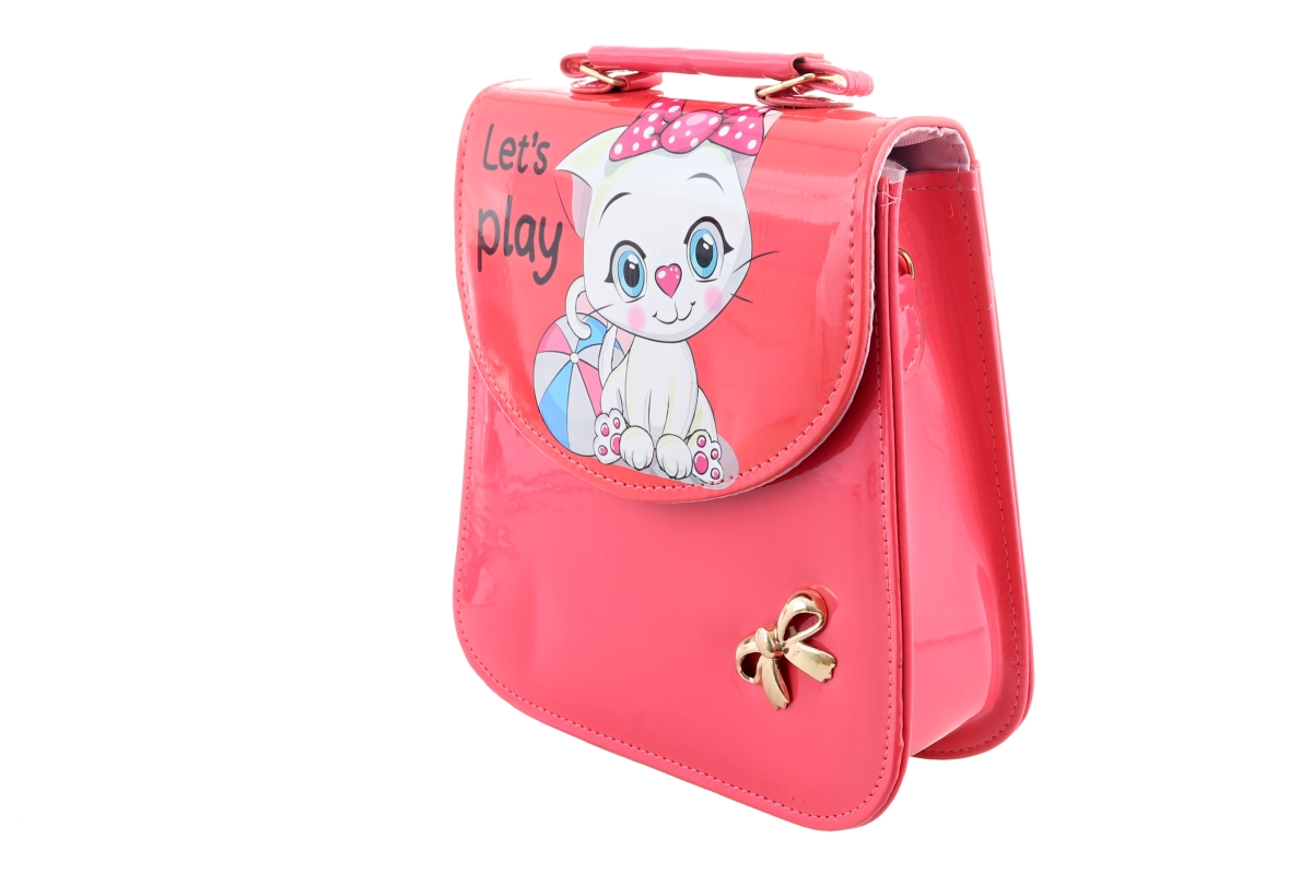 Kabelka s motivem kočičky. Lesklý materiál. Lze nosit v ruce nebo přes rameno. Zapínání na druk - kabelka má jednu velkou kapsu. Rozměry kabelky 20x21..