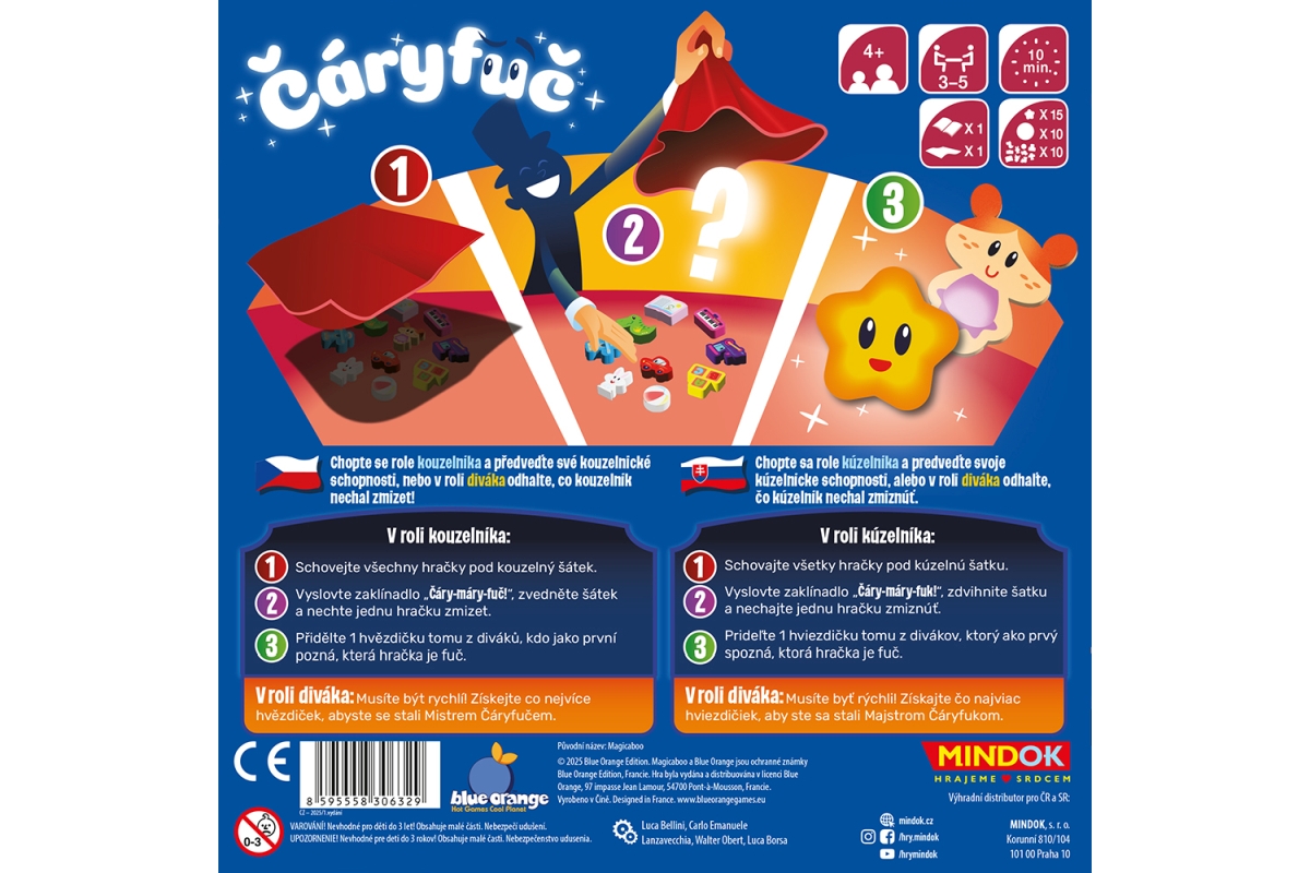 Připravte se na největší kouzelnickou show roku! V deskové hře Čáryfuč se všichni kouzelníci z celé země sjíždějí na každoroční Mistrovství mágů. Abyste vyhráli, budete muset předvést nejpůsobivější trik a zároveň mít oči na stopkách, abyste prokoukli triky soupeřů! Cílem hry je bedlivě sledovat průběh kouzelnického triku a jako první odhalit hračku, která zmizela. Kdo získá nejvíce hvězdiček, stává se novým Mistrem Čáryfučem! Hra obsahuje 10 dřevěných hraček, 10 obrázků hraček (z líce hračka, z rubu mráček), 1 kouzelný šátek a 15 hvězdiček. Určeno pro 3-5 hráčů. Věk 4+