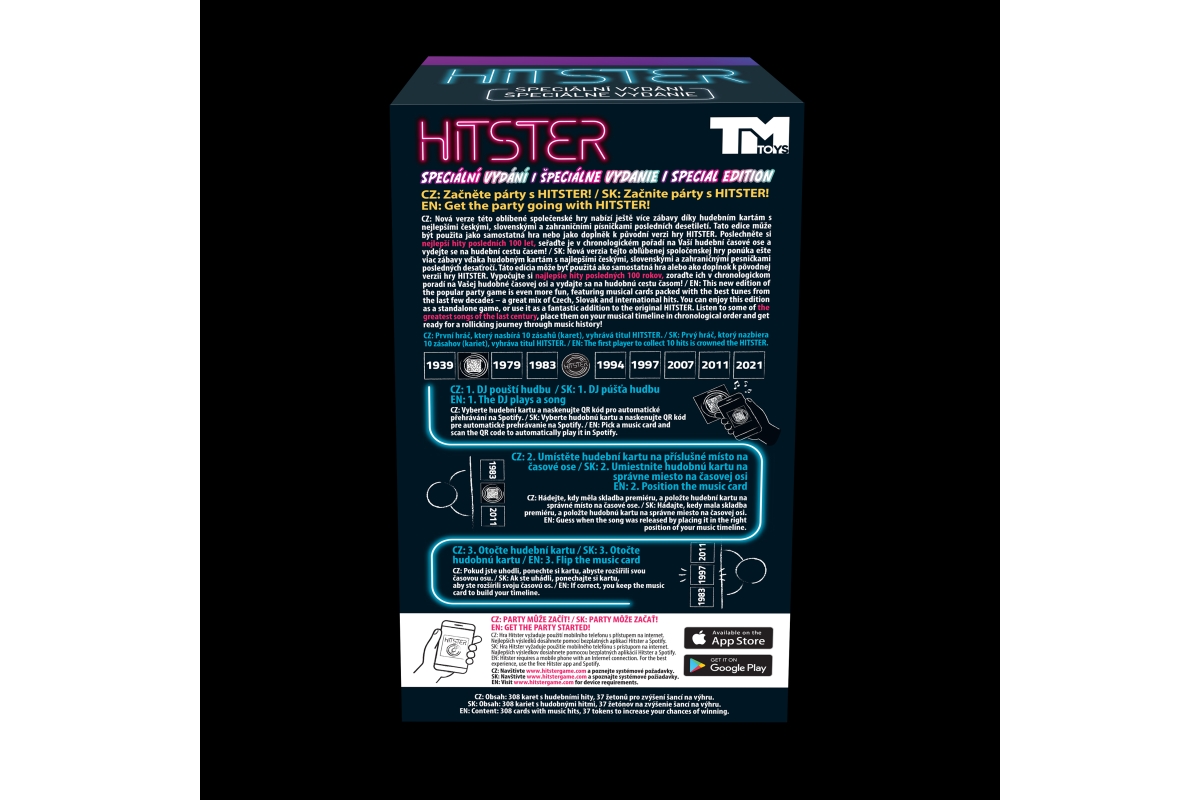 Poslouchejte nejlepší hity za posledních 100 let, střídavě je umístěte v chronologickém pořadí na časové ose hudby a vydejte se na hudební cestu časem. První hráč, který uloží 10 karet v časové ose vyhrává. Vyberte kartu, po naskenování QR kódu se hudba automaticky přehraje na Spotify. Hádejte, kdy měla skladba premiéru, a položte hudební kartu na správné místo na časové ose. Pokud jste uhodli správně, ponechte si kartu, abyste rozšířili svou časovou osu. Určeno pro 2-10 hráčů. Věk 16+