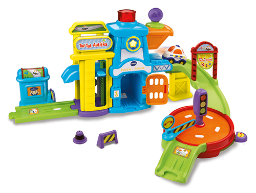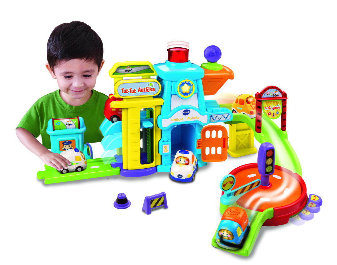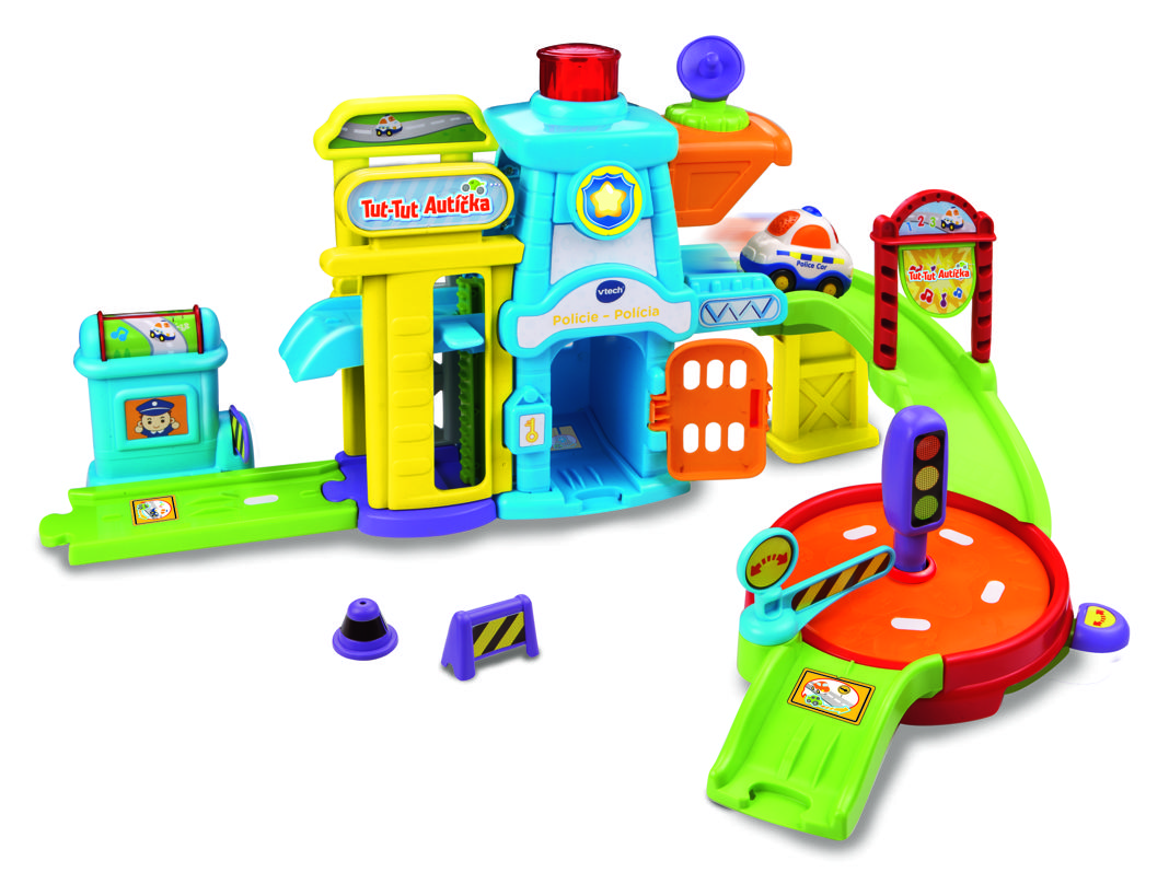 Interaktivní hračka s jedním Tut Tut mluvícím autíčkem – policie.Policejní stanice umožňuje: sestavit desítky různých variant budovy a cest, povídání a různé reakce Tut Tut autíček na pěti různých místech dráhy pomocí SmartPoint bodů, otevírání dveří od vězení a otáčet radarem, zvedat závoru a používat výtah pro autíčka Tut Tut (podporuje rozvíjení jemné motoriky). Používání policejního alarmu, umisťovat přenosné dopravní značení, používat kruhový objezd se semaforem, autíčko zná desítky roztomilých frází, zazpívá 3 písničky a zahraje 6 melodií. Rodiče také ocení vysokou odolnost hračky proti mechanickému poškození i například automatické vypínání hračky, což zajistí vyšší životnost baterie. 2xAAA baterie je součástí výrobku.
