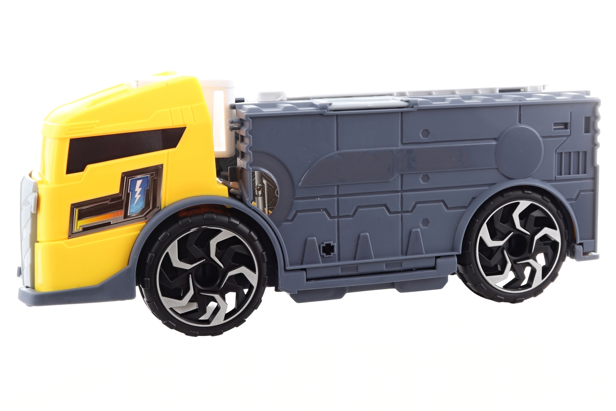 Rozkládací stavební auto - lze rozložit na stavební základnu. V balení 2 malá stavební auta. Materiál plast. Auto je na volný chod. Rozměry auta 34x12..
