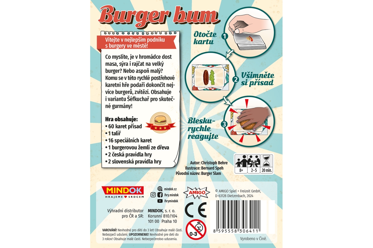 Staňte se mistrem rychlého skládání burgerů ve svižné karetní hře Burger Bum. Skládejte burgery na talíř a buďte první, kdo správně rozpozná, kdy je hotovo, chňapne žemli a dokončí kolo. Vyhrává ten, kdo má na konci hry nejvíce karet ve svém balíčku. Podaří se vám porazit ostatní kuchaře a vydělat si na nejvíce zakázkách? Určeno pro 2-5 hráčů. Věk 8+